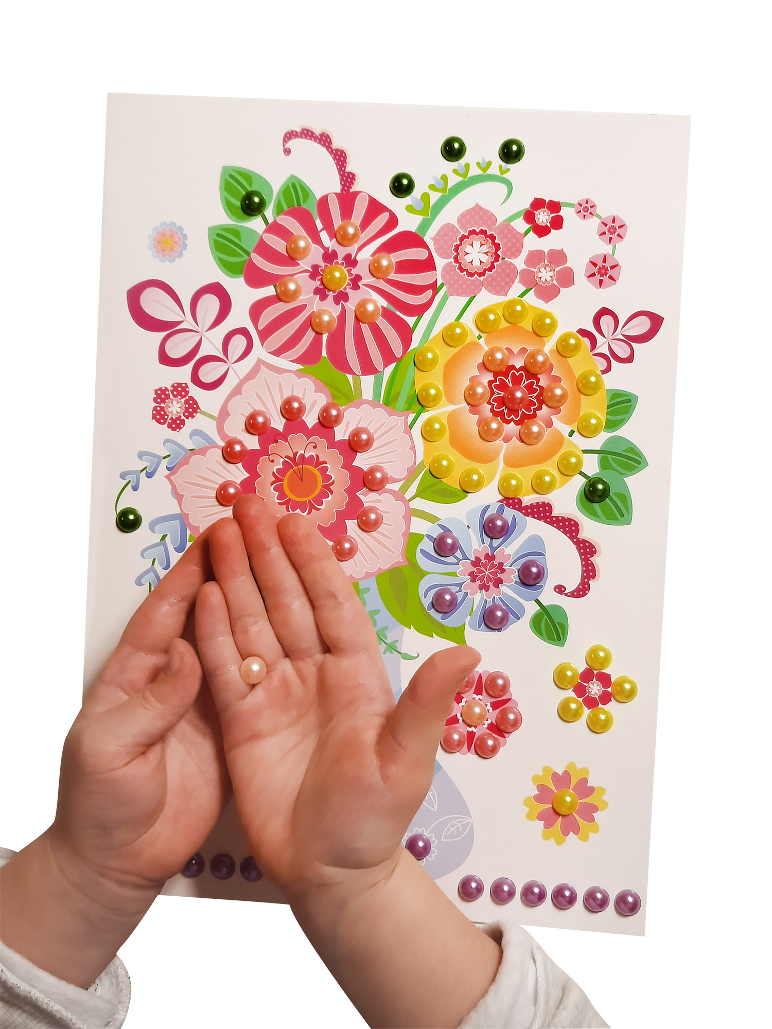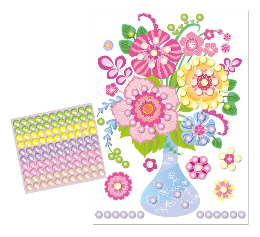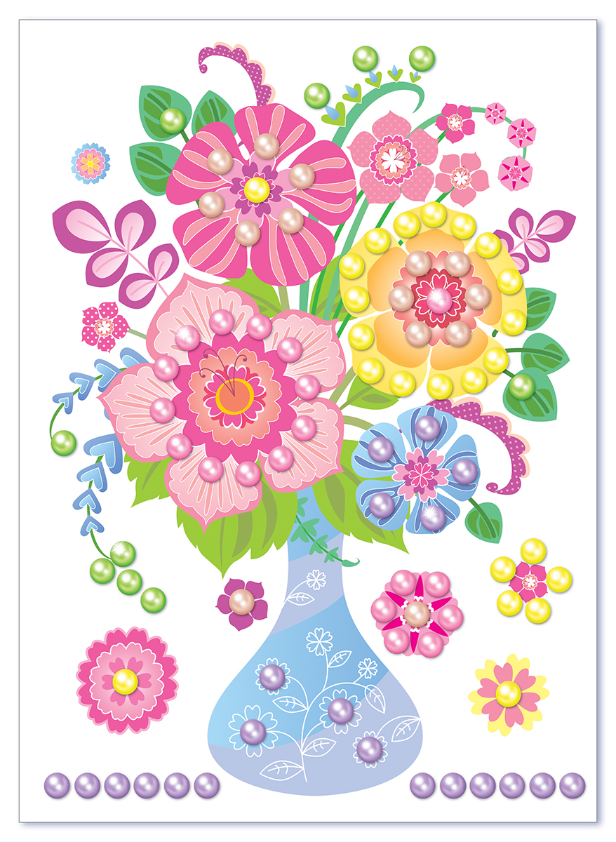 На качественной картонной основе с изображением букета отмечены места для бусин, ребенку необходимо аккуратно наклеить бусины нужного цвета на соответствующие точки.