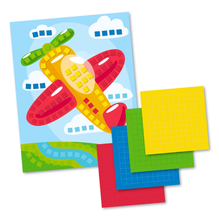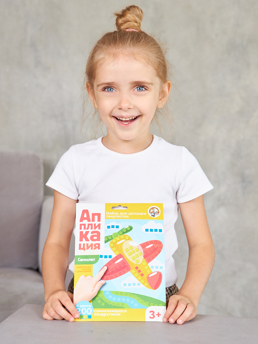 Набор для детского творчества - аппликация «Самолет» состоит из 1 цветной картонной карточки размером 20х16 см и 4 цветных блоков. Ребенку необходимо украсить картинку объемными самоклеящимися квадратиками. Этот процесс превосходно разовьет моторику неловких пальчиков и стимулирует творческие наклонности.