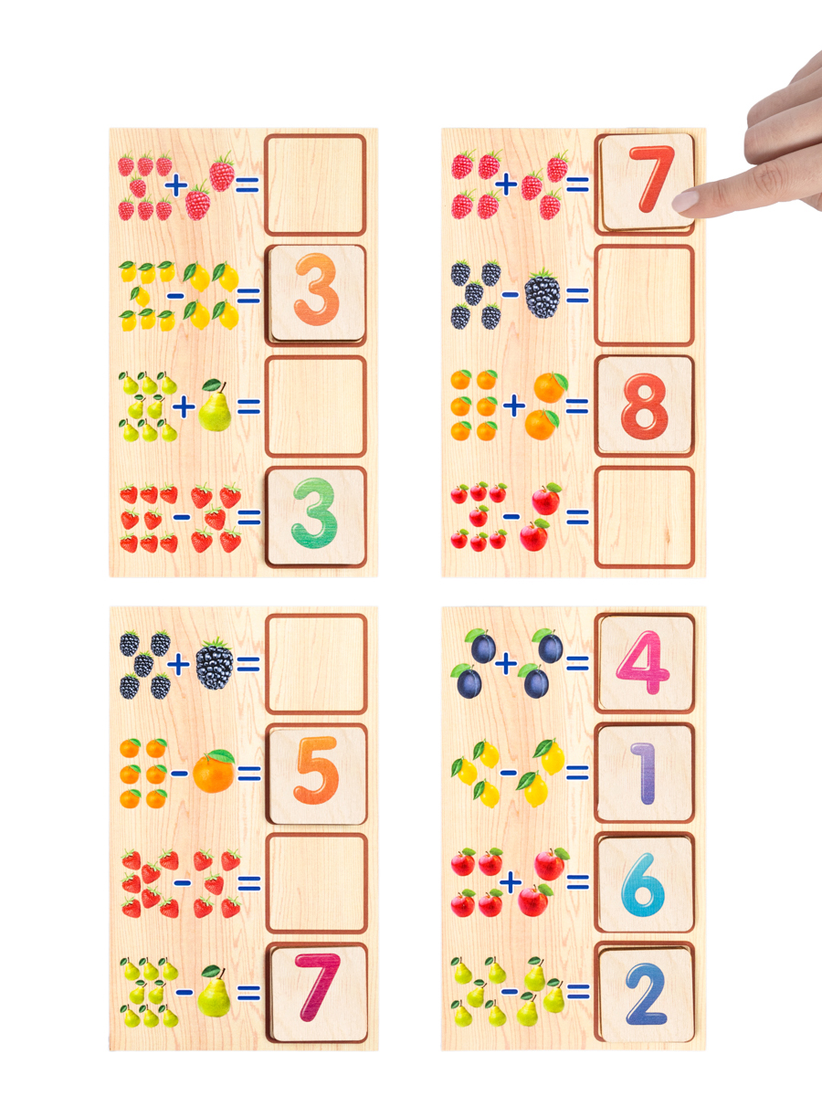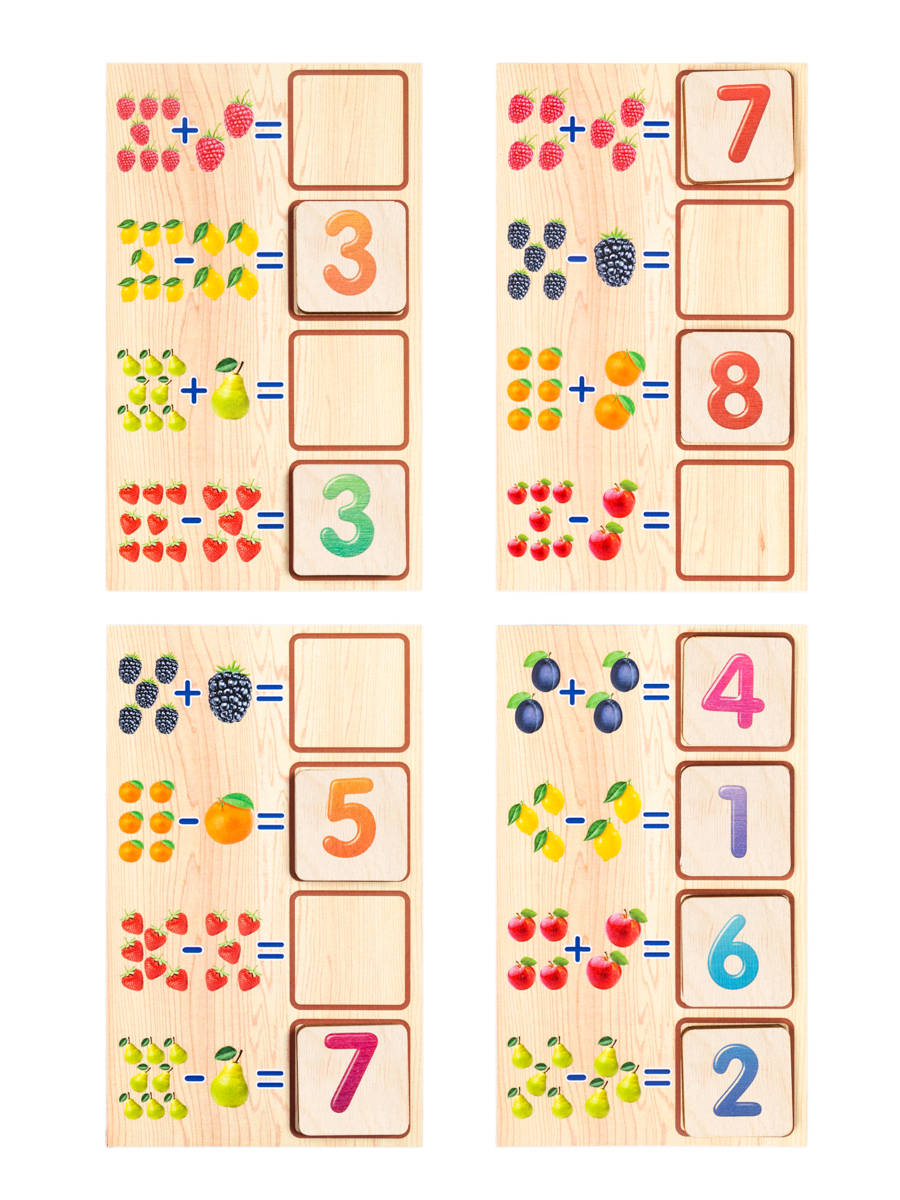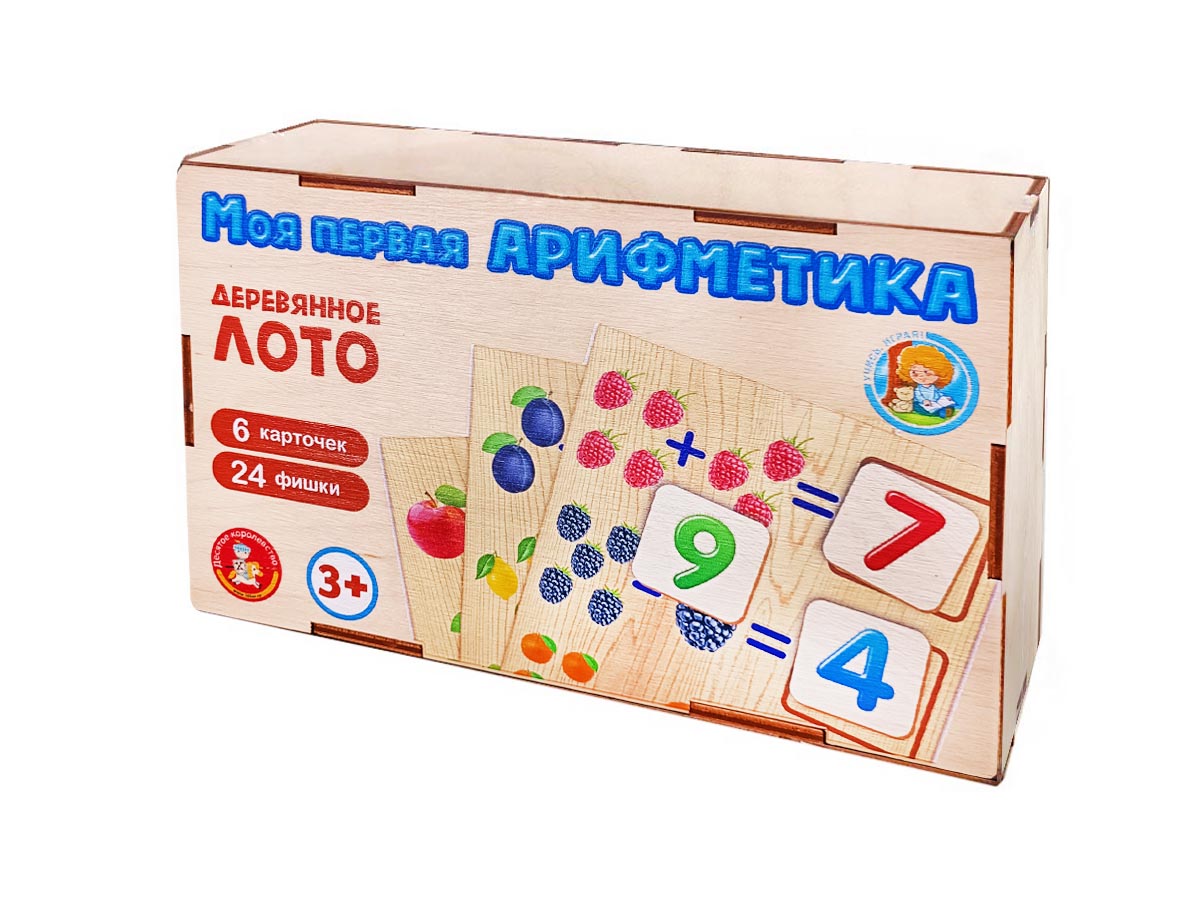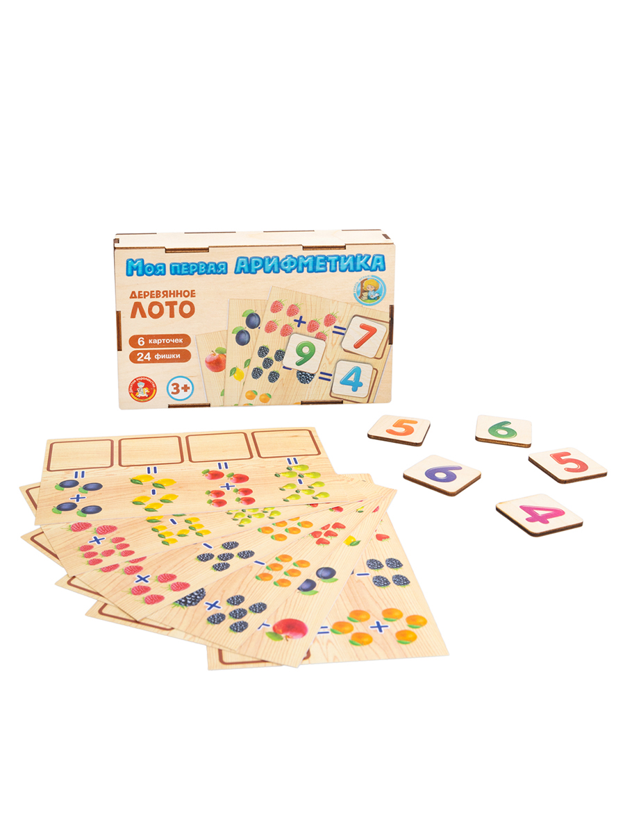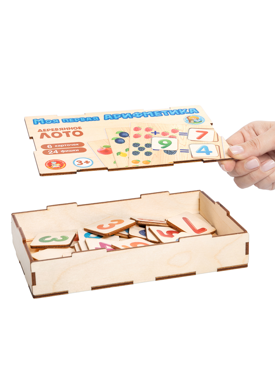 Деревянное лото «Моя первая арифметика» в игровой форме познакомит ребёнка с цифрами и основными математическими знаками, а также научит решать простейшие примеры на два первых математических действия – сложение и вычитание.