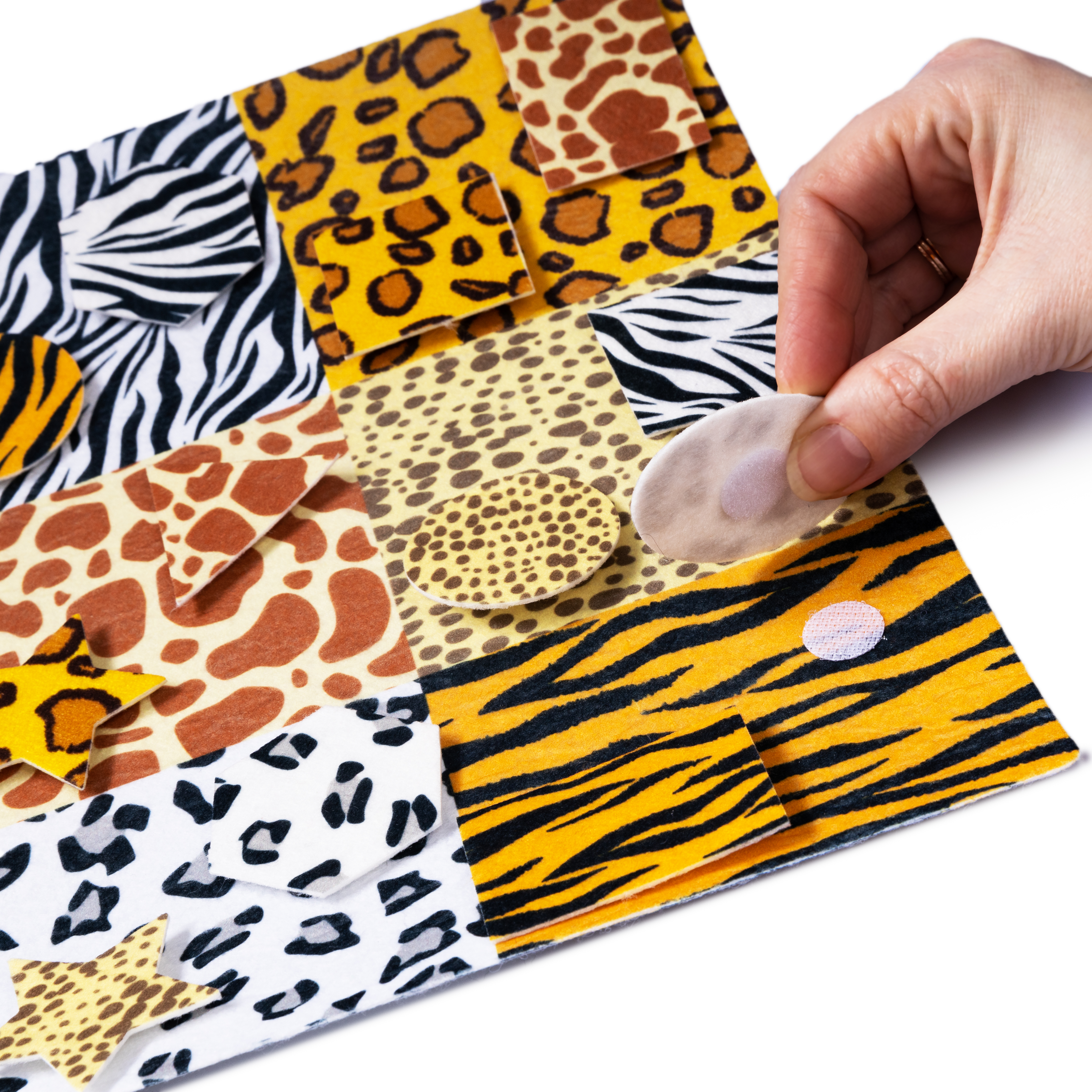 Геометрические фигуры крепятся к игровому полю с помощью липучек «велькро». Их легко соединять и разъединять, при этом детали крепко держатся на игровом поле, когда липучки соединены.