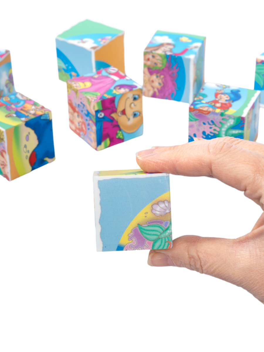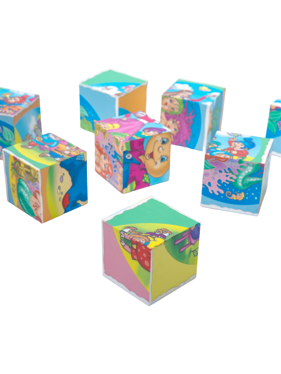 Набор «Цветные сказки-4» состоит из 9 пластмассовых кубиков картинок размером 4 см.