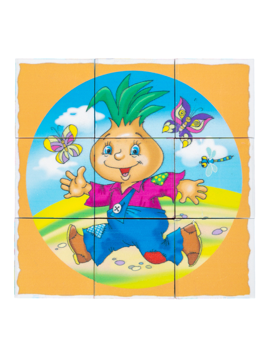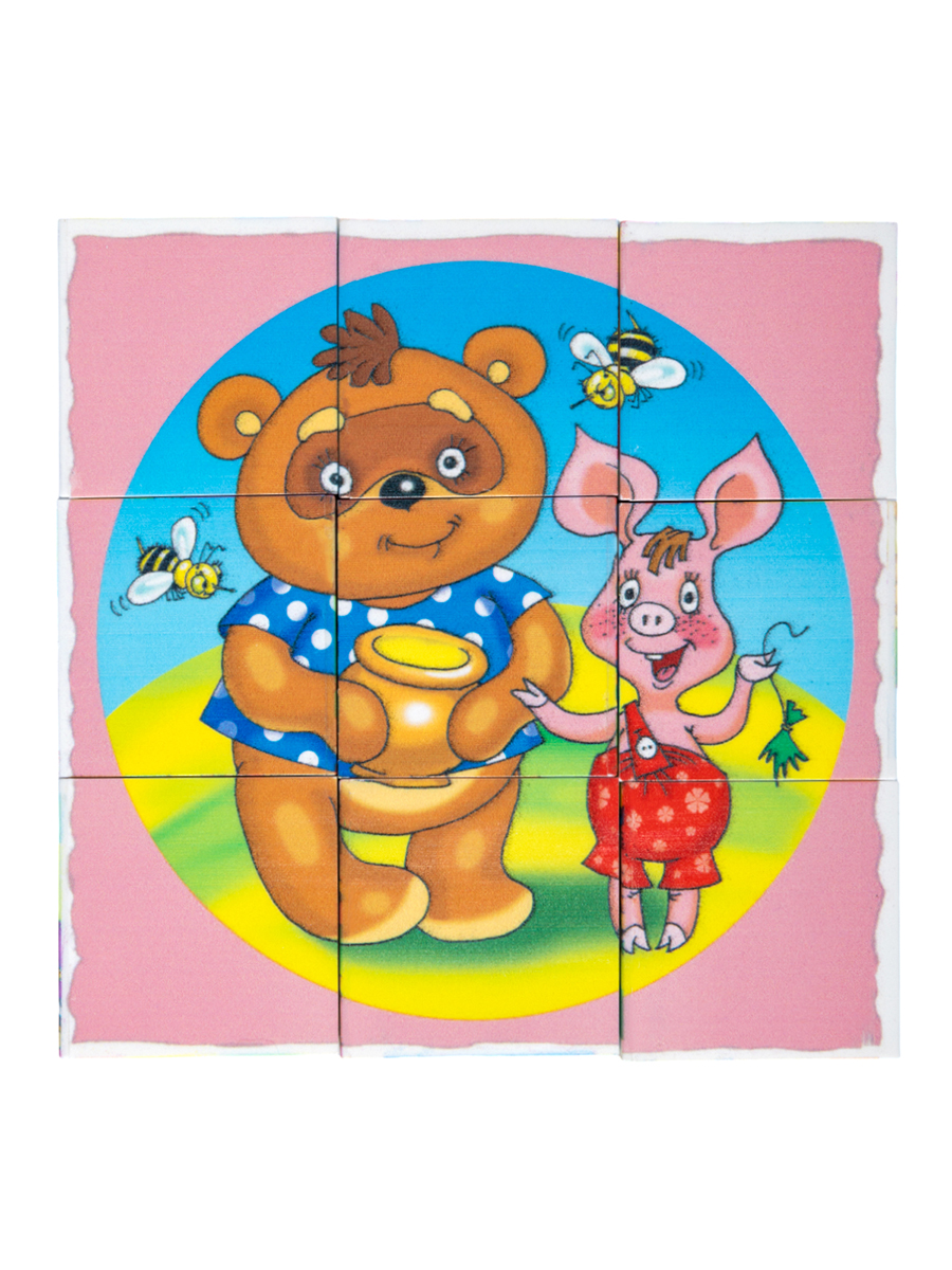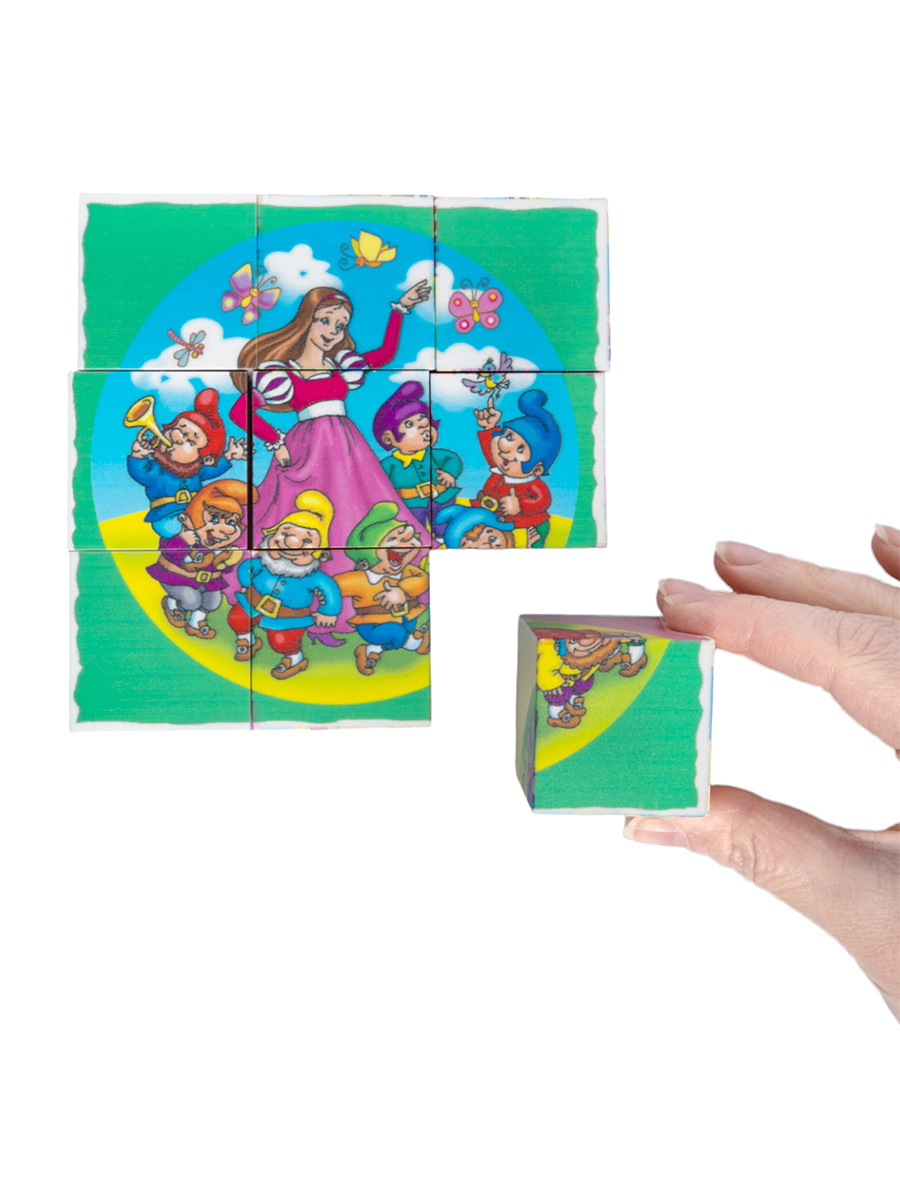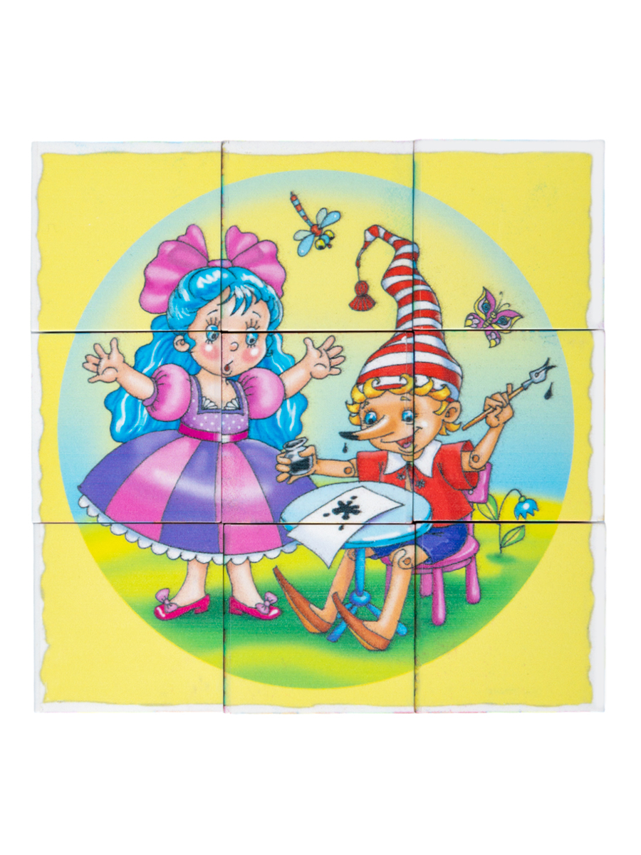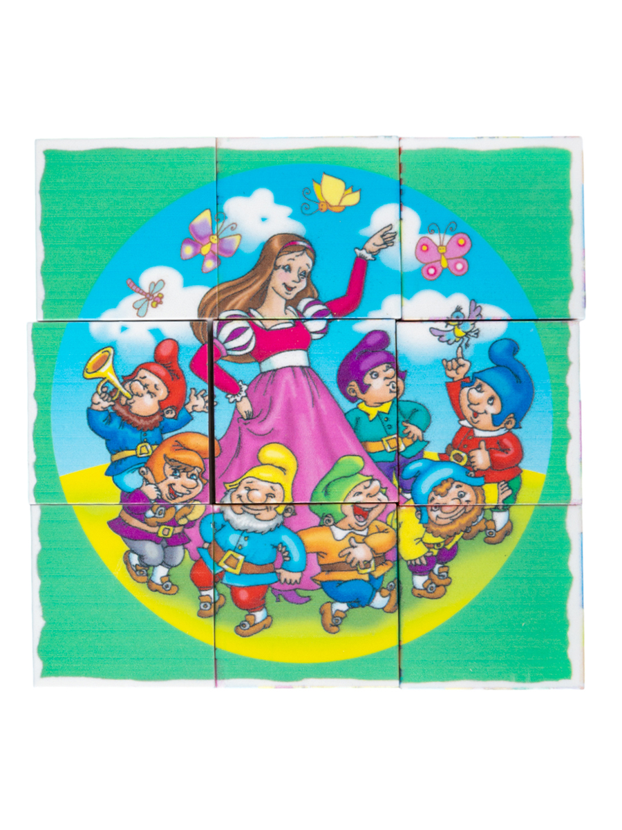 Собрать шесть красочных картинок по мотивам детских сказок - Белоснежка и семь гномов, Чипполино, Красная шапочка, Буратино а также Винни-пух из девяти кубиков вполне по силам любому ребенку в возрасте от трех лет. Особенно, если он ранее уже собирал картинки из 4 или 6 кубиков.