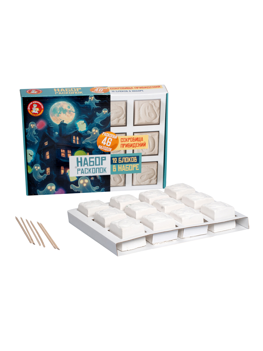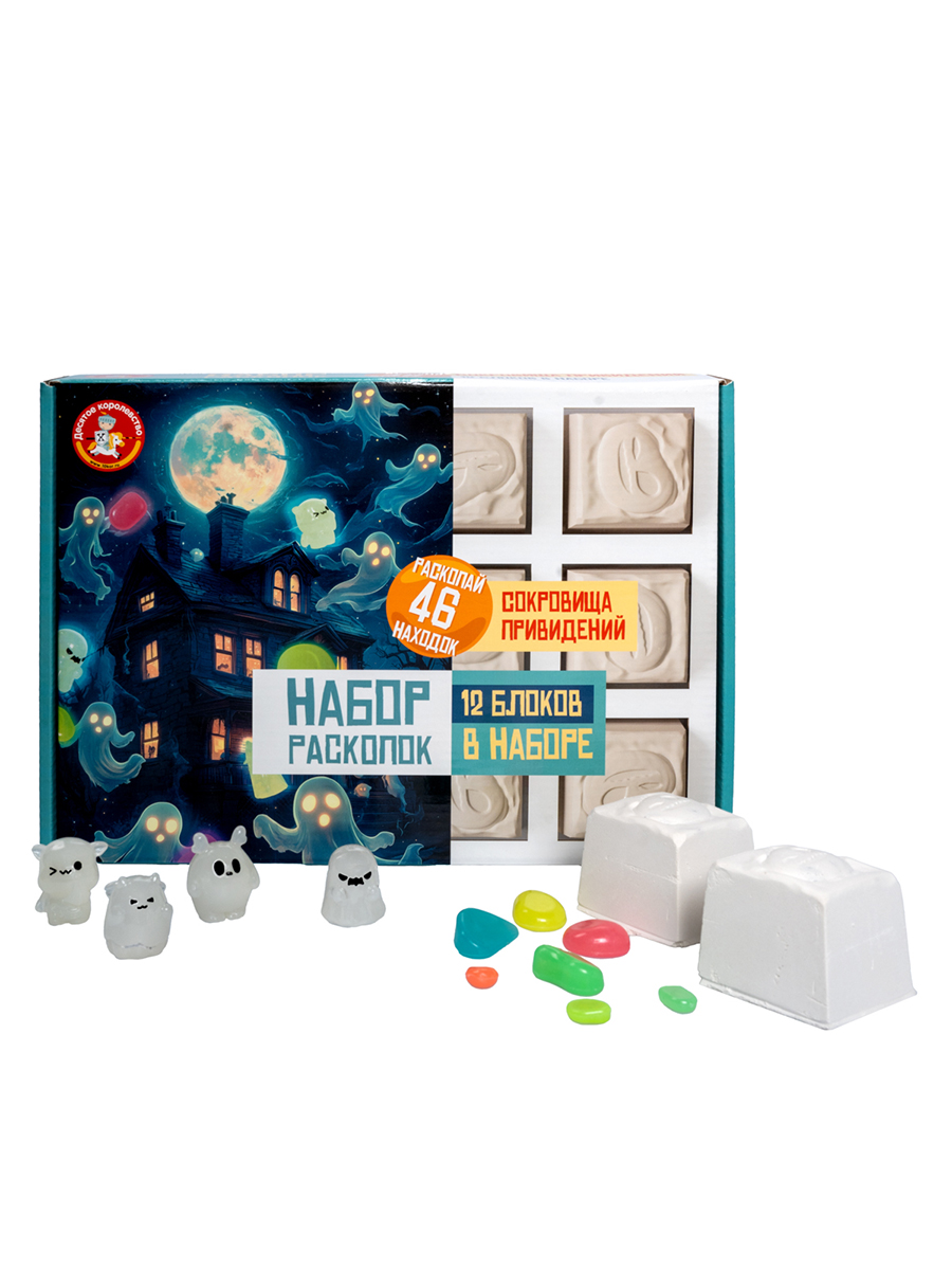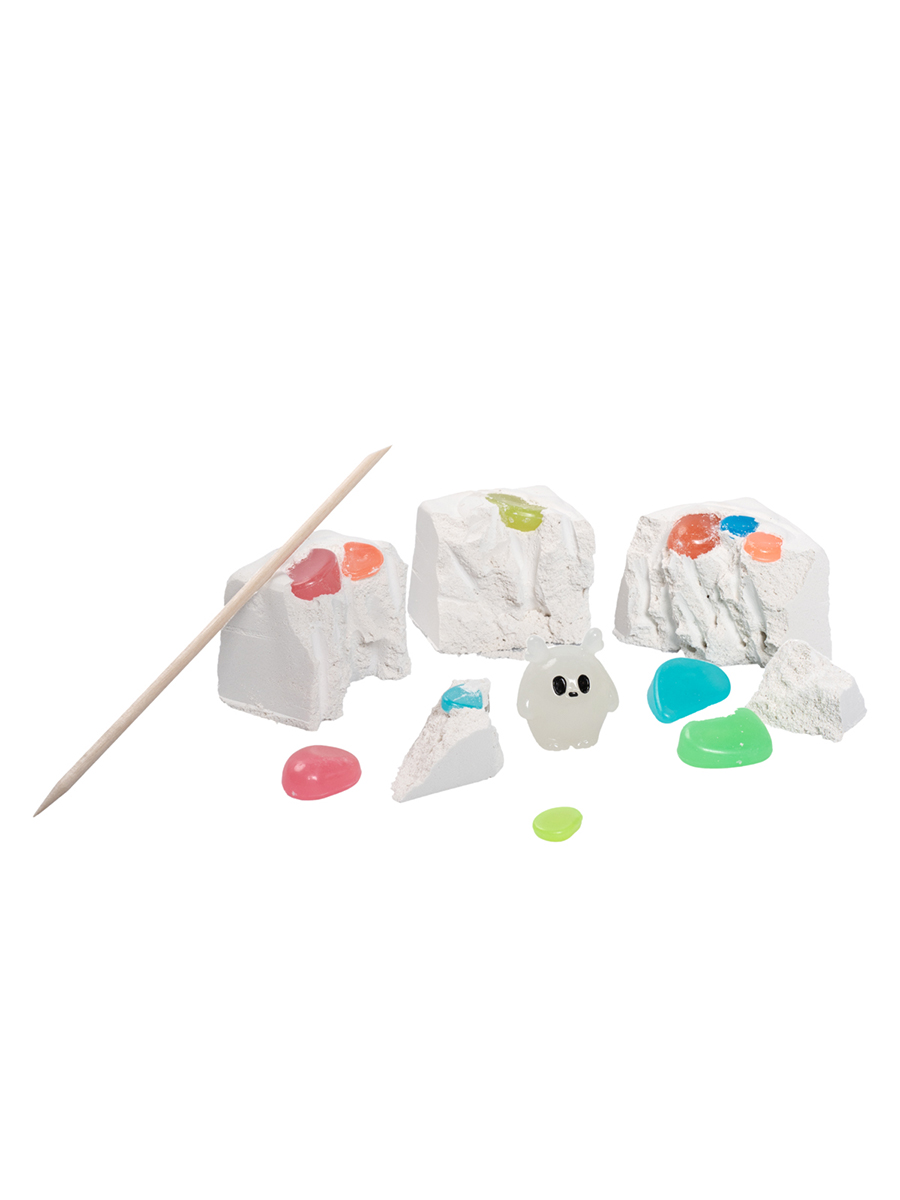 Набор для раскопок "Сокровища привидений" - это большой набор, играя с которым можно найти 4 фигурки милых привидений и много драгоценных камней, все сокровища светятся в темноте! Начинайте раскопки, постепенно откалывая кусочки грунта с помощью специального деревянного стека.