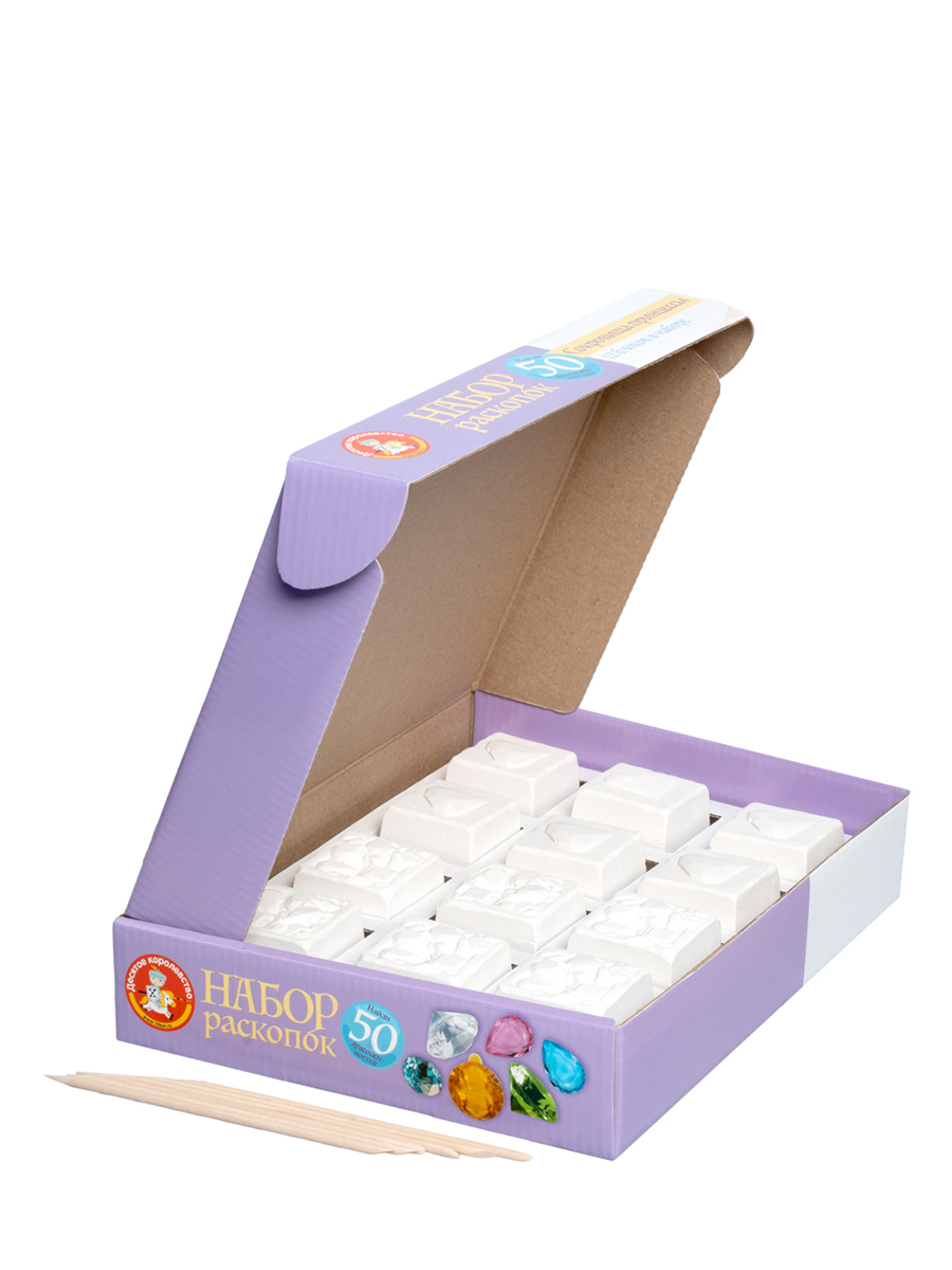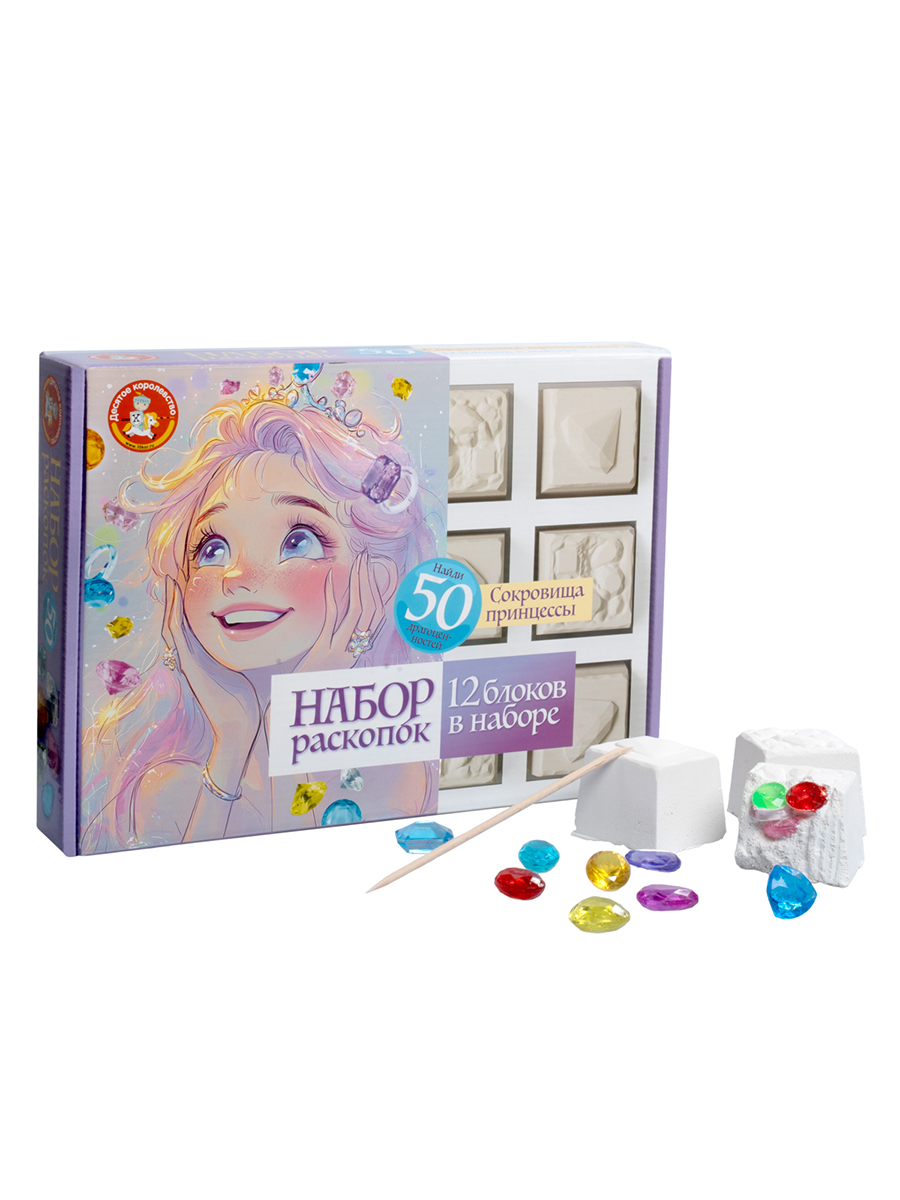 Набор для раскопок «Сокровище принцессы» - это большой набор с 12 блоками, в которых скрыты сразу 50 драгоценностей, разноцветные сияющие бриллианты, кристаллы и колечки!Начинайте раскопки, постепенно откалывая кусочки грунта с помощью специального деревянного стека, и соберите свою коллекцию находок.
