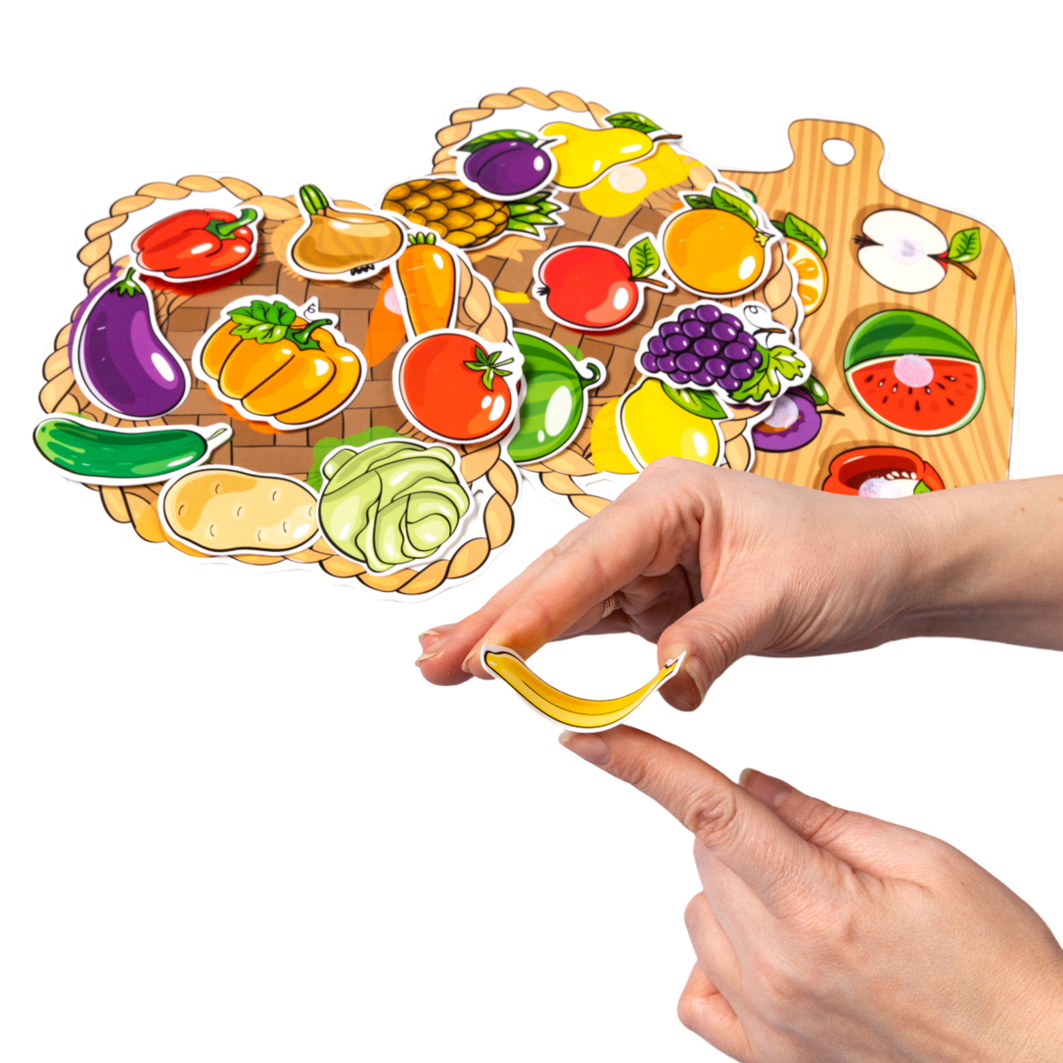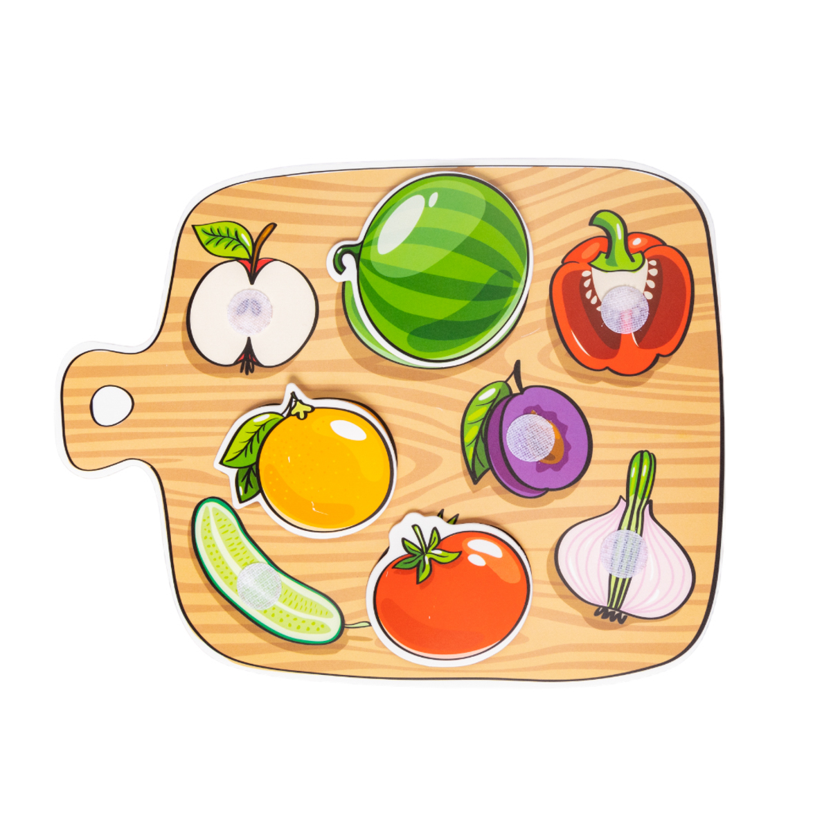 Пластик на липучках «Фрукты и овощи» – это игра, которая в увлекательной форме научит ребёнка сопоставлять два объекта между собой. Малыш научится различать фрукты и овощи и запомнит, как они выглядят.
