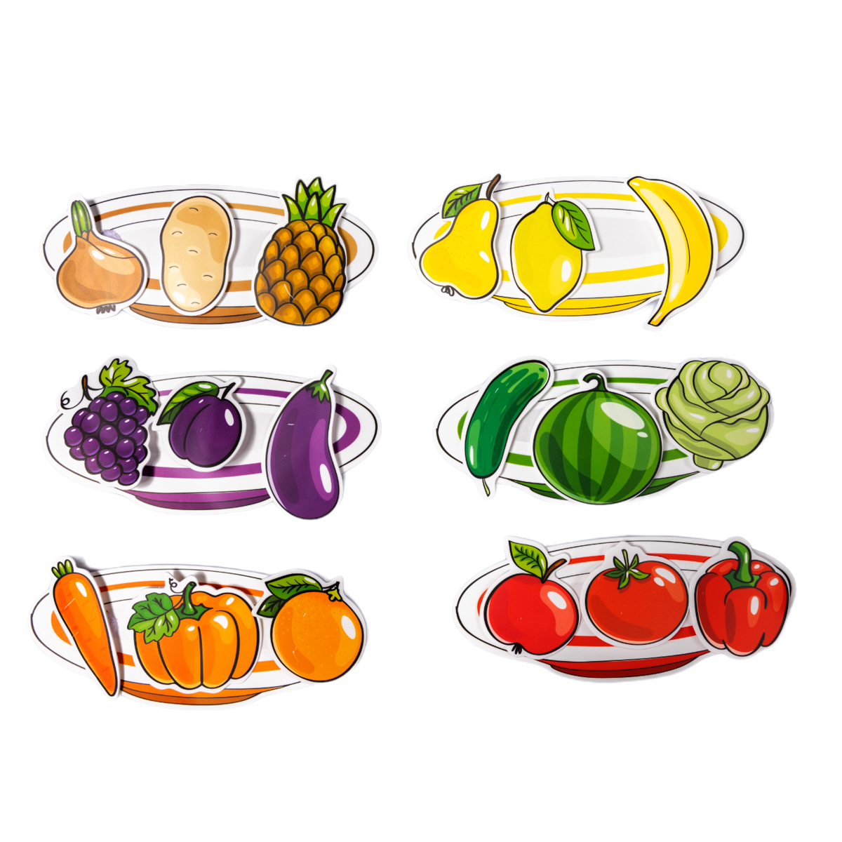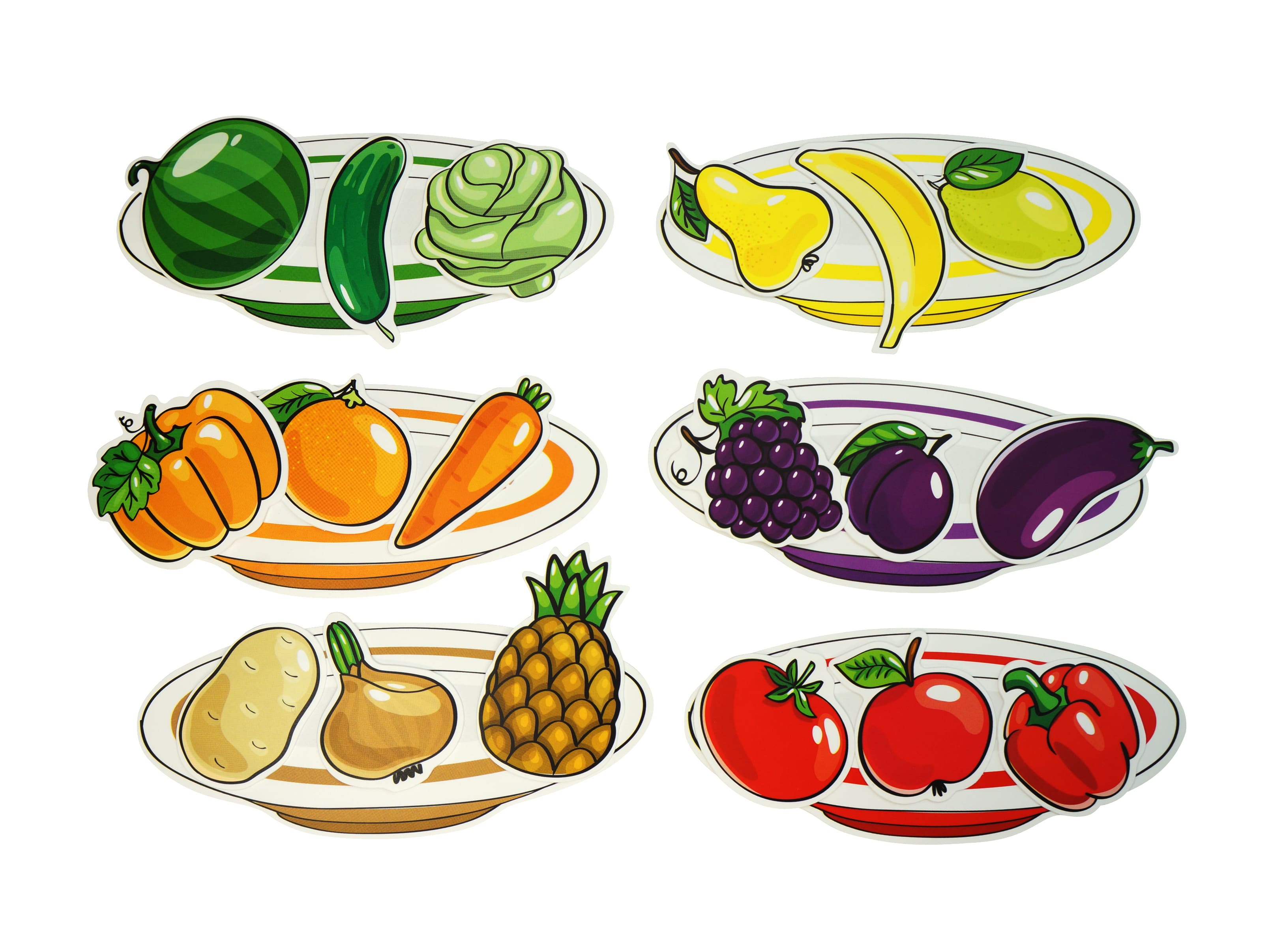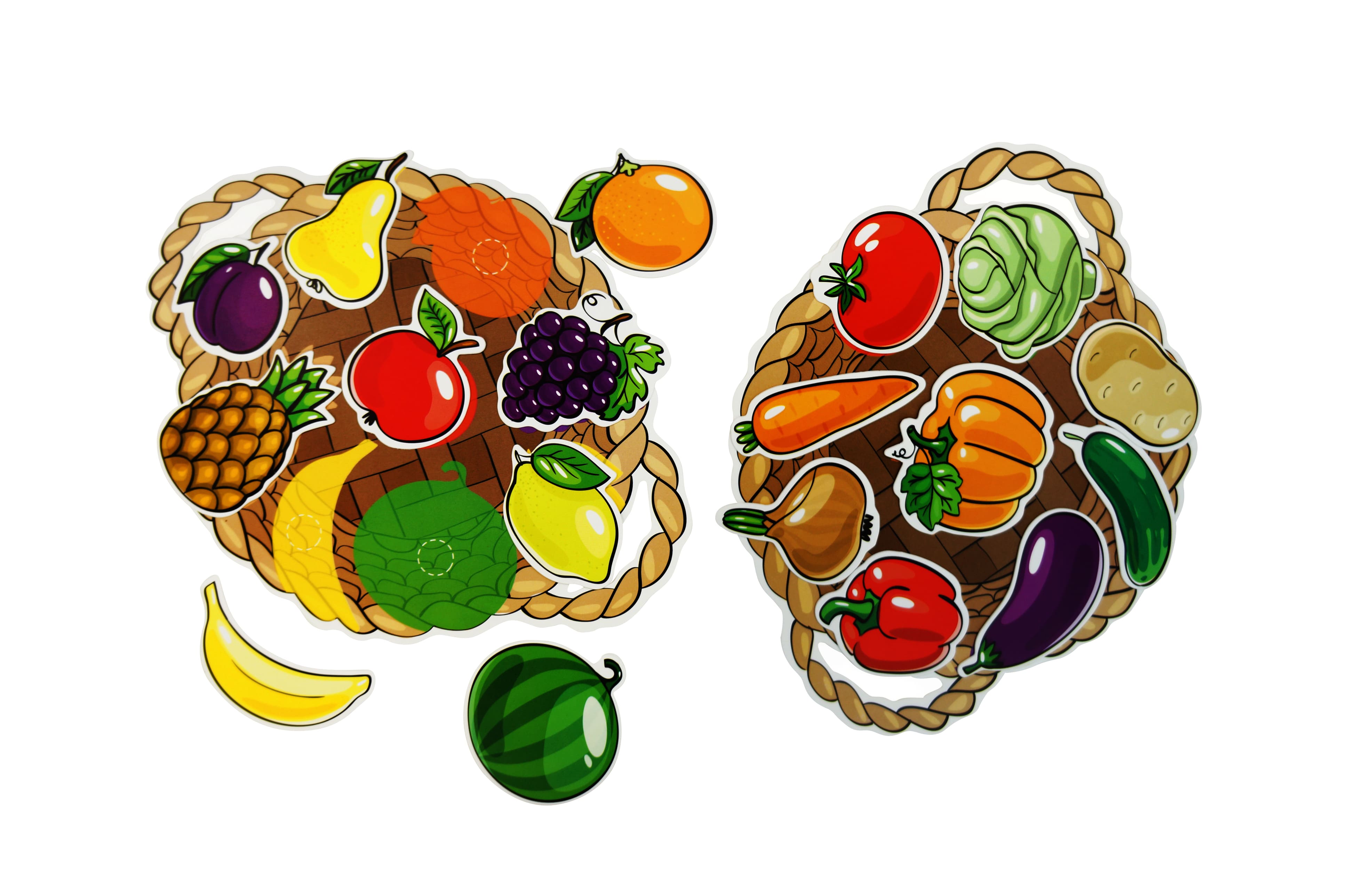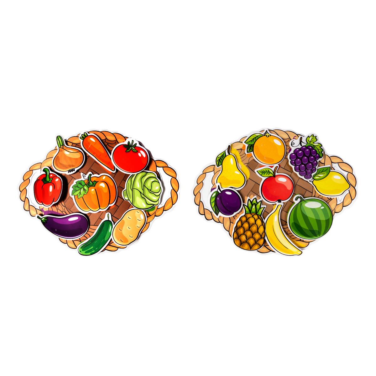 • предметы, из них овощи: перец, капуста, морковь, тыква, картофель, помидор, огурец, лук, баклажан; фрукты: груша, банан, лимон, апельсин, слива, ананас, яблоко; ягоды: виноград, арбуз – 18 шт.