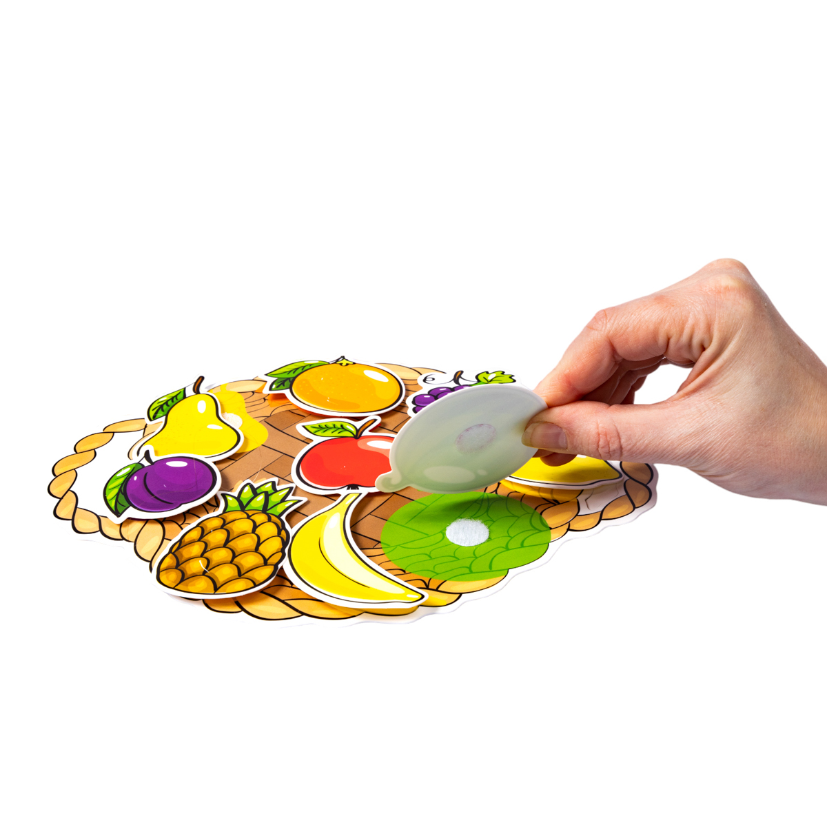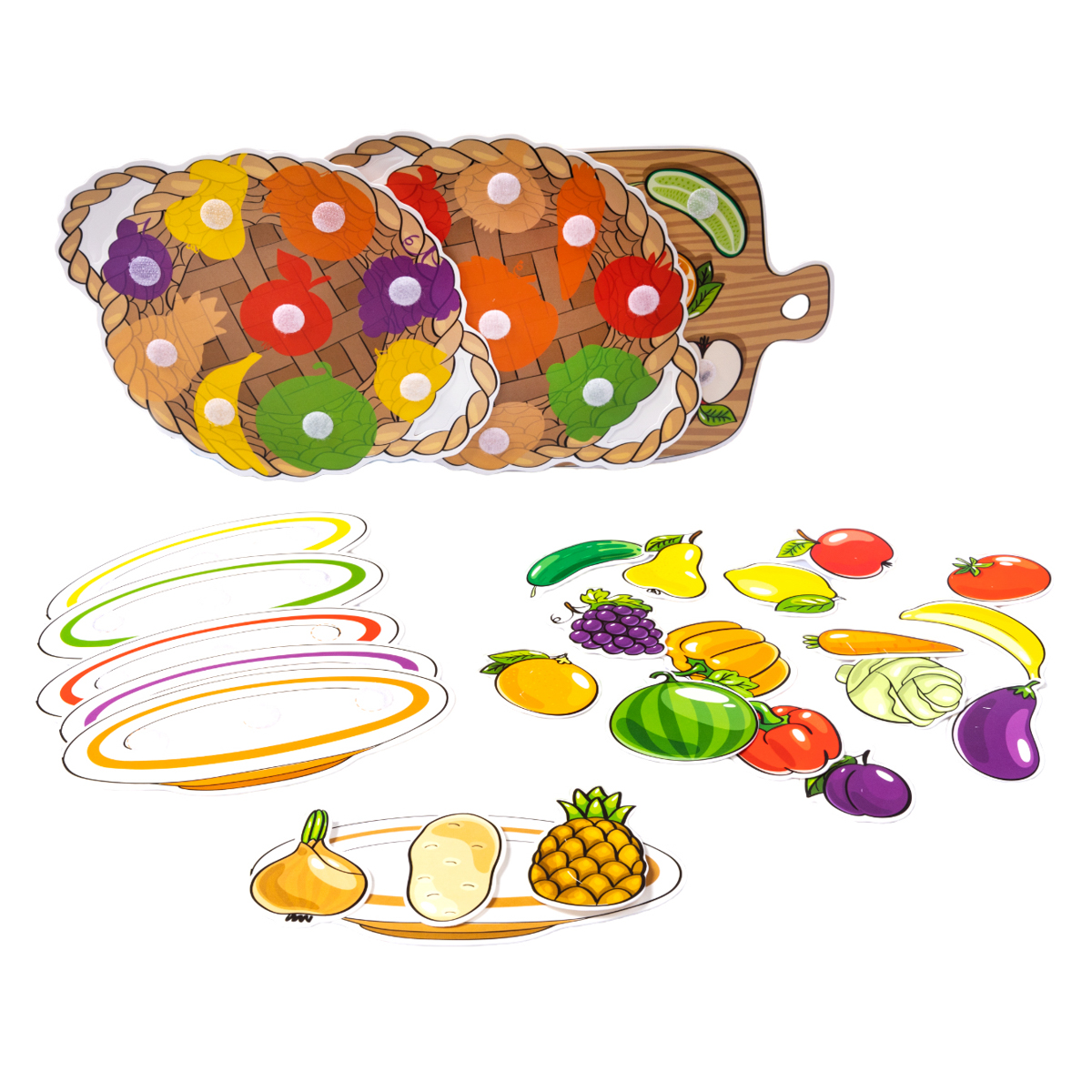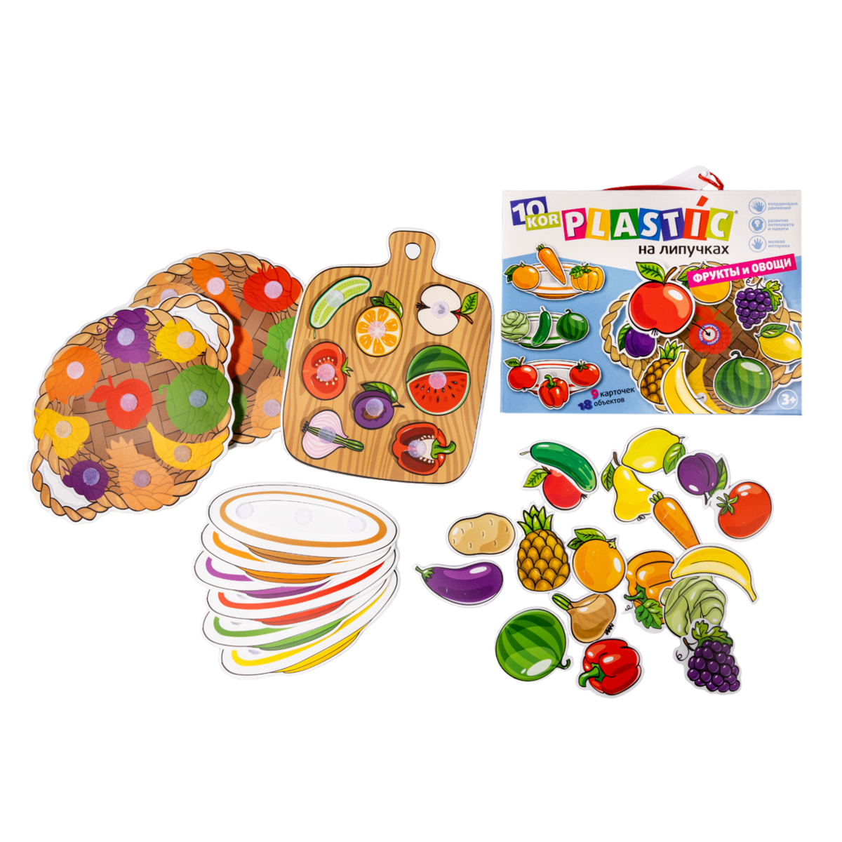 Пластик на липучках «Фрукты и овощи» помимо мелкой моторики, развивает координацию движений, интеллект и память, внимание и усидчивость, учит сопоставлять объекты между собой, расширяет словарный запас.