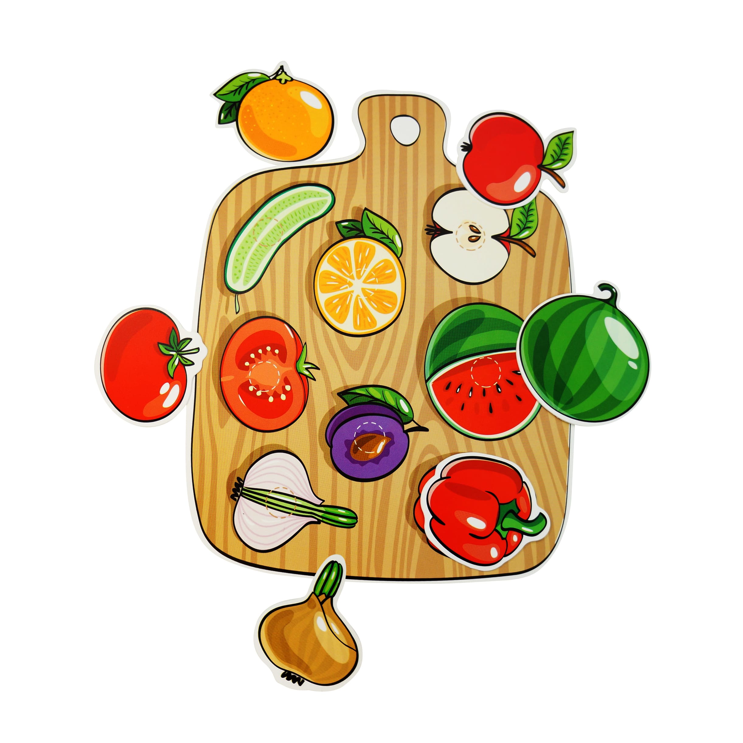 Играя, малыш повторит цвета и научится группировать фигуры по этому признаку. Также ребенку будет интересно узнать и запомнить, как будут выглядеть некоторые овощи и фрукты в разрезе. А красочные элементы превратят процесс обучения в веселую игру!