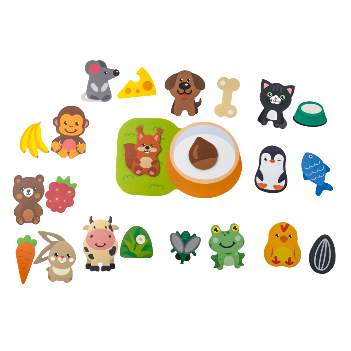 Прикрепите на игровое поле фигурку животного. Попросите ребенка самостоятельно выбрать, что ест это животное, и прикрепить нужную фигурку на игровое поле.