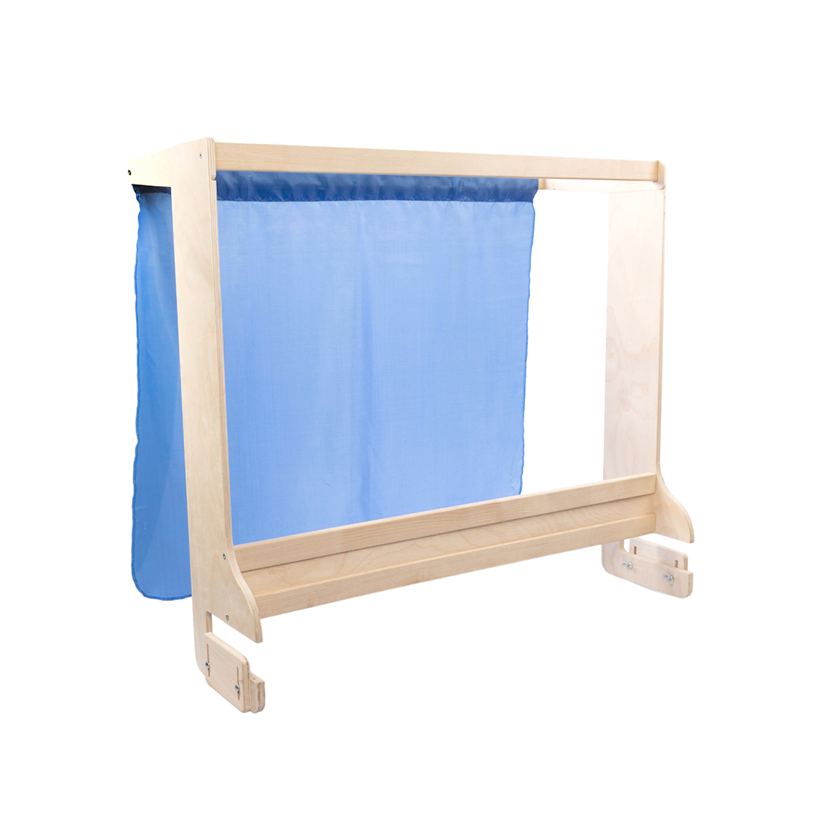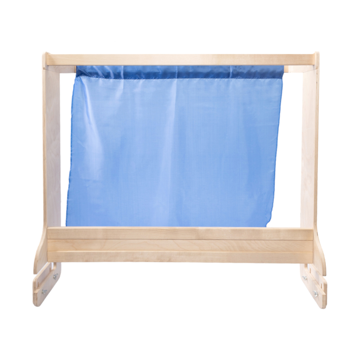 Шторка из ткани голубого цвета крепится с помощью специальной перекладины, образуя нейтральный фон для представления. Все детали ширмы благодаря тщательной шлифовке имеют гладкую поверхность.