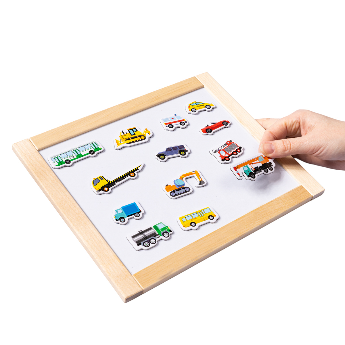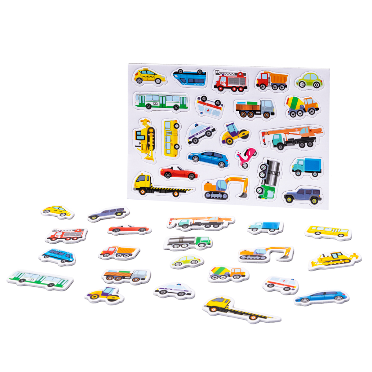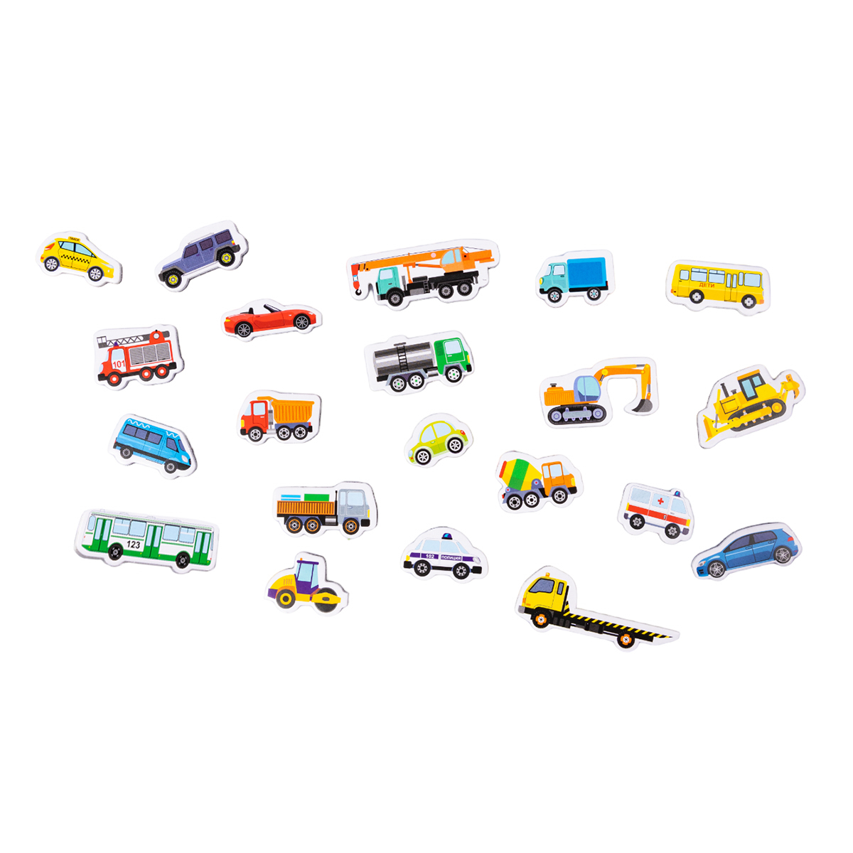 Этот набор магнитных машинок поможет родителям научить детей от 3-х лет различать машины по разным признакам. Например, попросить малыша рассортировать фигурки по назначению: строительная техника, машины для перевозки пассажиров, служебные, личный транспорт и т.п. Если у Вас уже есть в наличии магнитная доска и ее размеры позволяют нарисовать импровизированный населенный пункт или дорожную ситуацию, то возможности игры «Магнитные машинки» значительно расширяются. А ребенок учится в непринужденной игровой форме находить взаимосвязи, развивать логическое мышление и внимательность.