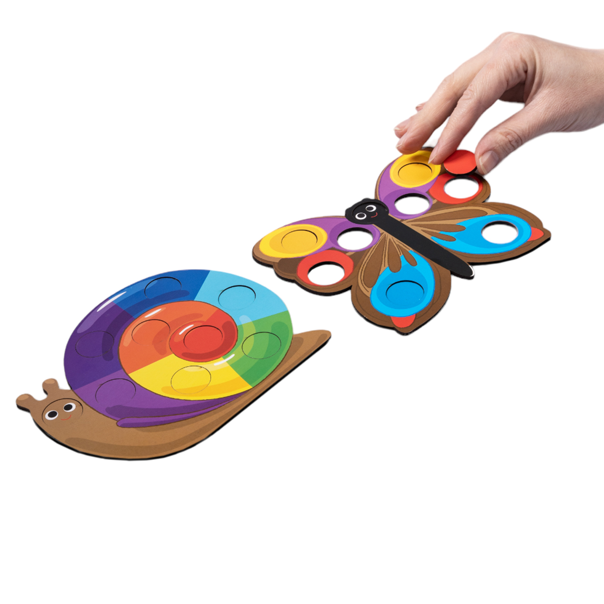 2.Нужно собрать картинку (бабочка и улитка), заполнив подходящими по цвету элементами.