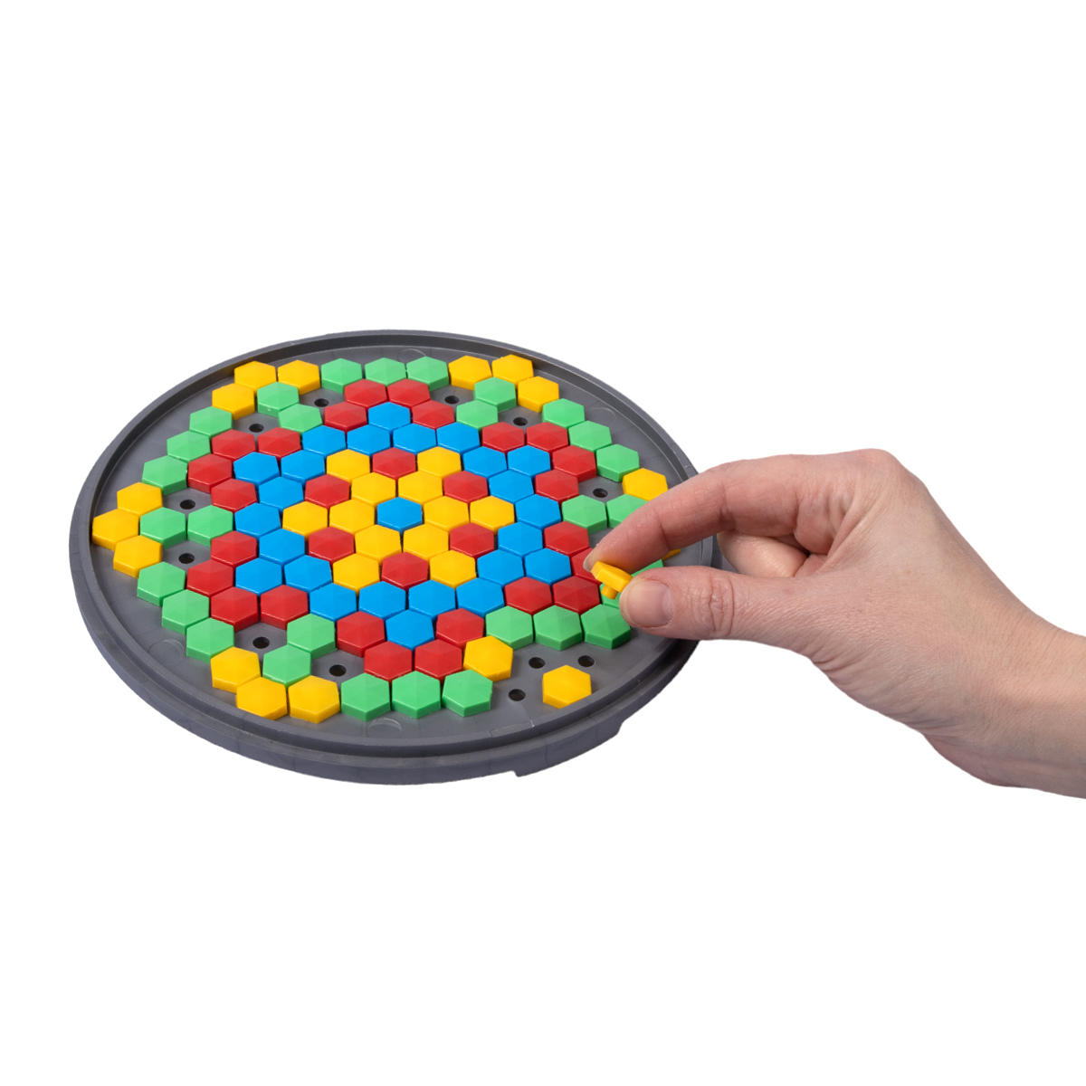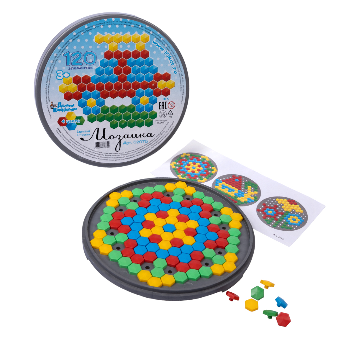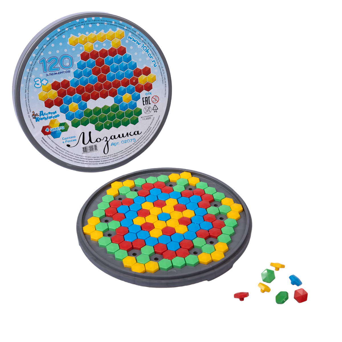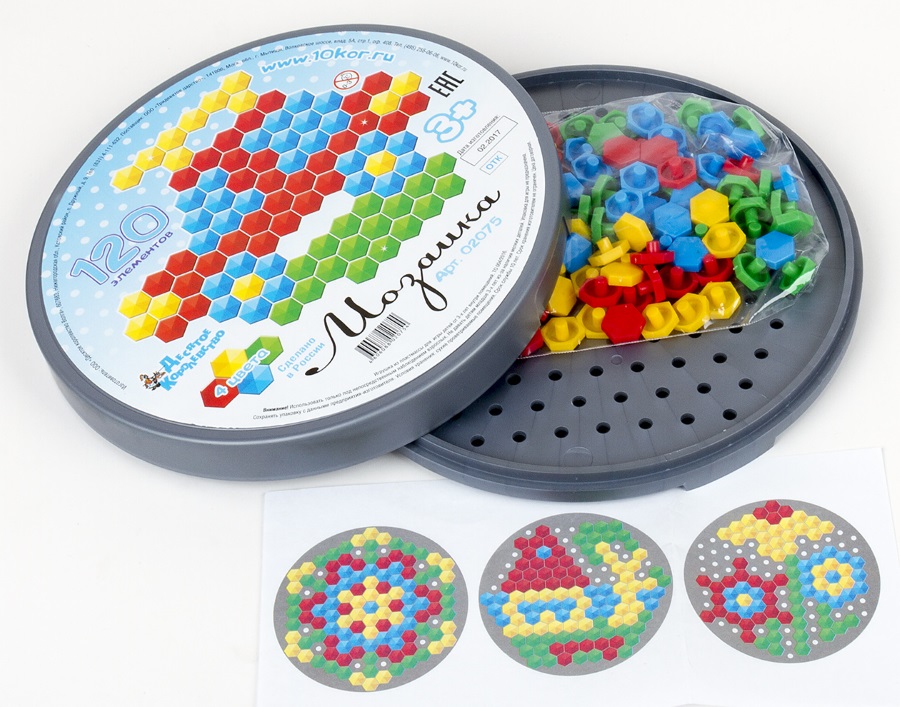 Мозаика пластмассовая детская шестигранная из 120 элементов. Для создания мозаичных изображений можно воспользоваться прилагаемой инструкцией или придумать свои. Игра развивает мелкую моторику, усидчивость, образное мышление, фантазию.