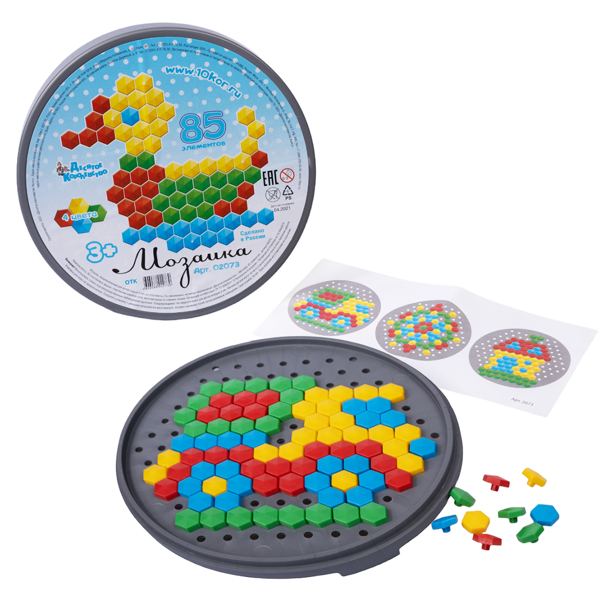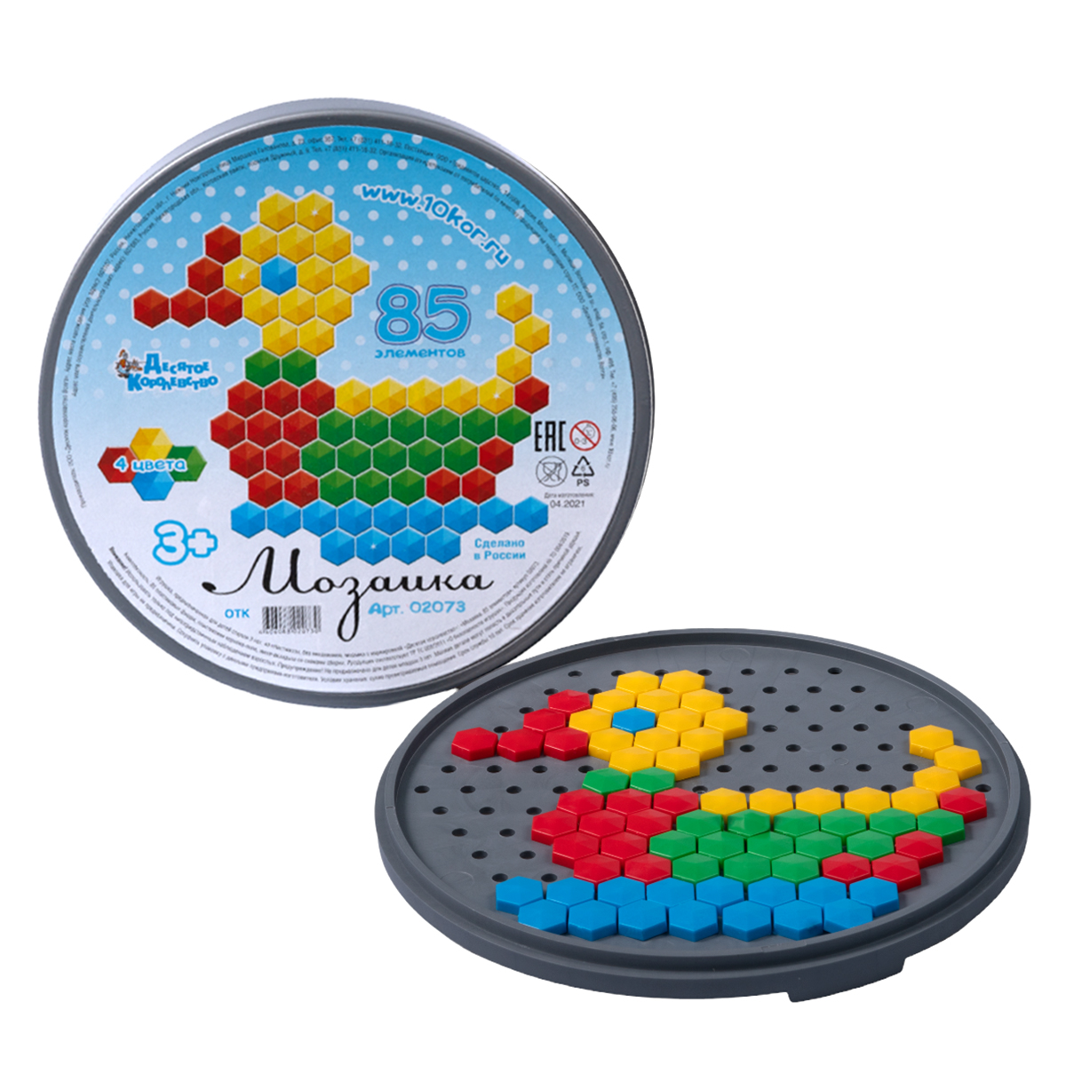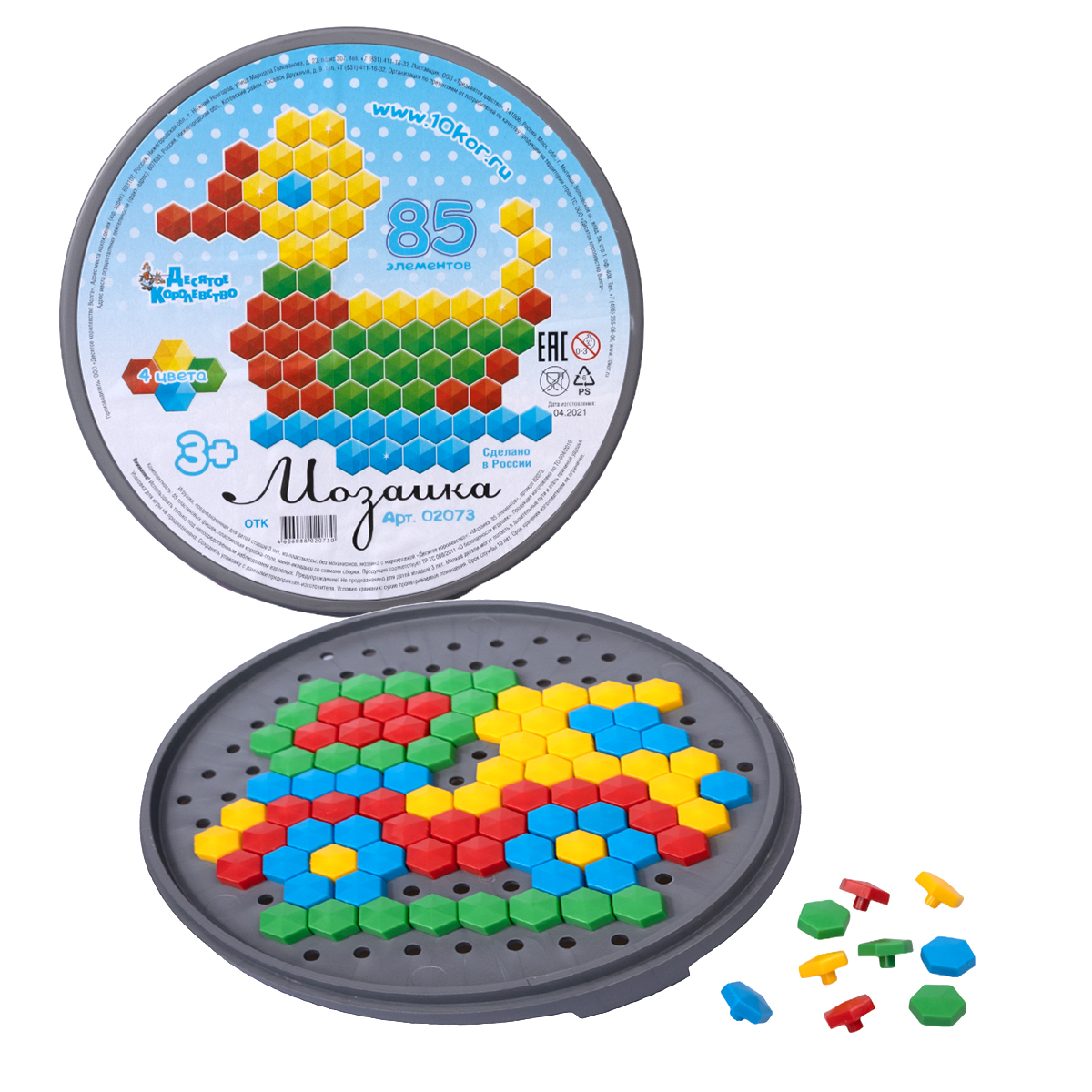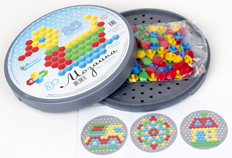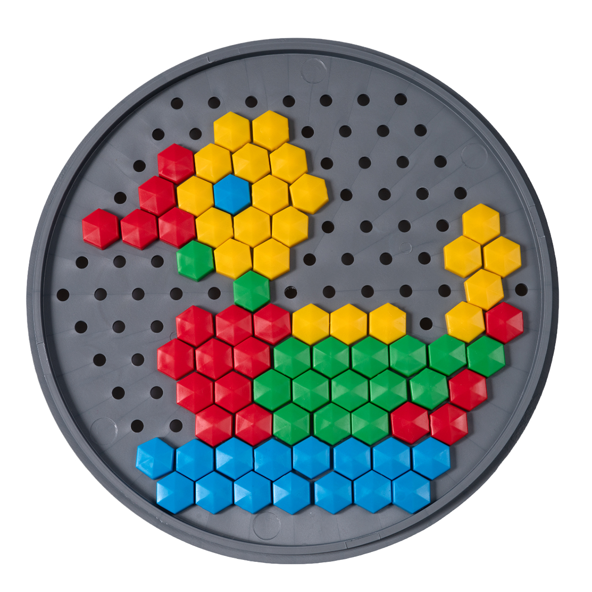 Мозаика пластмассовая детская шестигранная из 85 элементов. Для создания мозаичных изображений можно воспользоваться прилагаемой инструкцией или придумать свои. Игра развивает мелкую моторику, усидчивость, образное мышление, фантазию.