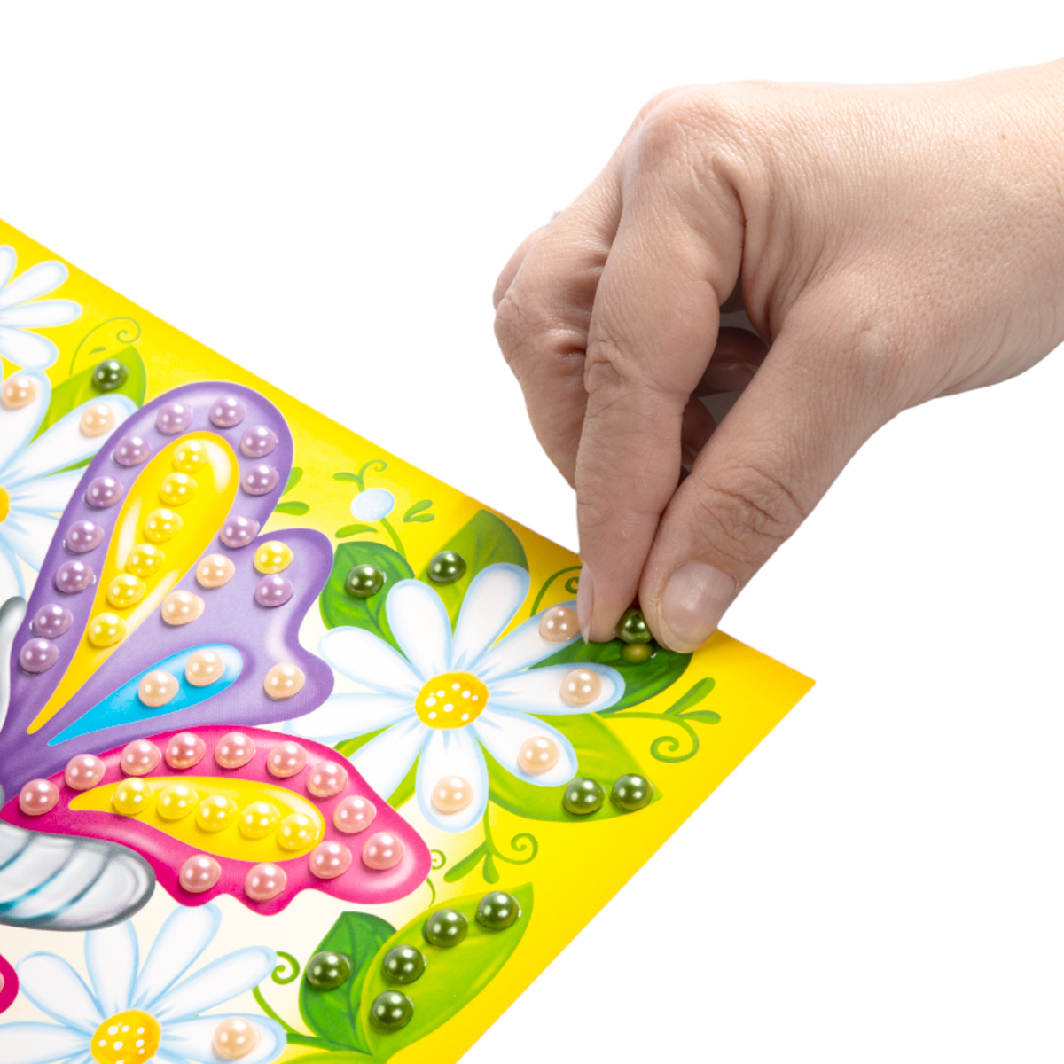 На качественной картонной основе с изображением Бабочки отмечены места для бусин. Ребенку необходимо аккуратно наклеить бусины нужного цвета на соответствующие точки.