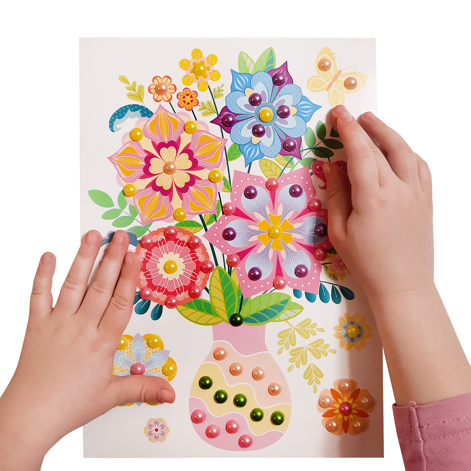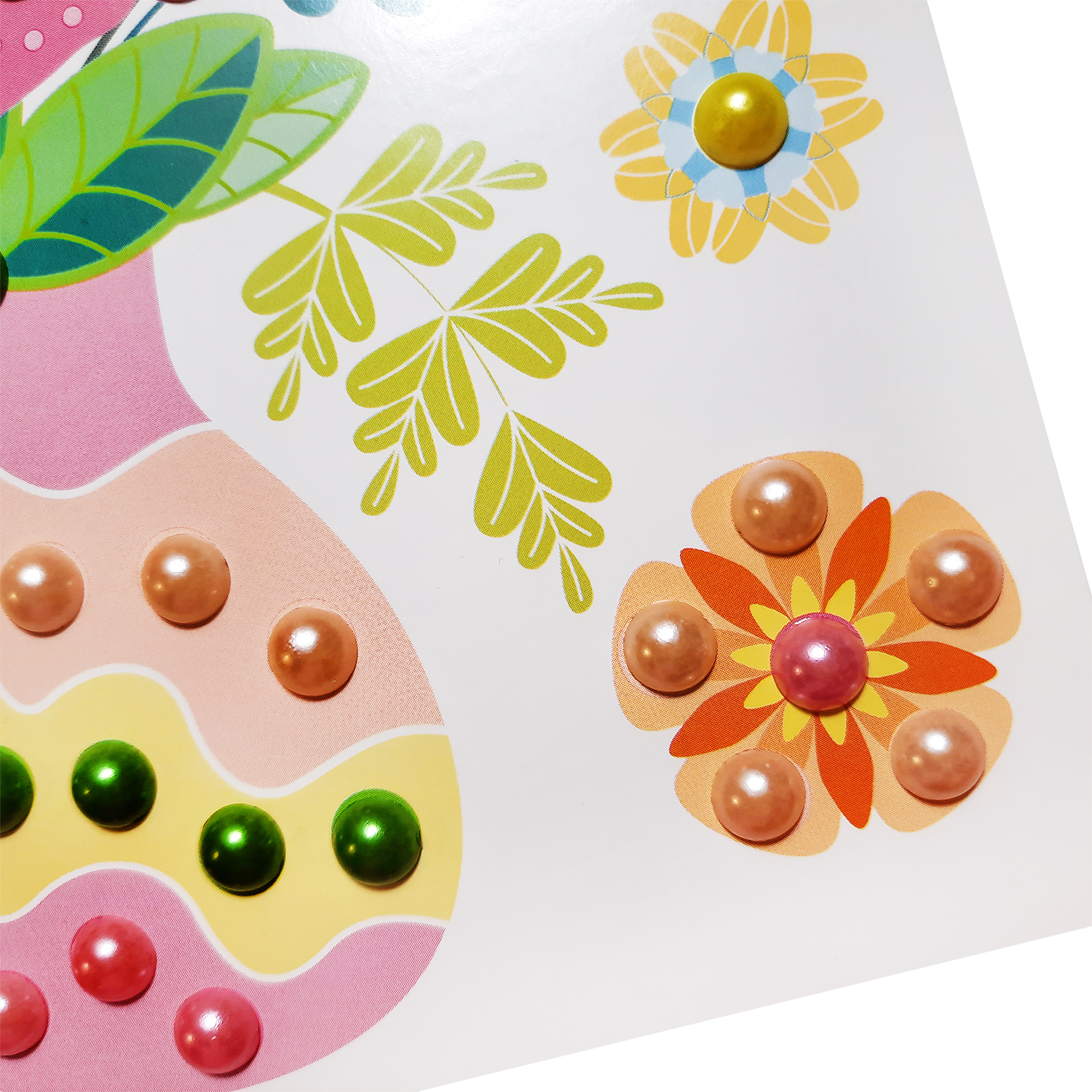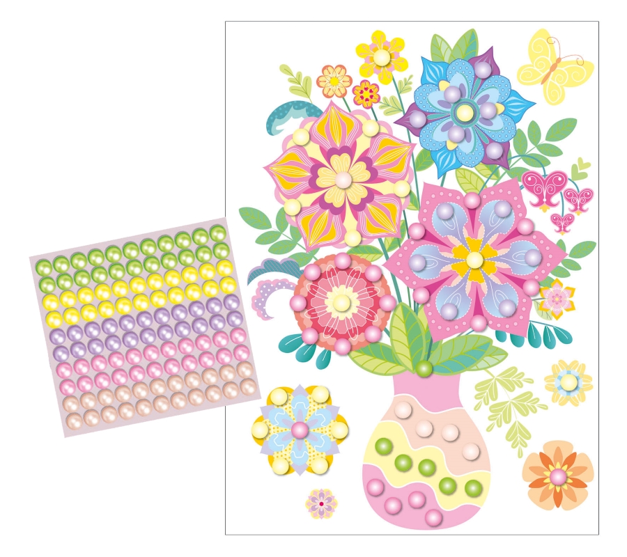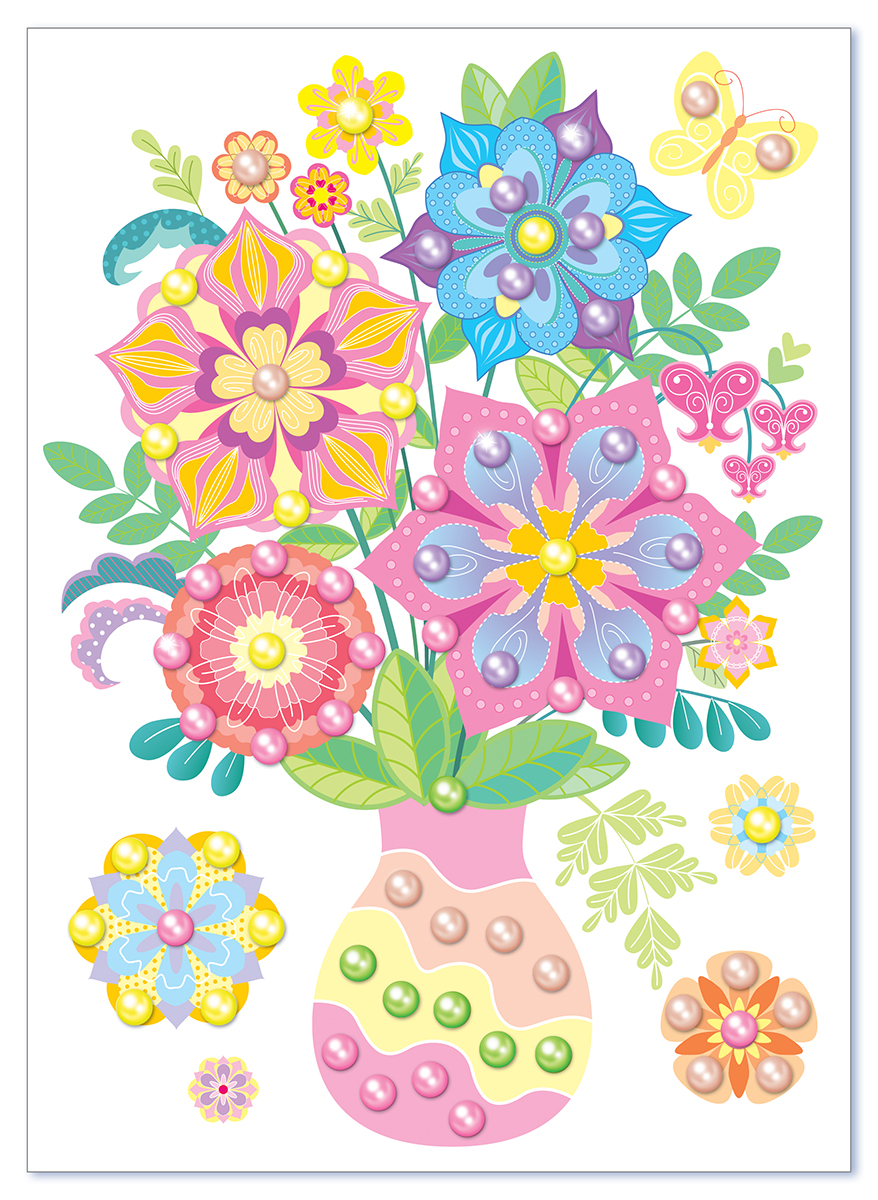 На качественной картонной основе с изображением летнего букета отмечены места для бусин, ребенку необходимо аккуратно наклеить бусины нужного цвета на соответствующие точки.