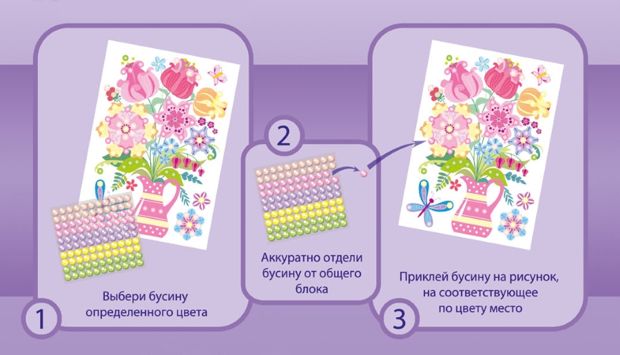На качественной картонной основе с изображением букета отмечены места для бусин, ребенку необходимо аккуратно наклеить бусины нужного цвета на соответствующие точки.