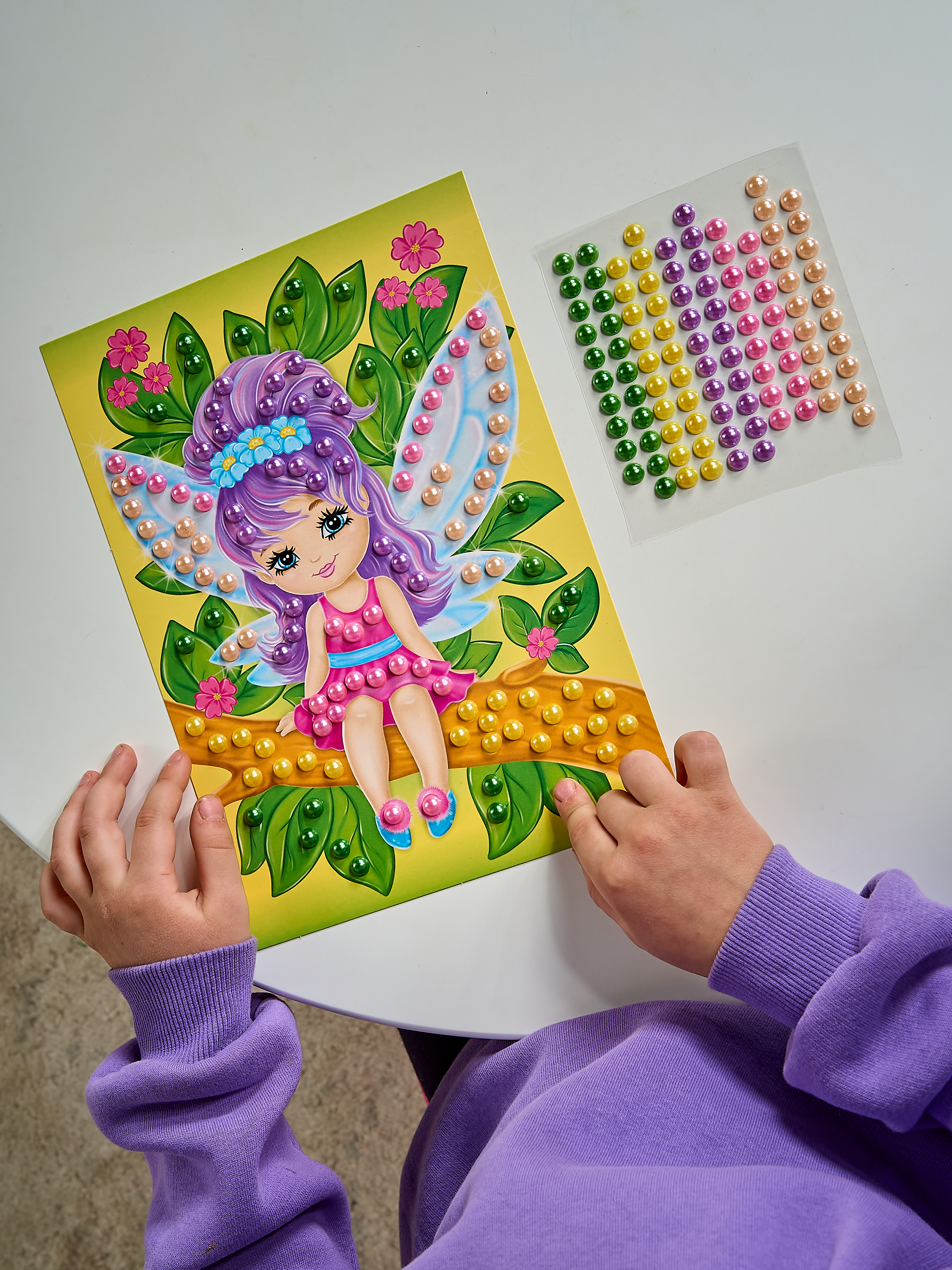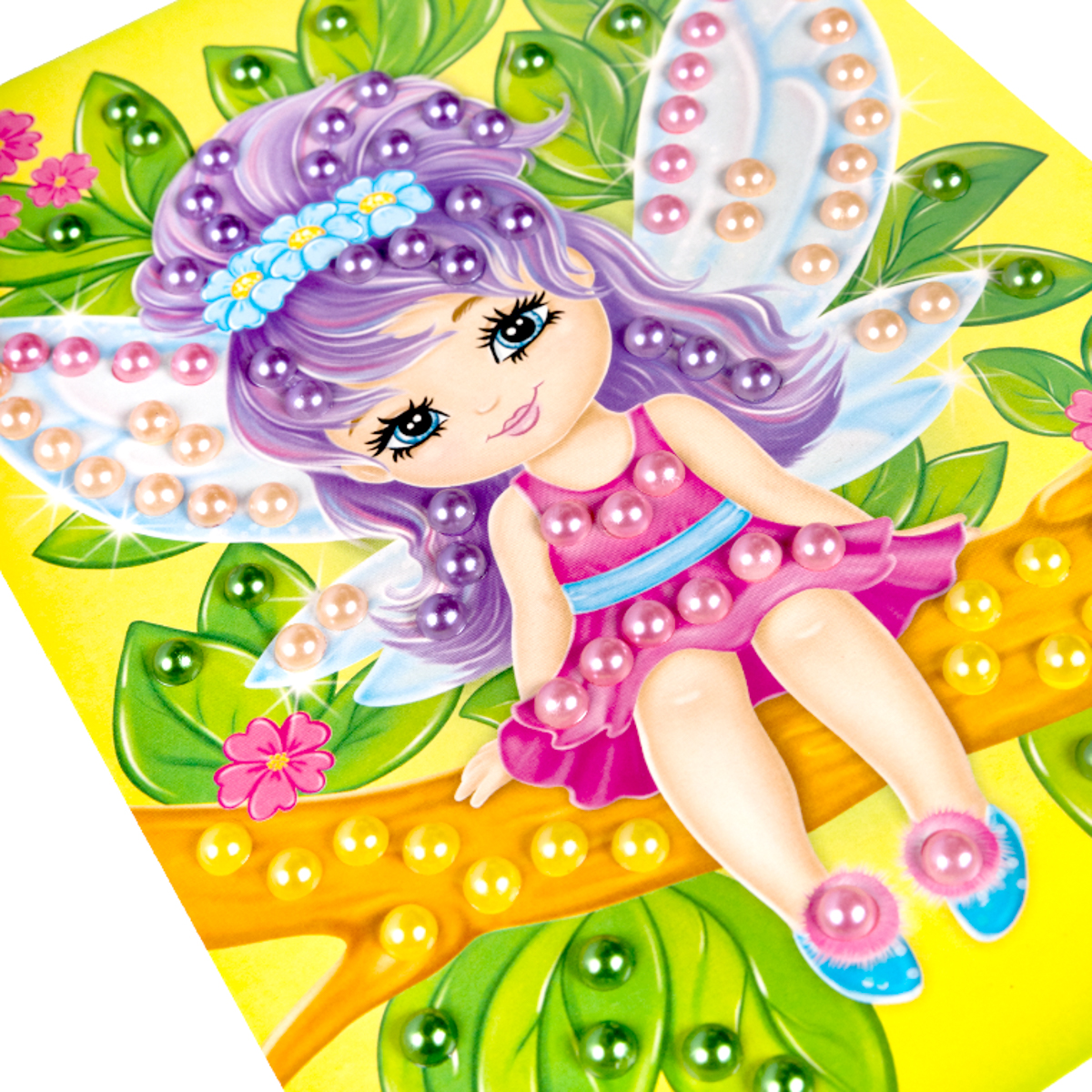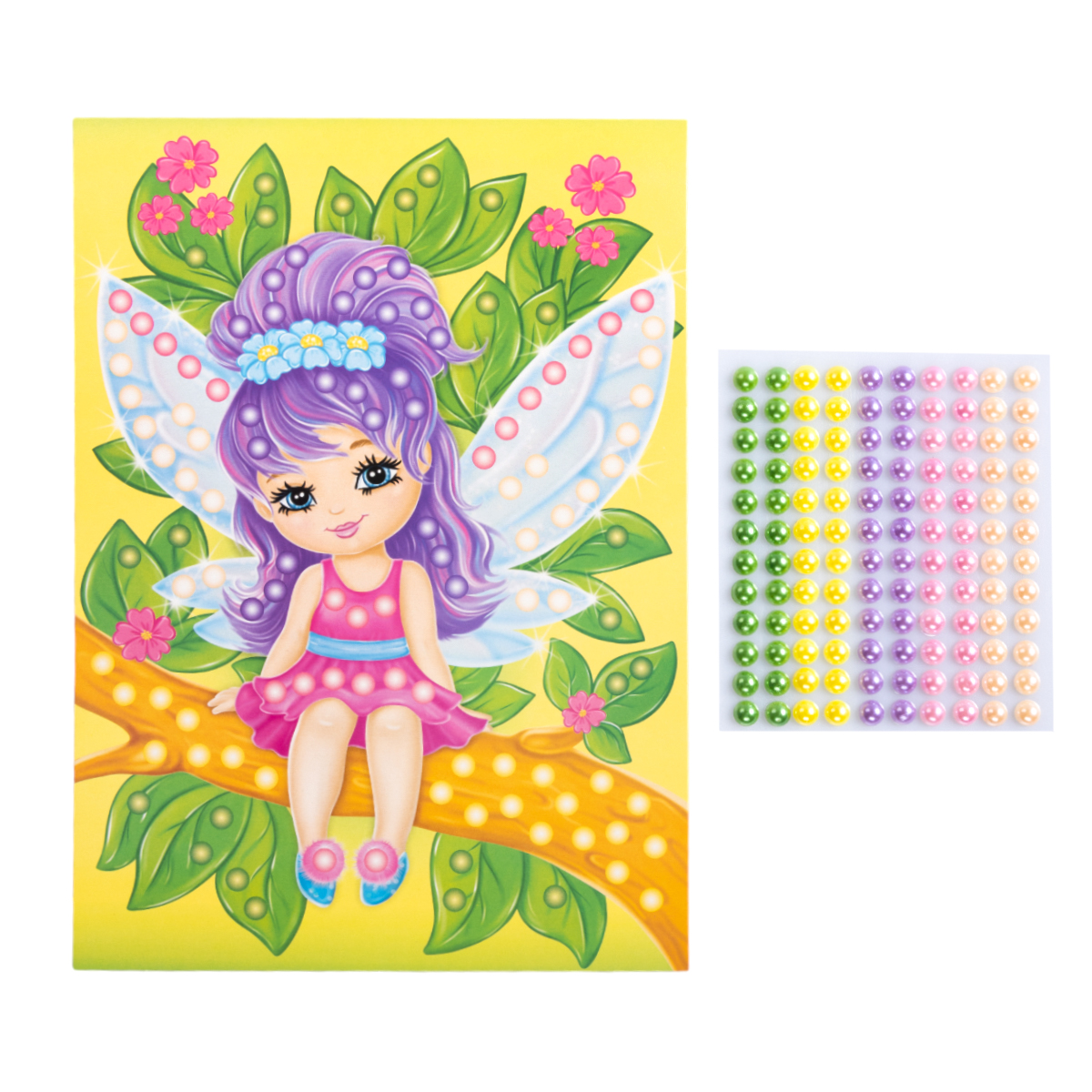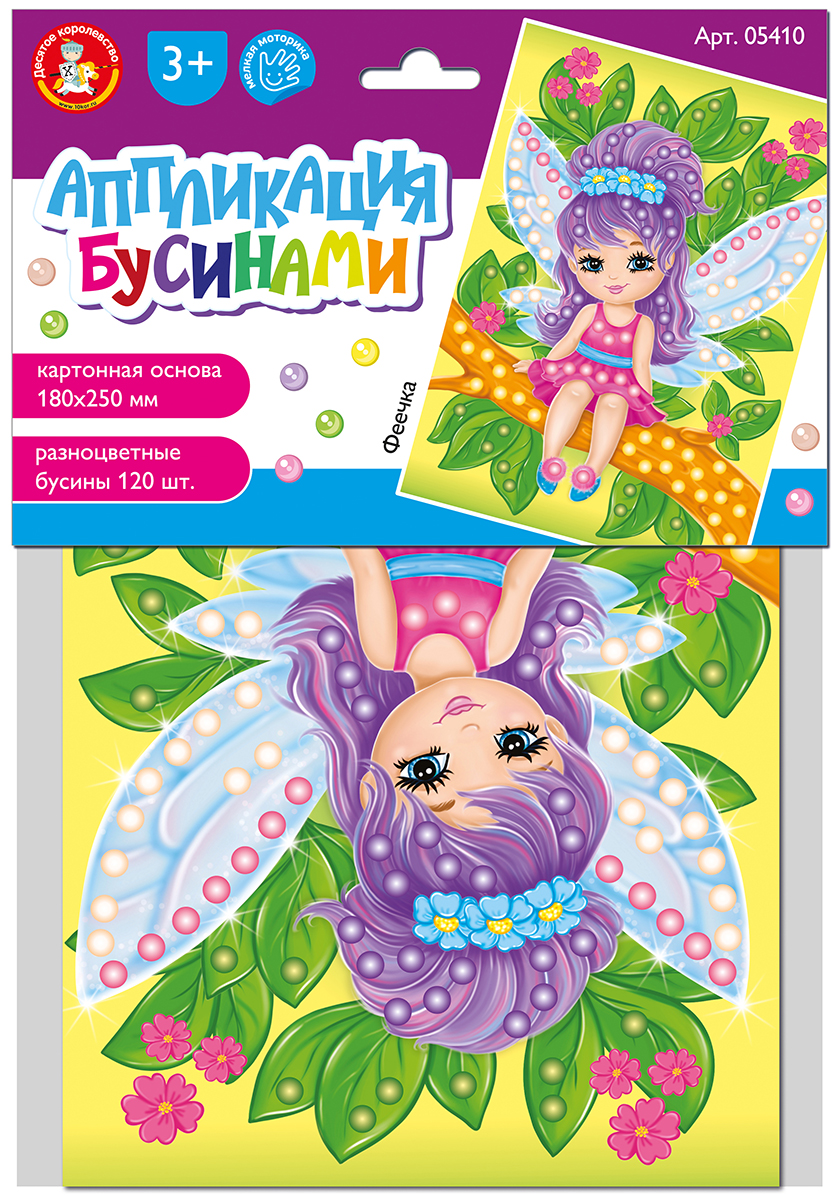 На качественной картонной основе с изображением Феи отмечены места для бусин. Ребенку необходимо аккуратно наклеить бусины нужного цвета на соответствующие точки.