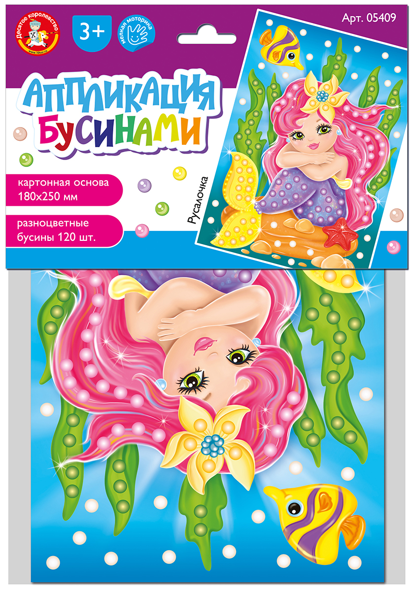 На качественной картонной основе с изображением Русалочки отмечены места для бусин. Ребенку необходимо аккуратно наклеить бусины нужного цвета на соответствующие точки.