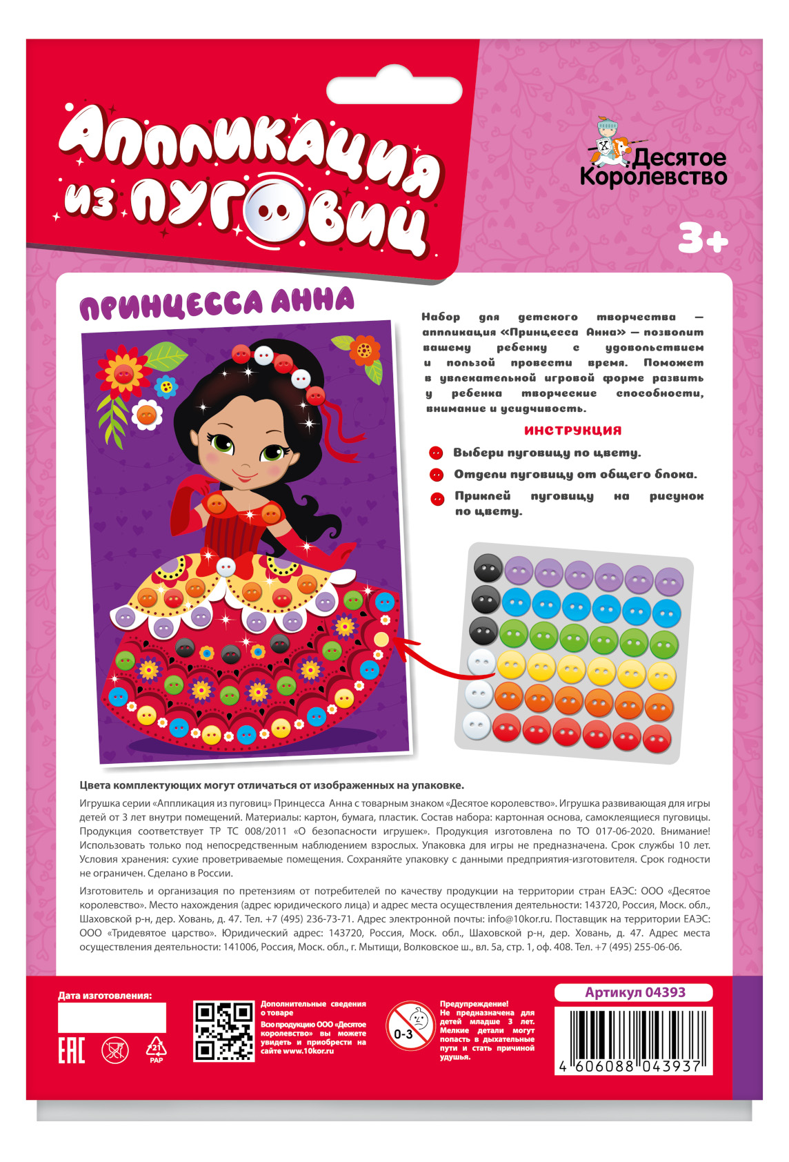 Набор для детского творчества Аппликация из пуговиц «Принцесса Анна» обязательно увлечет Вашего малыша яркими цветами и оригинальным исполнением! Данный набор является не только отличным развивающим пособием для Вашего малыша, но также может служить украшением интерьера или стать необычным подарком для друзей и близких.