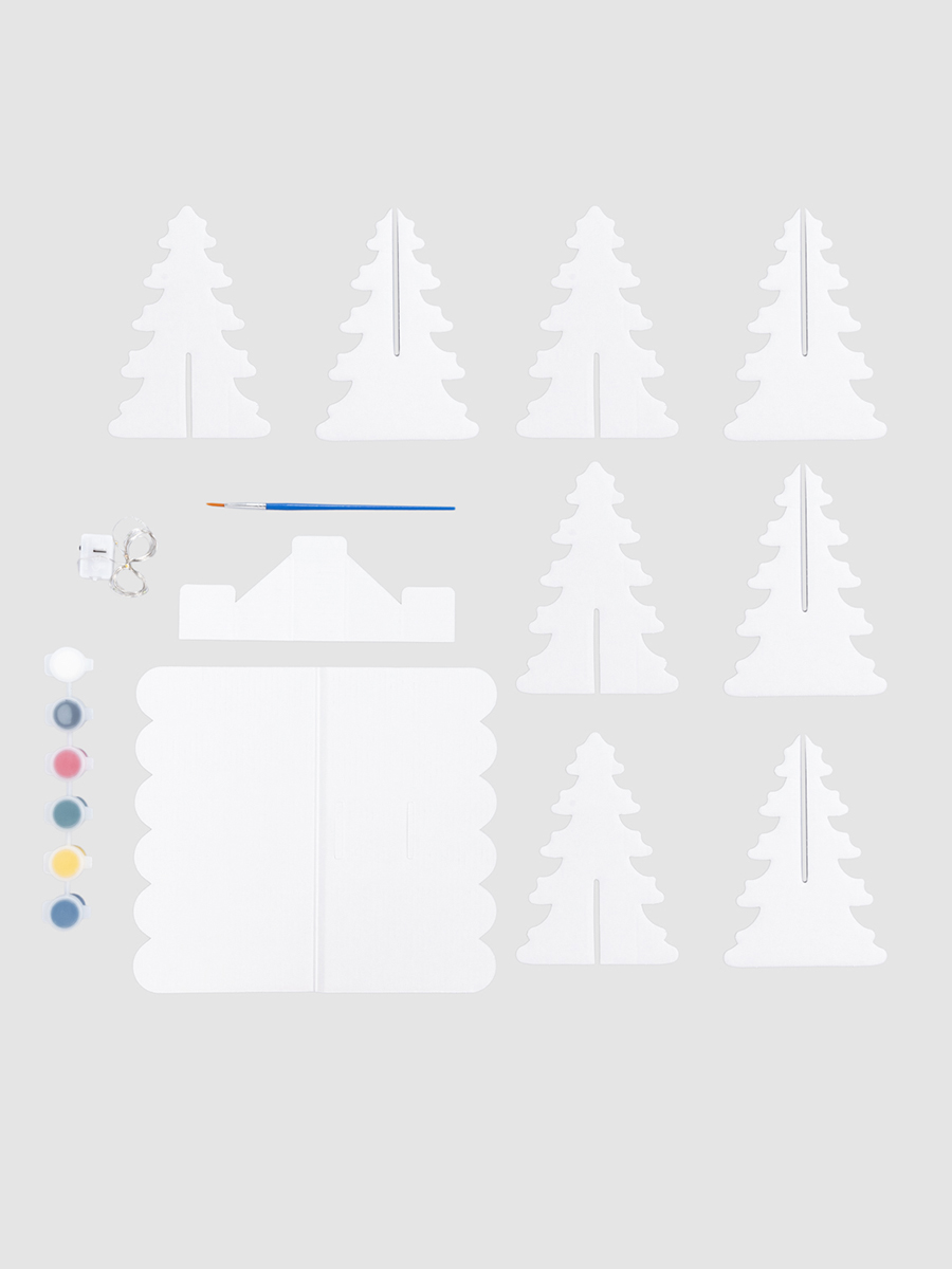 Разложите между домиком и ёлочками светодиодную гирлянду, входящую в набор.