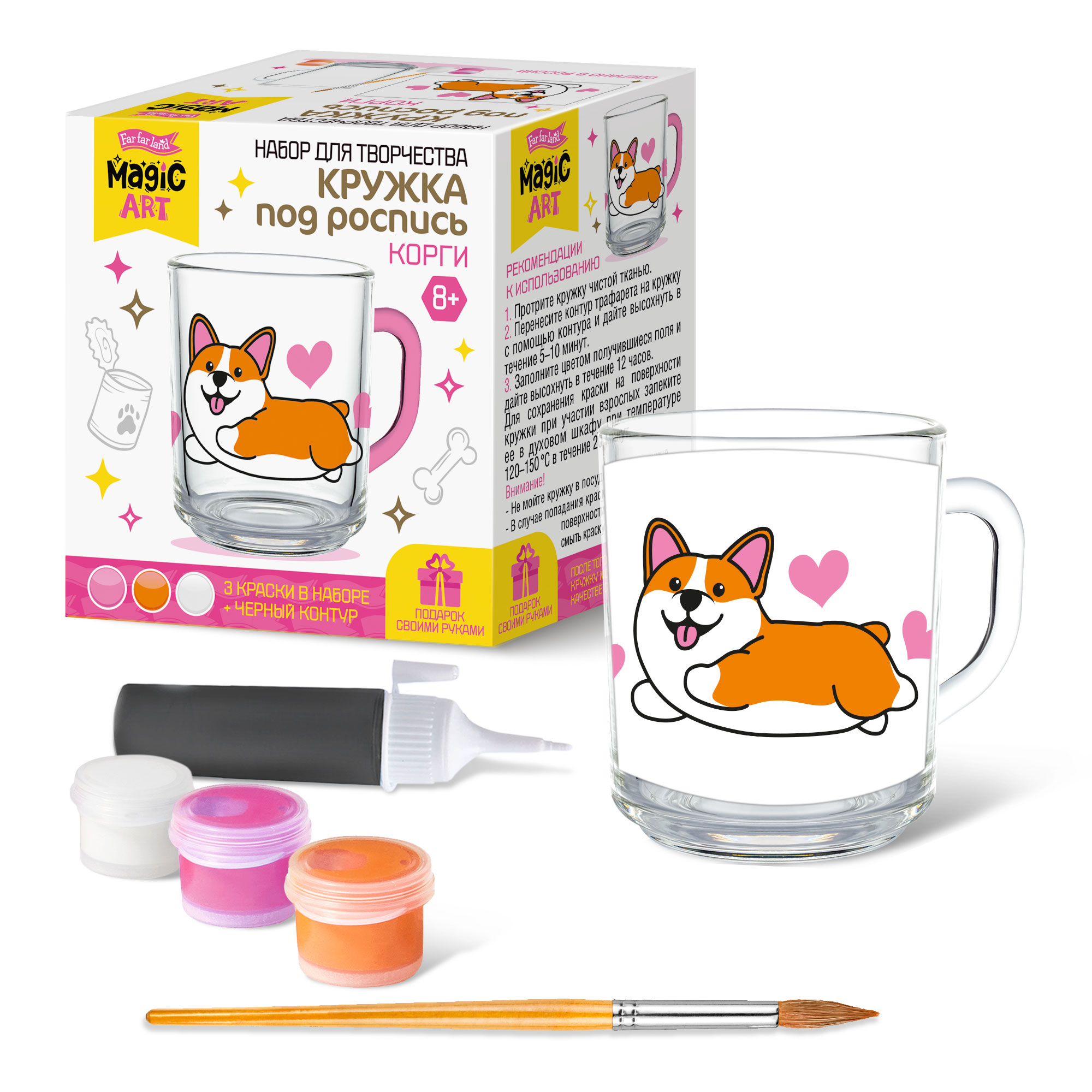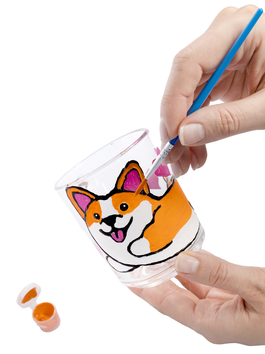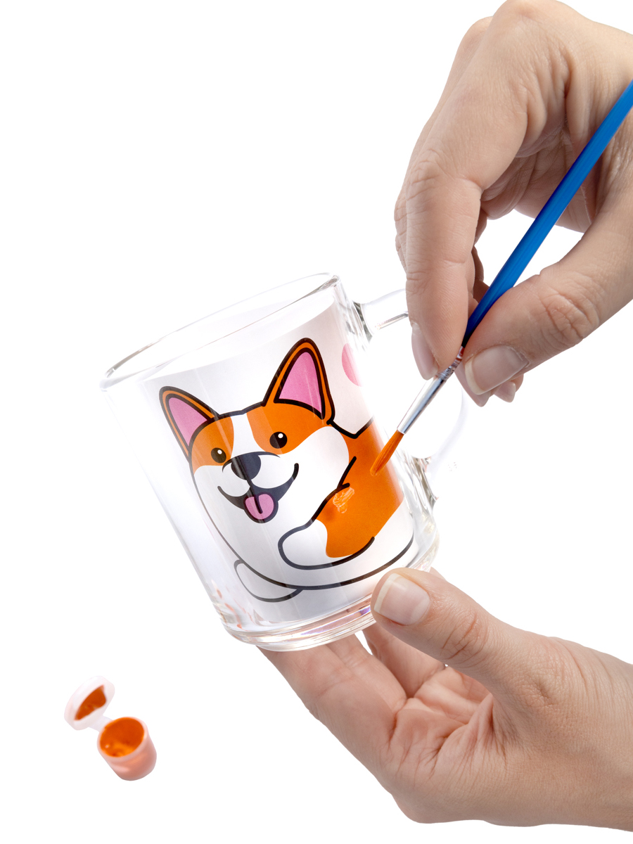Кружка под роспись «Корги» обязательно увлечёт вашего ребёнка яркими цветами и оригинальным исполнением! Используя шаблон, Вы сможете сделать неповторимую композицию на стеклянной поверхности.. Кроме того, необычно оформленная кружка может стать великолепным подарком близким и друзьям. Состав набора: