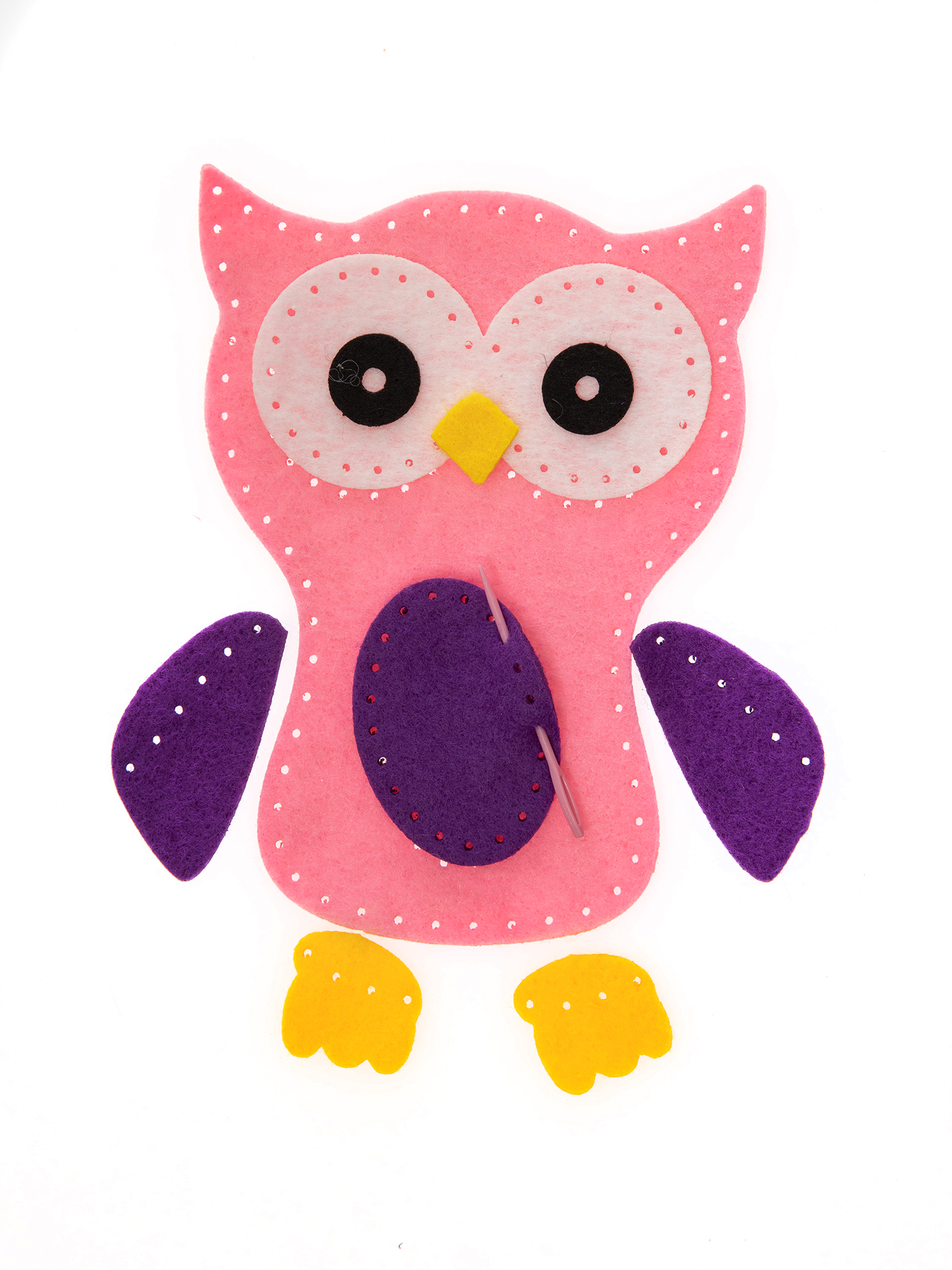 1. Пришейте деталь с глазами и клювом к лицевой детали туловища совы, совмещая соответствующие отверстия.