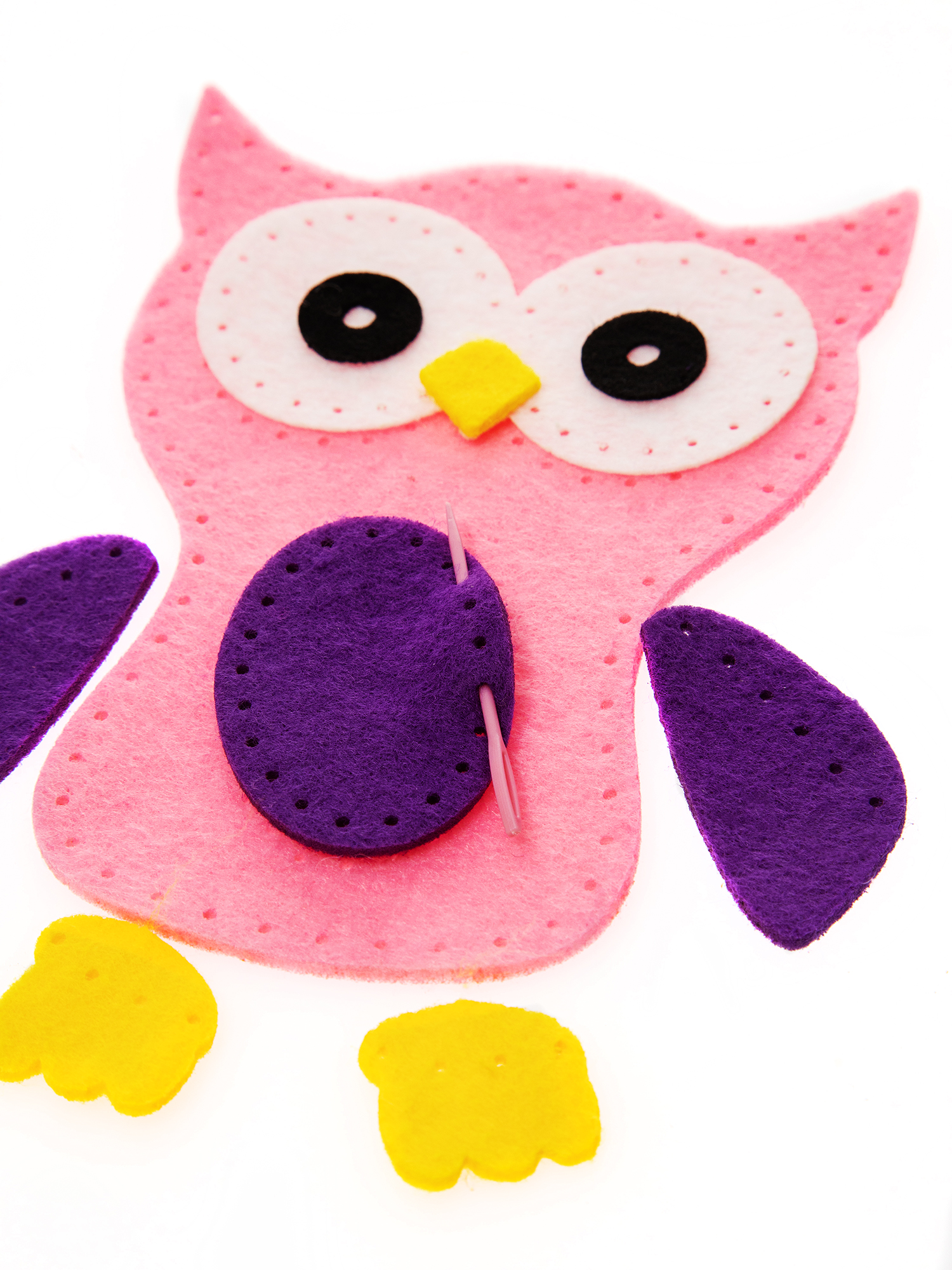 2. Пришейте животик к лицевой детали туловища совы, совмещая соответствующие отверстия.