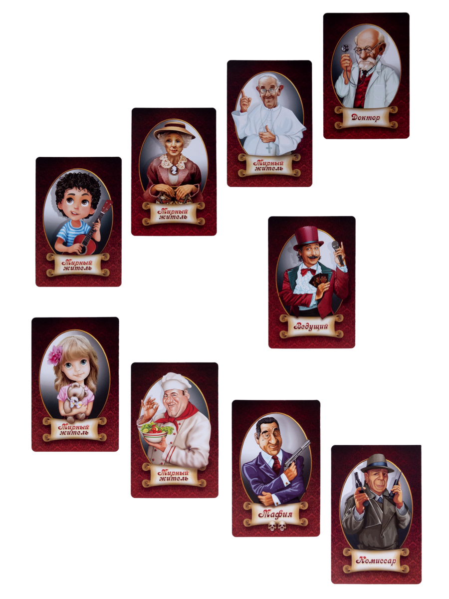 Единого свода правил карточной игры «Мафия» не существует. Наш набор карт предназначен для игры в самый простой и распространенный вид «салонной мафии». Причем в двух разных вариантах. Но возможности игры этим не ограничиваются. Для того, чтобы игра стала более универсальной, мы пошли по следующему пути. Если невозможно написать универсальные правила, можно попробовать сделать универсальным набор карт. Это дает возможность использовать их в других вариантах игры. Именно так мы и поступили! Персонажи нарисованы так, что один из «мирных жителей» легко превращается в «маньяка», другой в «девушку», третий уже в рясе «священника» и так далее. Как играют эти персонажи, если они используются, Вы можете прочитать в интернете. Там же можно найти правила к тем вариантам игры, где эти персонажи задействованы.