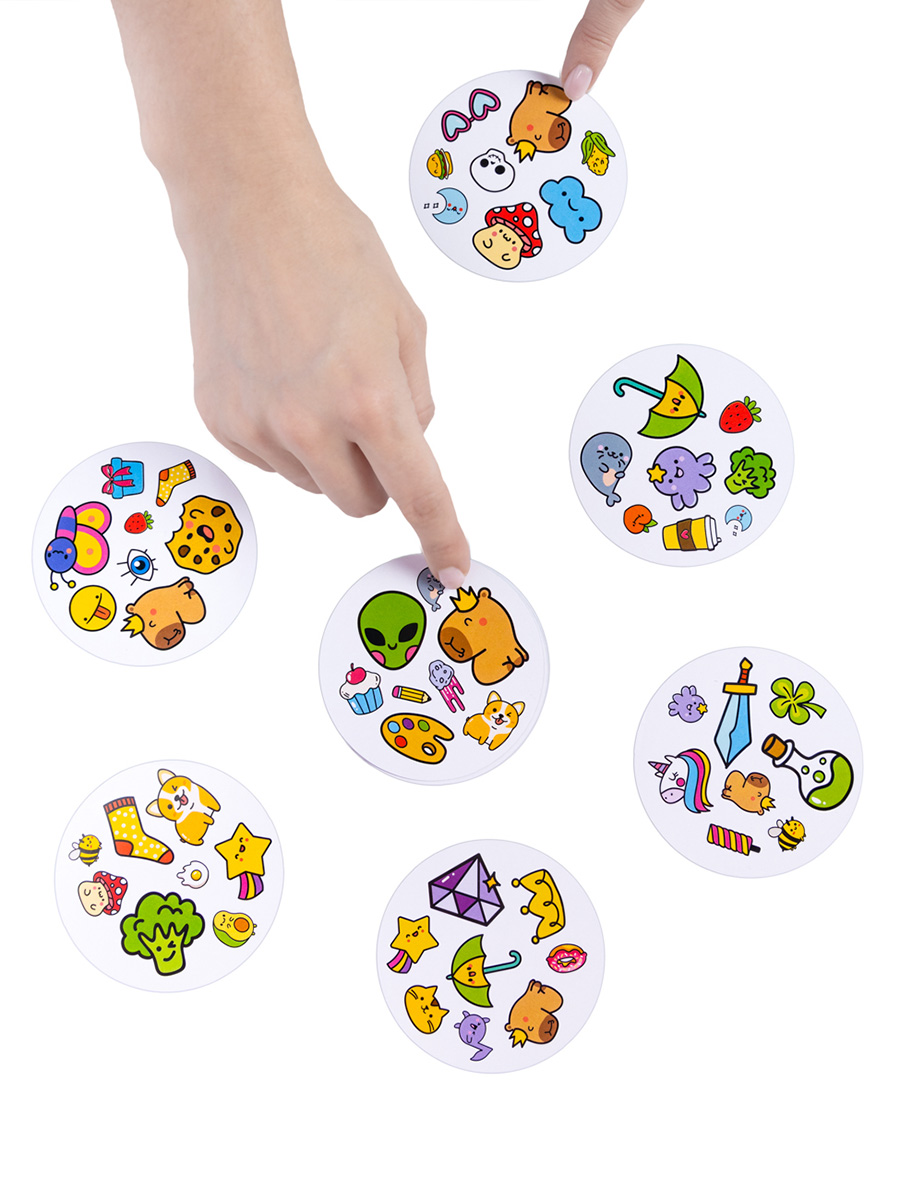 По команде участники одновременно переворачивают свои карточки и начинают искать картинки, совпадающие с картинками на верхней карточке в стопке в центре стола.