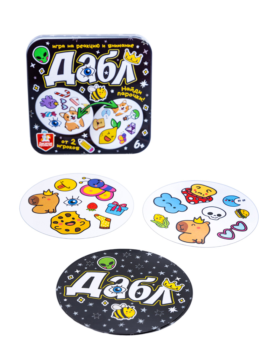 Настольная игра Дабл «Найди парочки!» - это интересная игра на внимательность в жестяной коробочке.Благодаря компактным размерам коробочки (9х9х2,5 см), игру удобно брать с собой в дорогу, на улицу, в компанию. Она поместится даже в кармане.
