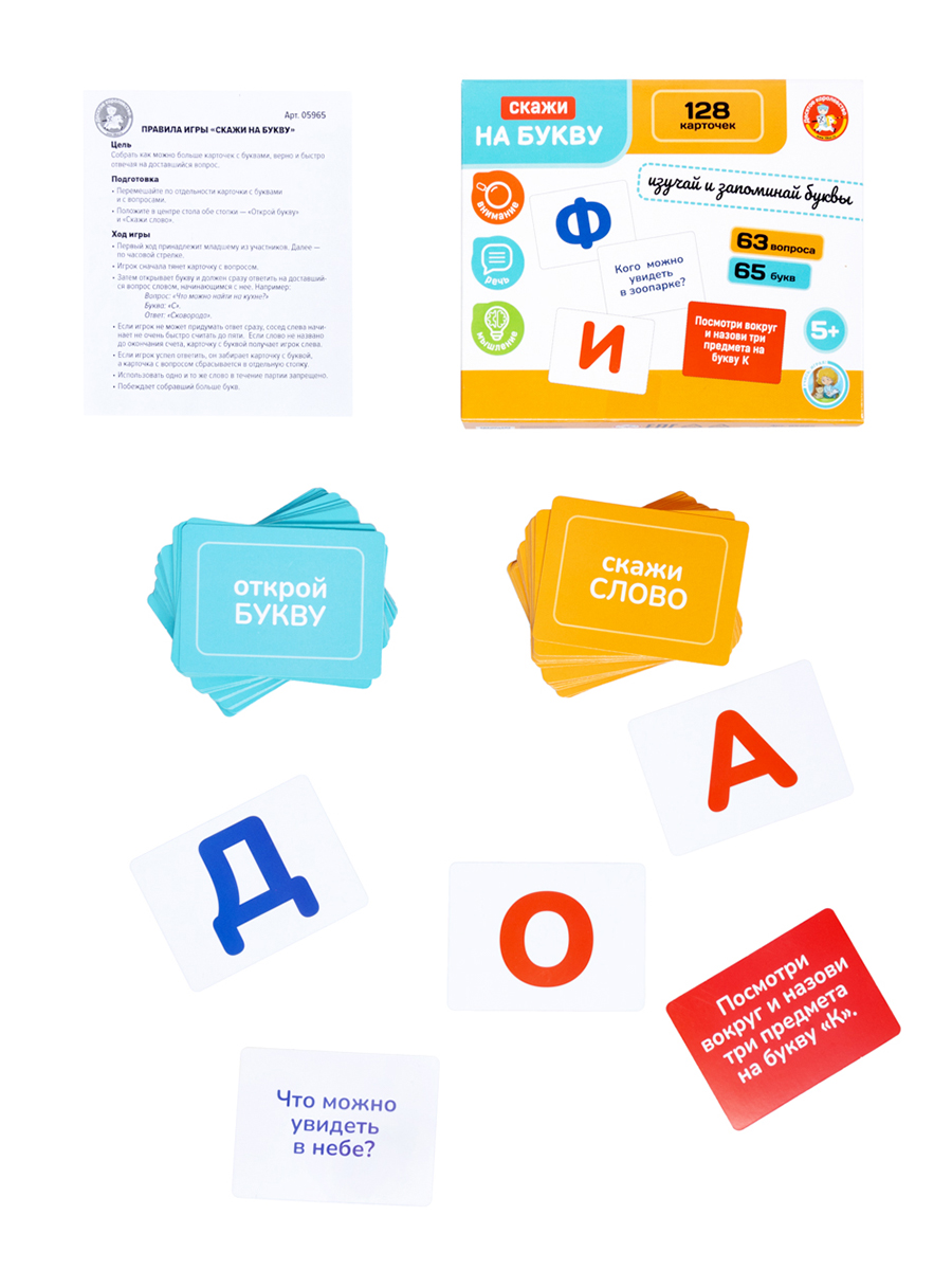 Развивающая игра «Скажи на букву» — это отличная возможность весело и с пользой провести время всей семьей. Благодаря увлекательному процессу, игроки учатся быстро находить слова на заданные буквы, что значительно развивает речевые навыки и внимание. Каждый раунд игры ставит перед участниками новую задачу — быстро и правильно отвечать на вопросы, что способствует активному пополнению словарного запаса.Состав: