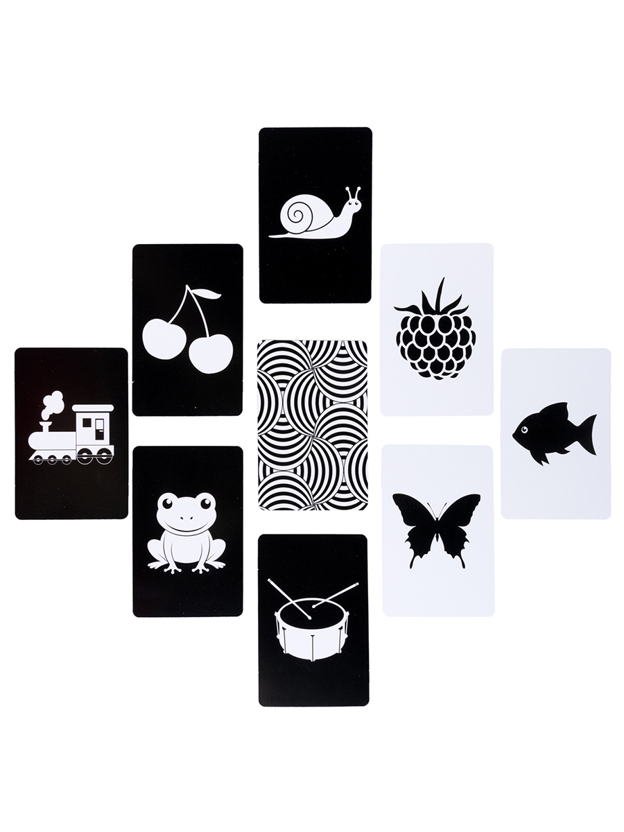 Черно-белые карточки - это первые карточки вашего малыша и ценный инструмент для стимуляции зрительной системы новорожденного. Контрастные изображения помогают развивать зрение, внимание и концентрацию уже с первых недель жизни. Обучающий набор включает в себя 64 картинки на разные темы: животные, предметы, формы и многое другое. Идеально подходит для совместных занятий и раннего развития малыша.