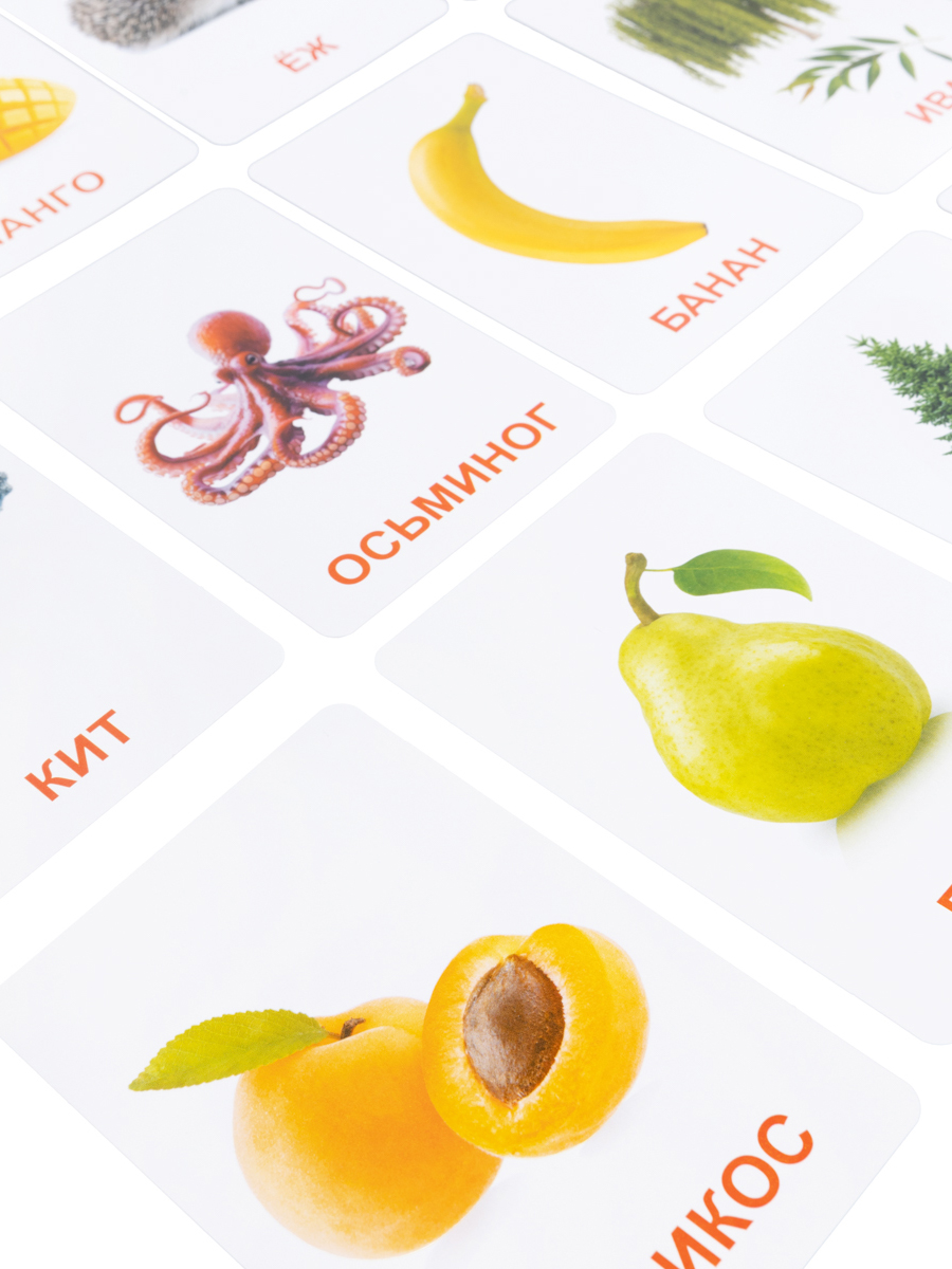 1. Подготовьте 5–10 карточек на одну тему (животные, транспорт, фрукты и т. д.).