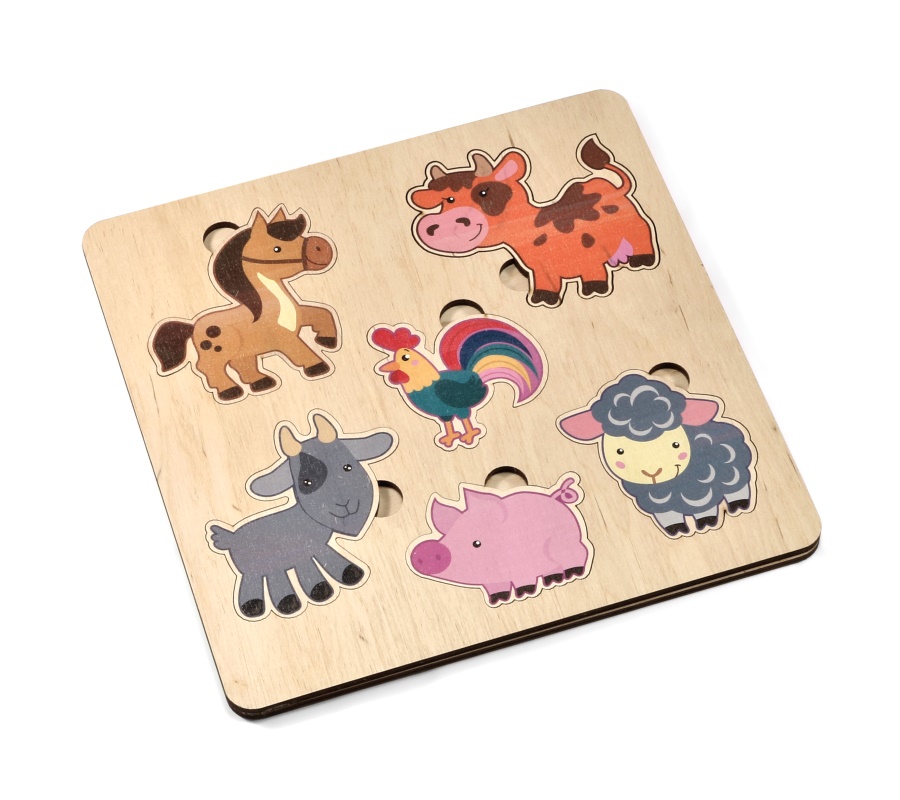 Деревянный пазл «Домашние животные» — это простая развивающая игра для малышей от 3-х лет.