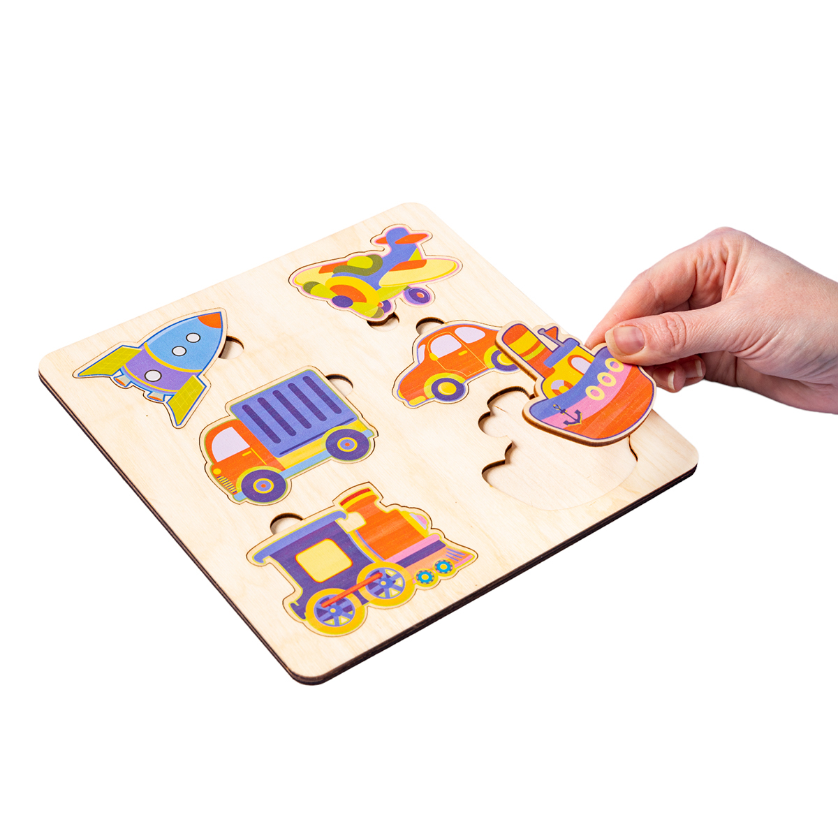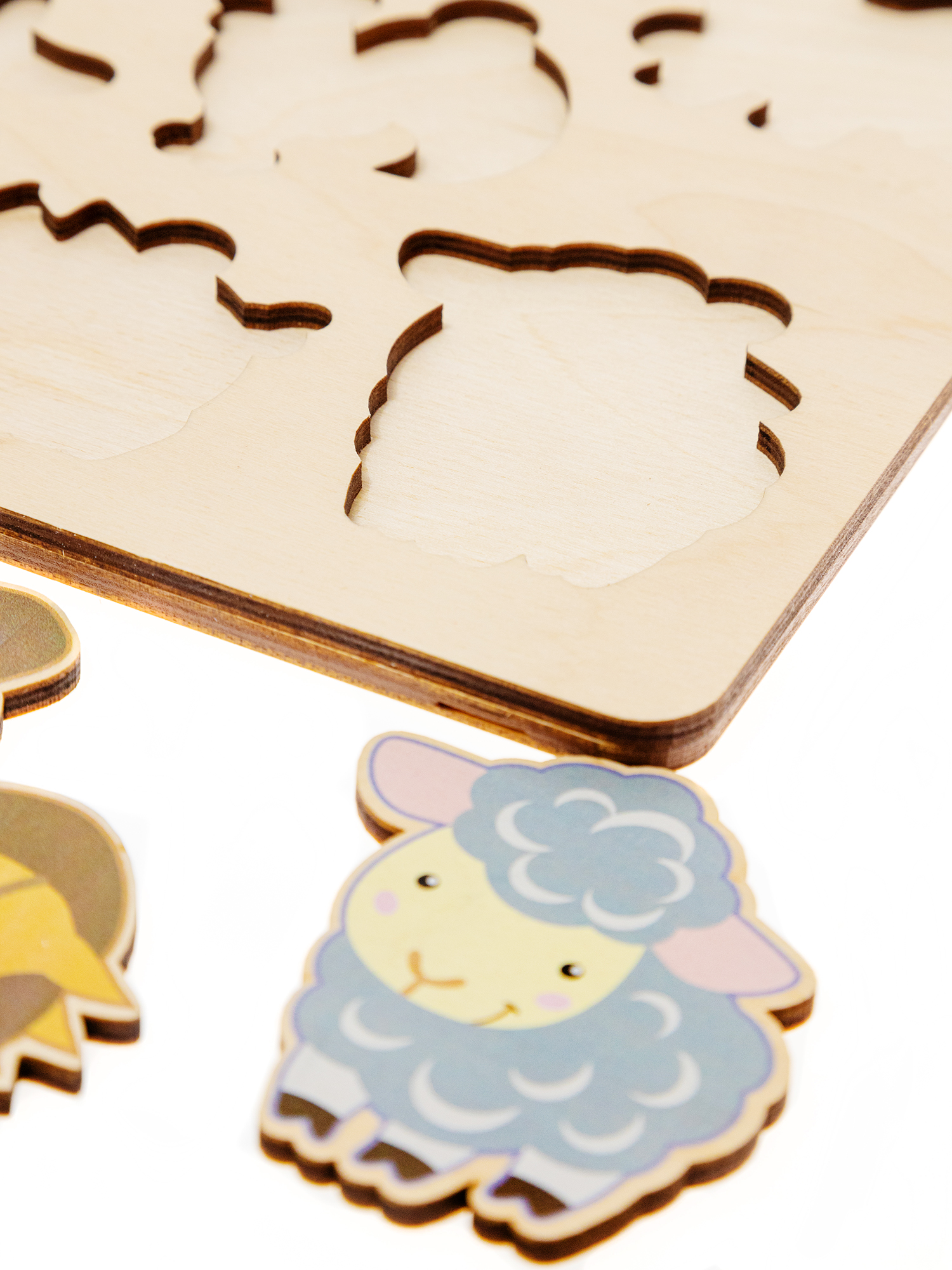Игра изготовлена из березовой фанеры и полностью безопасна для ребенка: все элементы пазла имеют крупный размер и тщательно шлифуются, игровое поле имеет скругленные углы. Рисунки наносятся на поверхность пазлов с помощью техники прямой печати по дереву, что увеличивает износостойкость игры.
