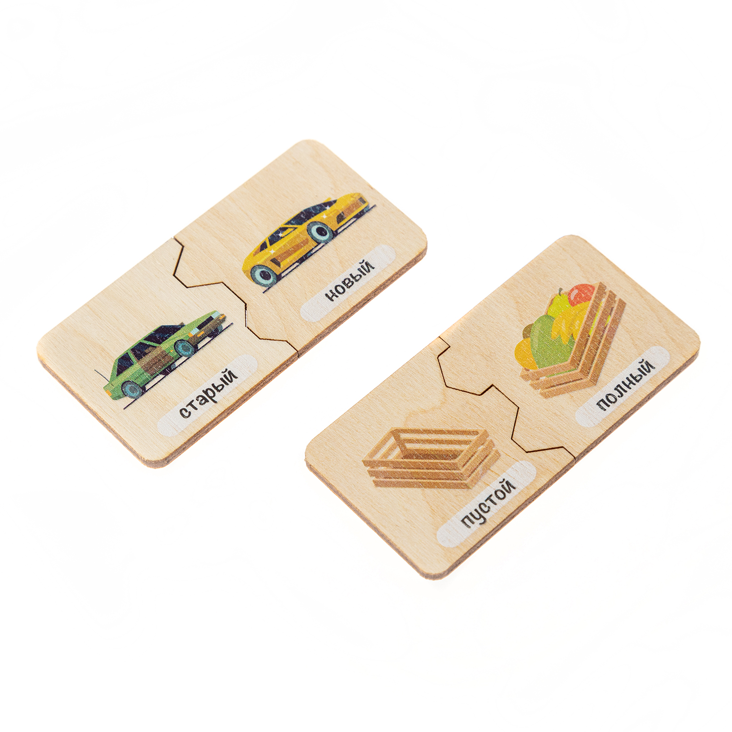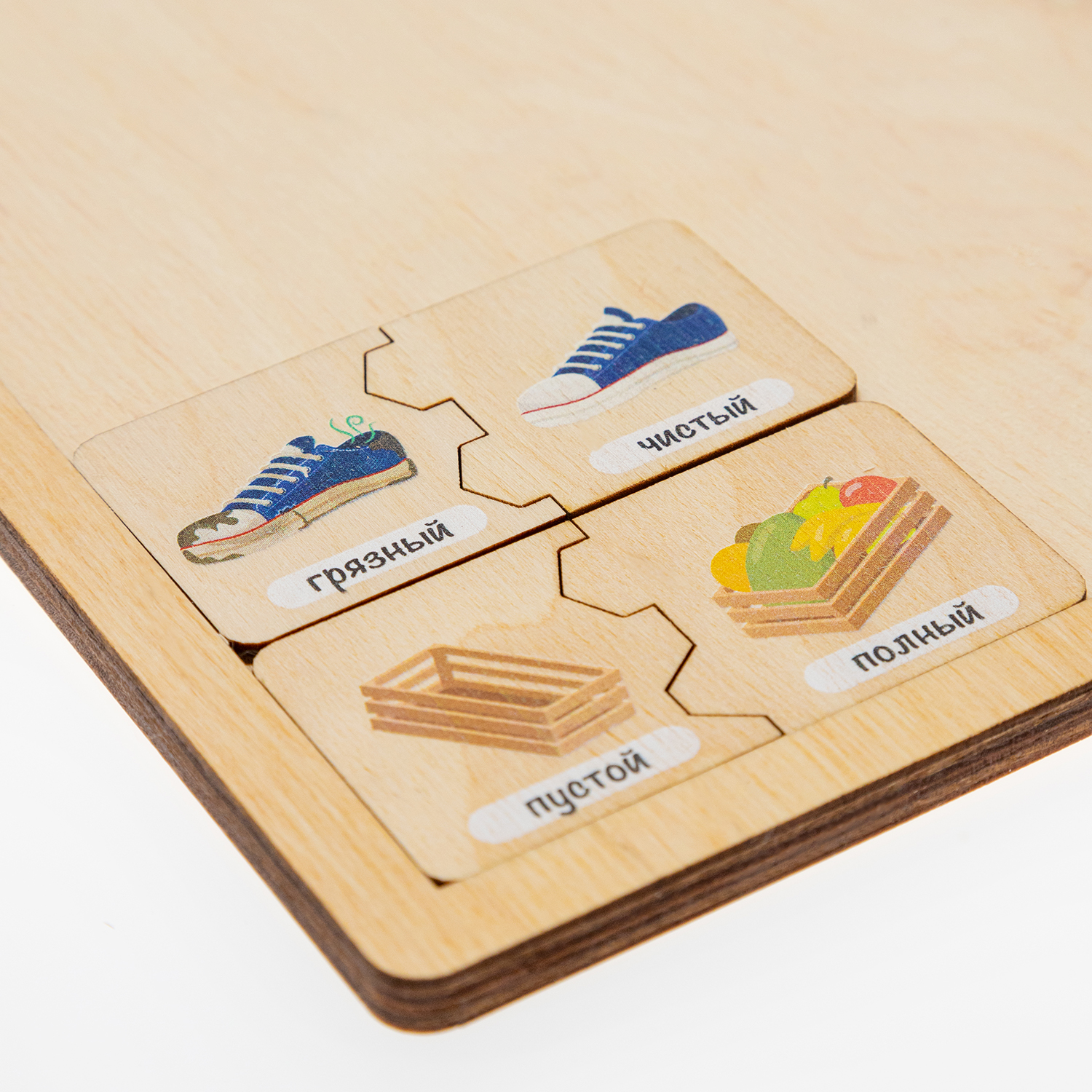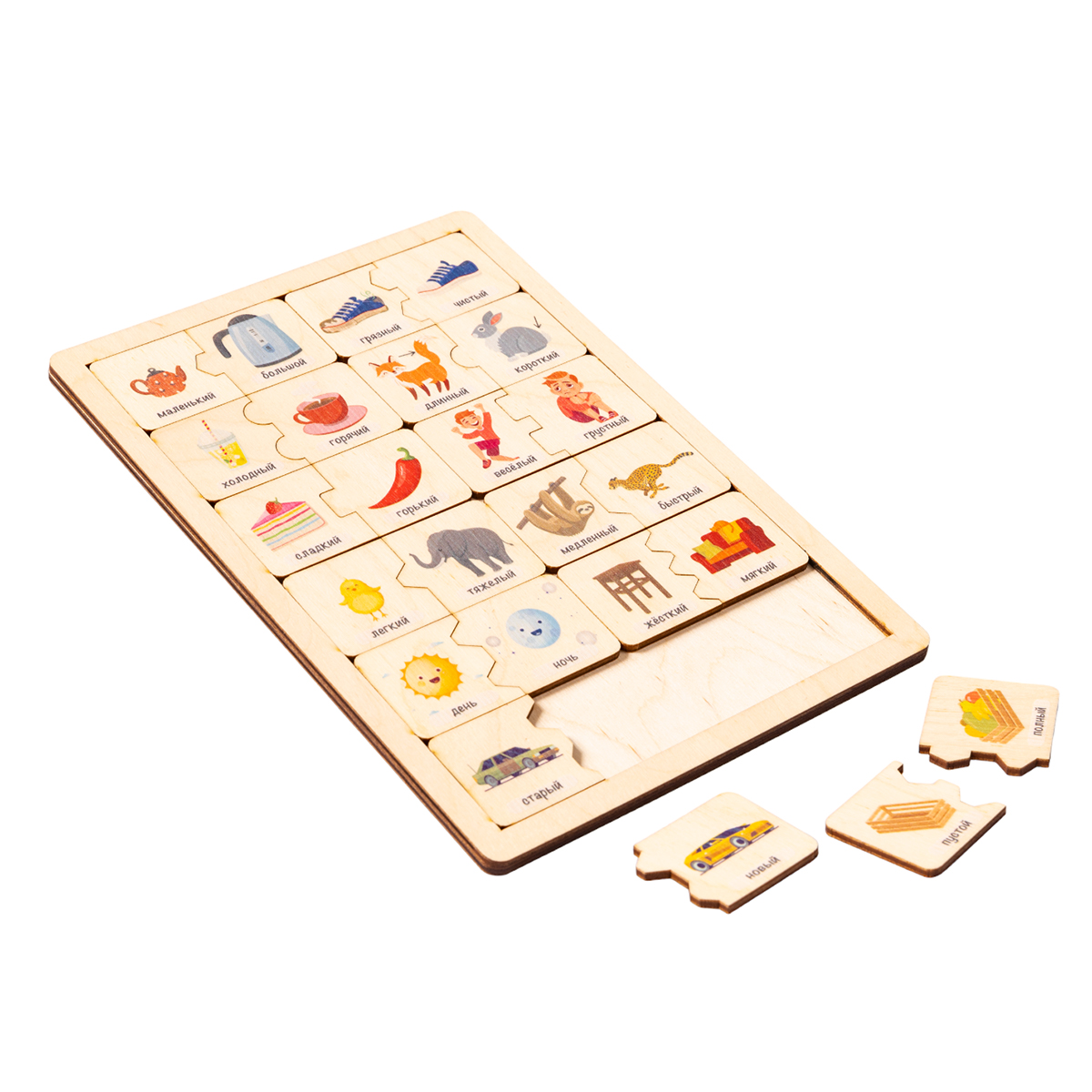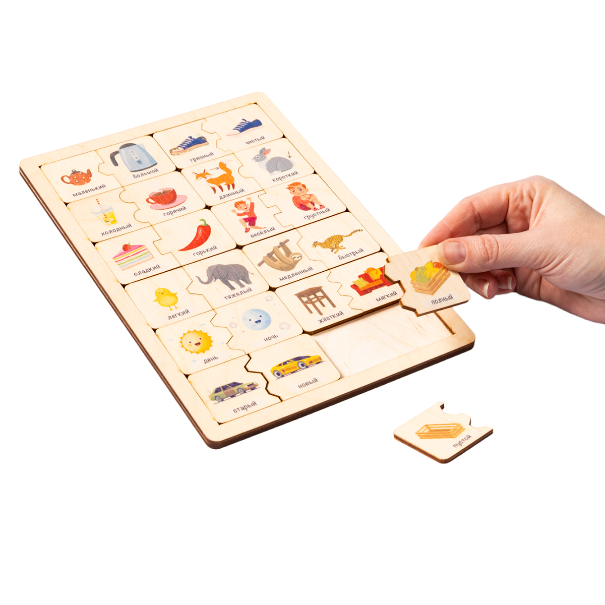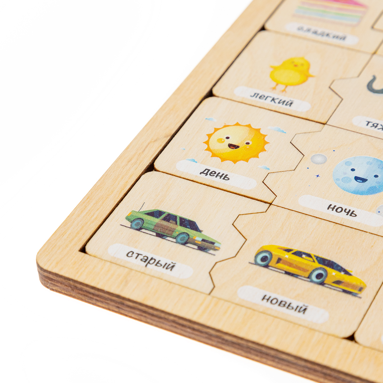 Деревянный пазл «Противоположности» – это развивающая головоломка, в которой малышу предстоит правильно подобрать пары антиподов.