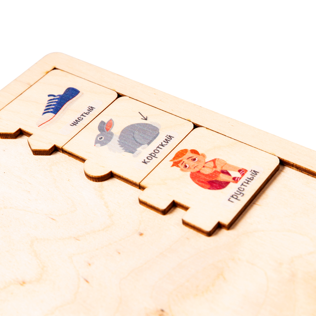 Малышу предстоит собрать 12 пар антиподов по признаку: «большой-маленький», «грязный-чистый», «медленный-быстрый», «лёгкий-тяжёлый» и т.д.