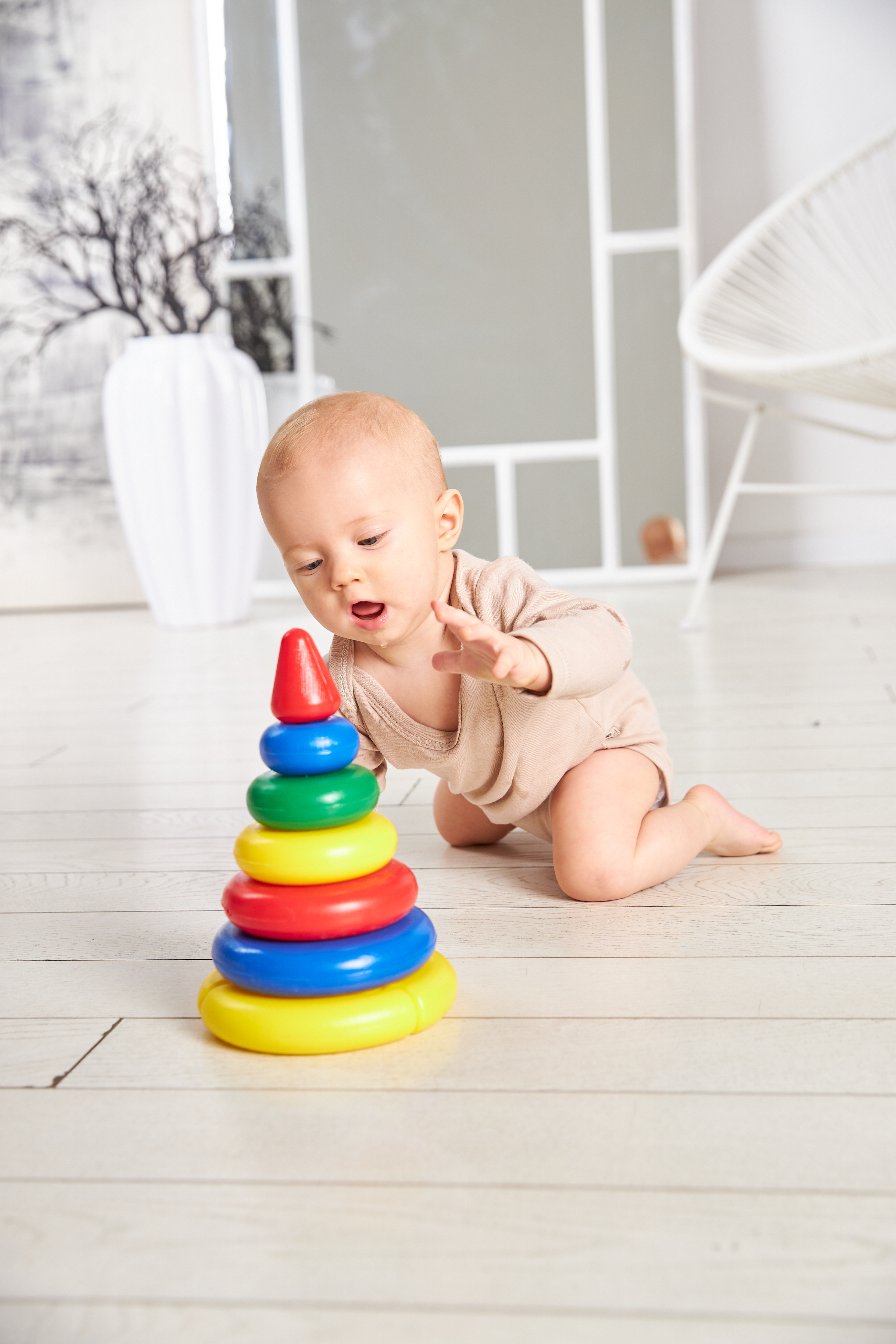 Разный диаметр и цвет колец развивают зрительное восприятие и глазомер ребенка. Собирая пирамидку, дети научатся координировать движения рук, это хорошая подготовка к более сложной познавательной деятельности.