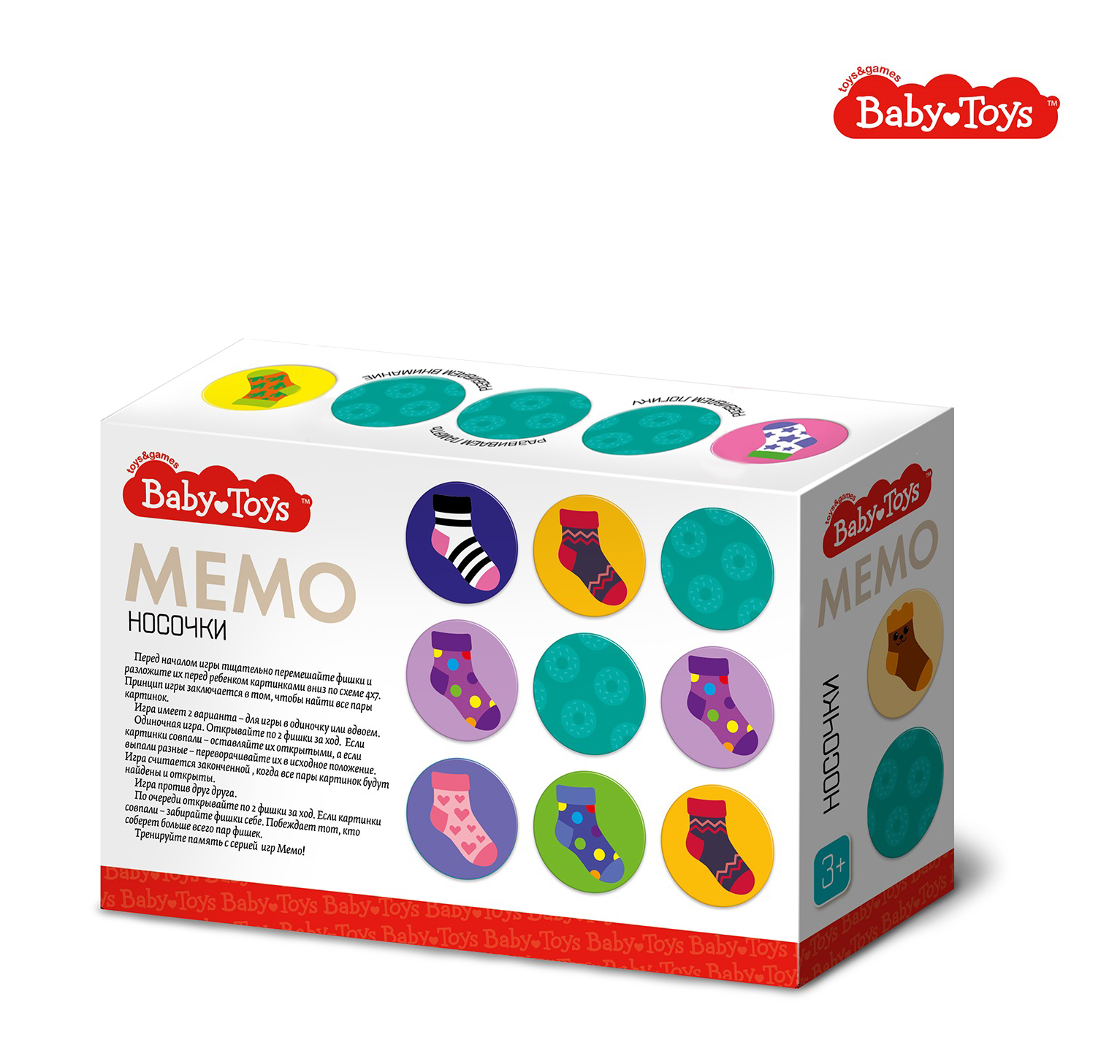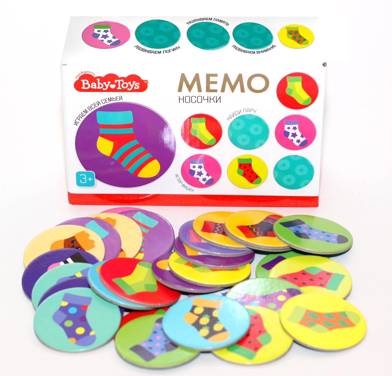 Тренируйте память с увлекательной игрой с механикой «найди пару» – МЕМО «Носочки» из серии развивающих игр для самых маленьких BabyToys. Ищите пары красочных носочков одинакового цвета или орнамента среди 28 картонных фишек и весело проводите время всей семьёй!