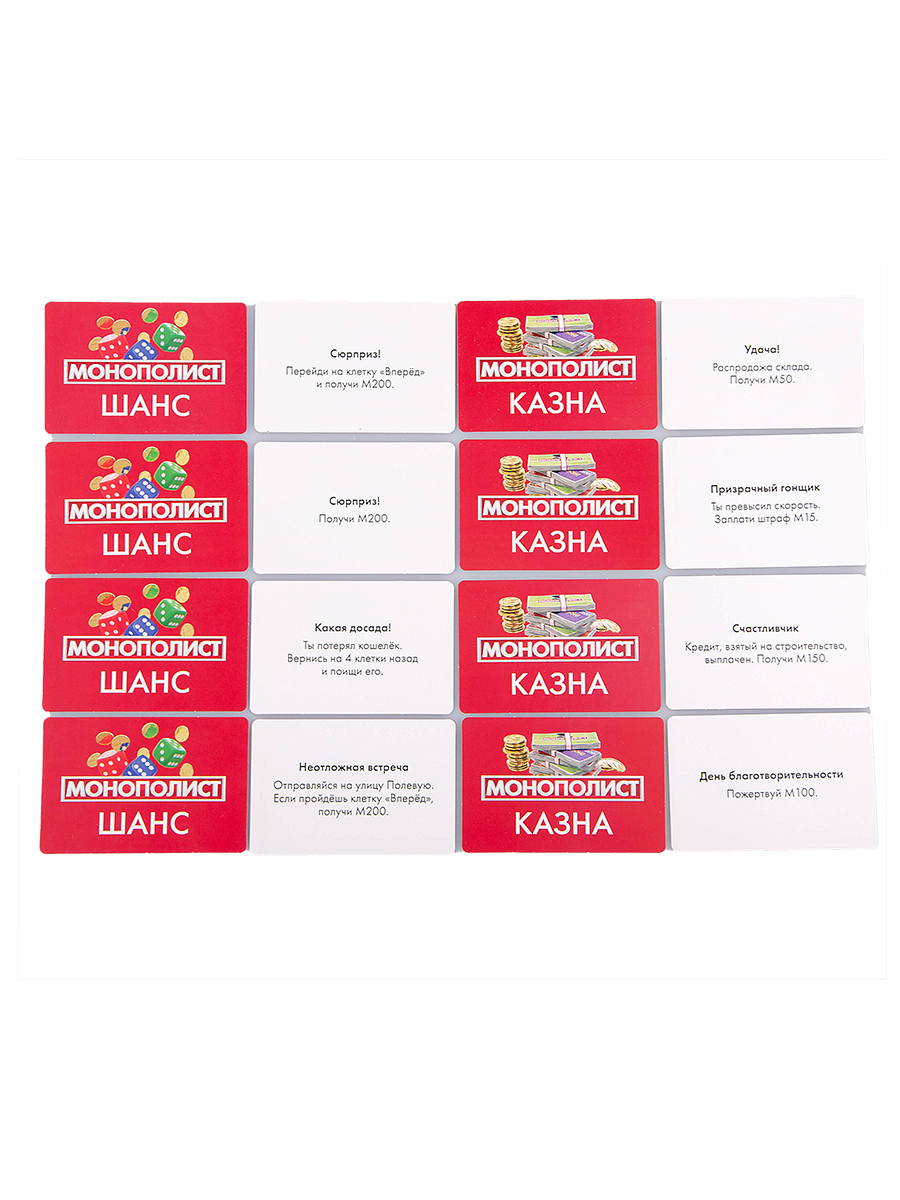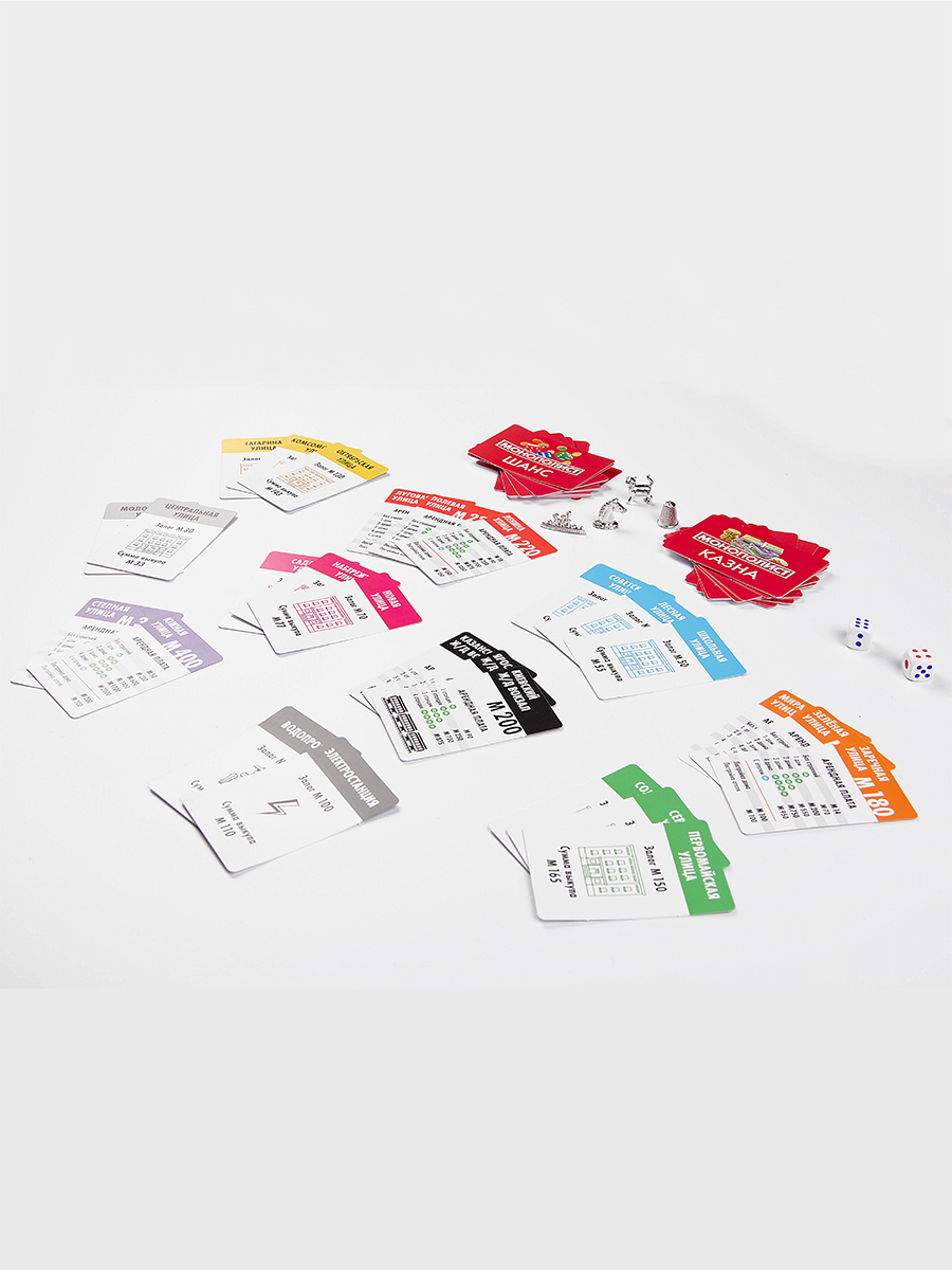 - игровые карточки - 64 шт. (8*5,5 см) 28 карточек собственности, 18 карточек "казна" и 18 карточек " ШАНС