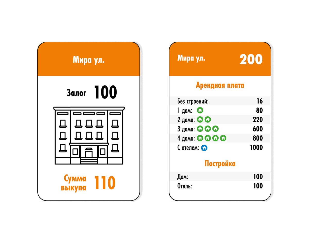Когда у вас не хватает наличных для арендной платы, вы можете заплатить одну часть деньгами, а вторую — участками, на которых еще нет домов или отелей. Стоимость определяется по договоренности игроков.
