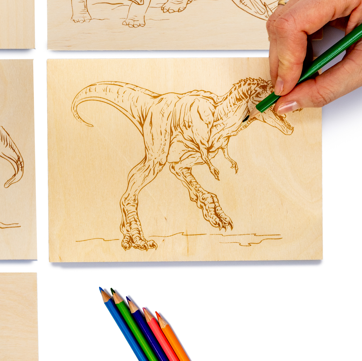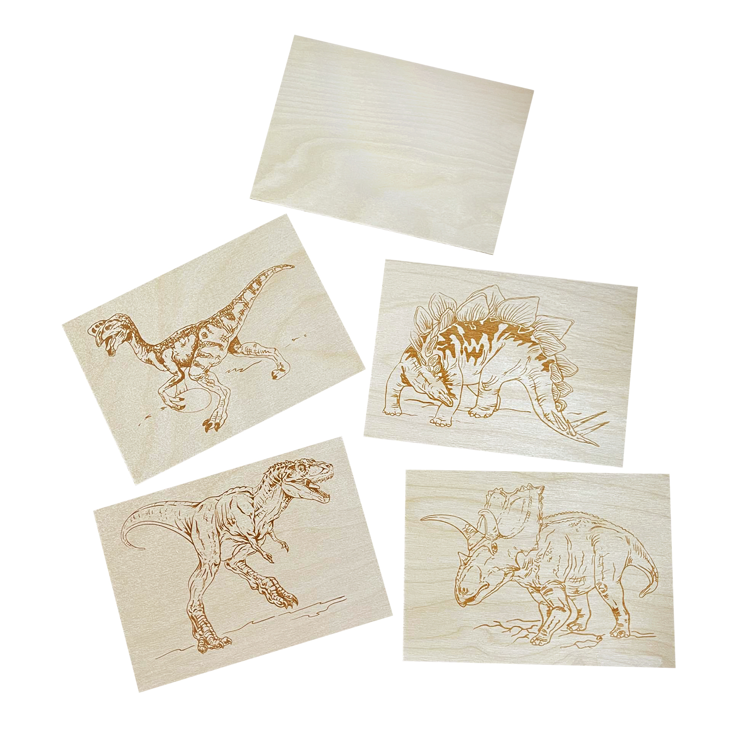 Доски с рисунком для выжигания «Тираннозавр,Трицератопс, Стегозавр, Овираптор» серия «Динозавры» (5 штук)