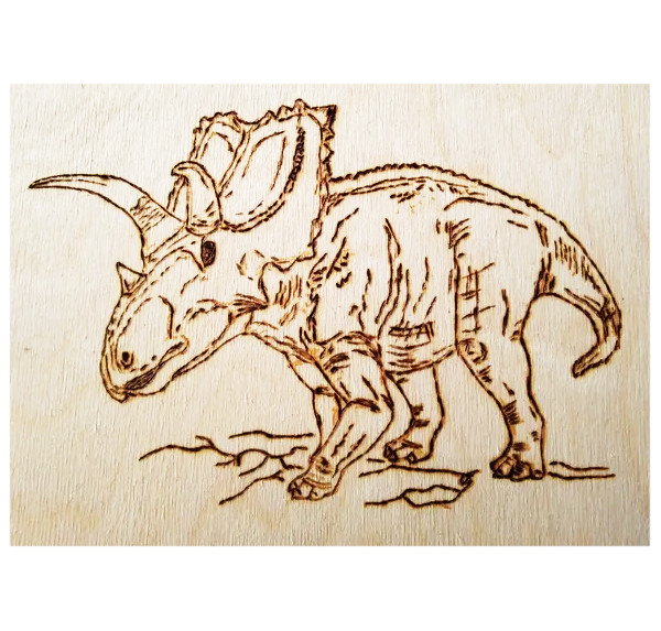 Большое количество линий и штрихов, так необходимых для создания образа динозавра, предполагает наличие достаточно хороших навыков выжигания у исполнителя, поэтому набор предназначен для детей старше 6 лет, уже освоивших технику выжигания.