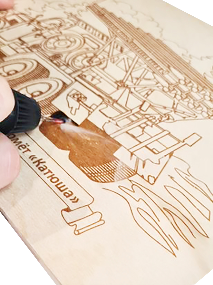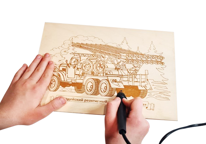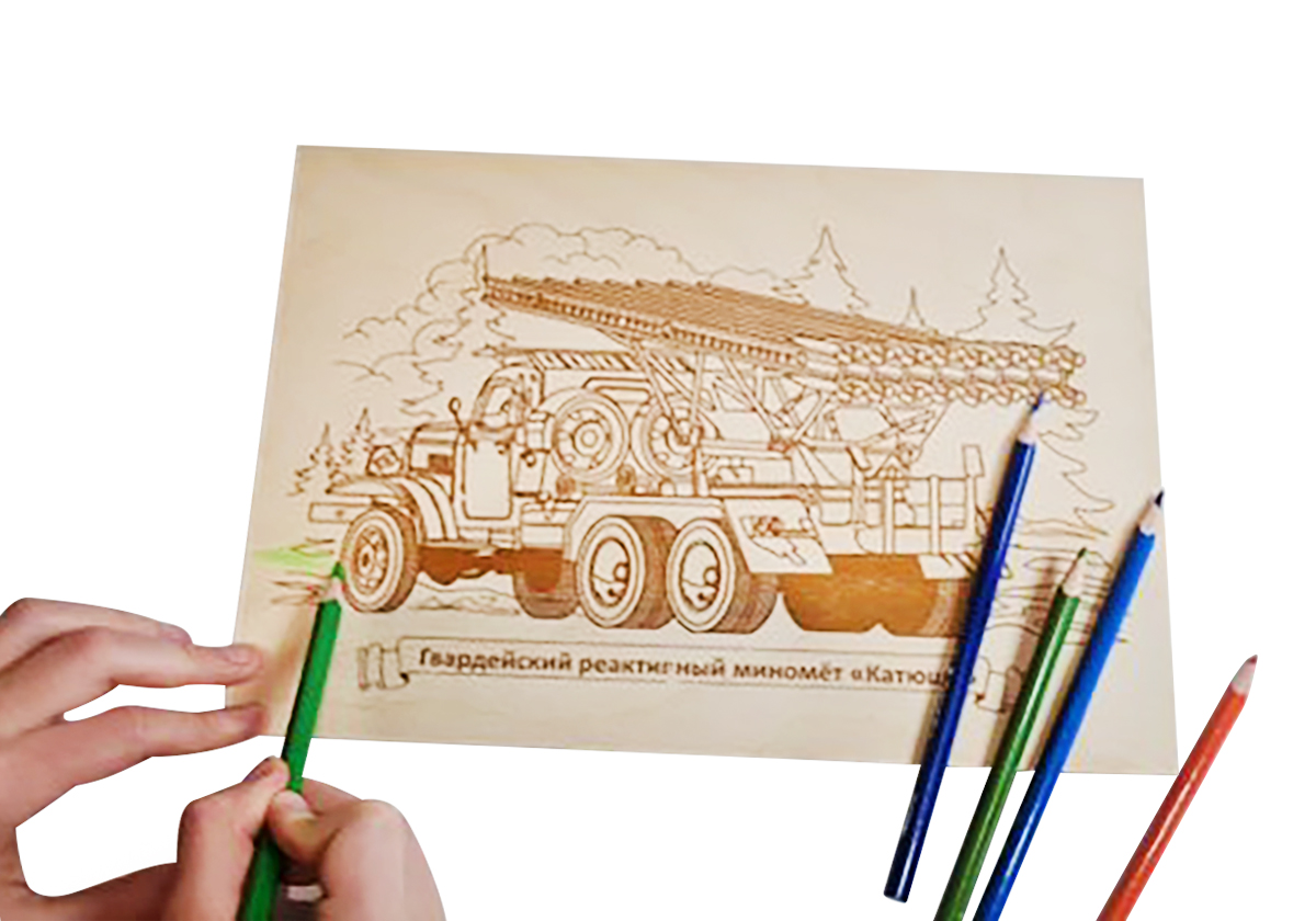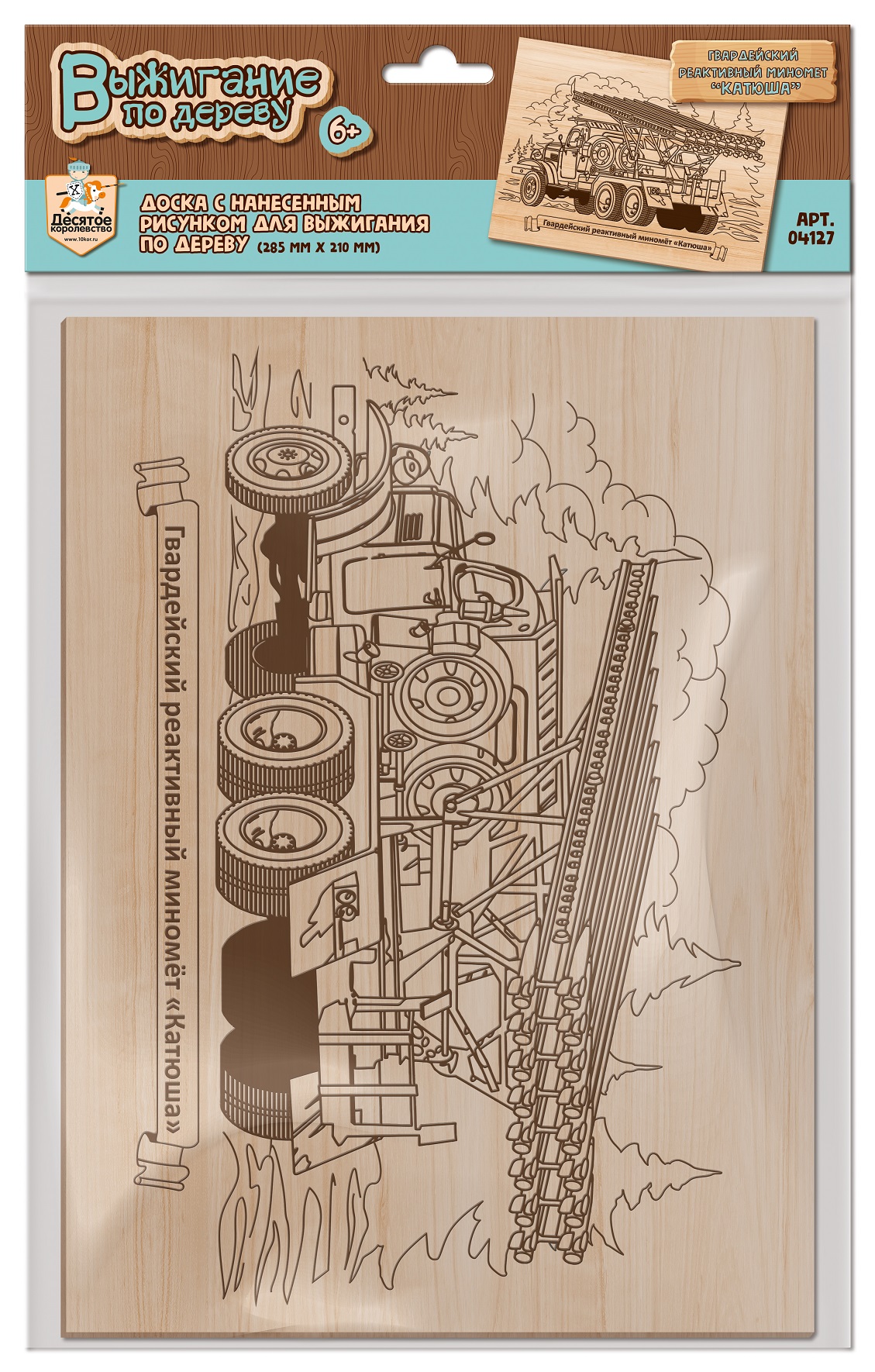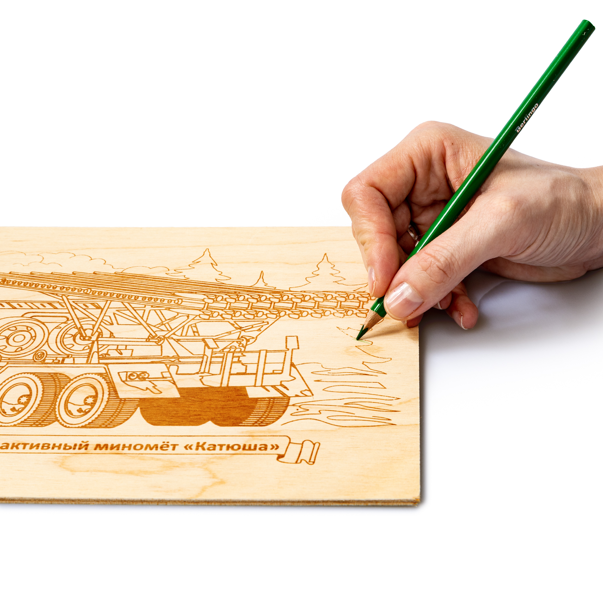 С данной доской ваш ребёнок сможет выжечь картинку, на которой изображён миномёт «Катюша» – советская гвардейская реактивная боевая машина.
