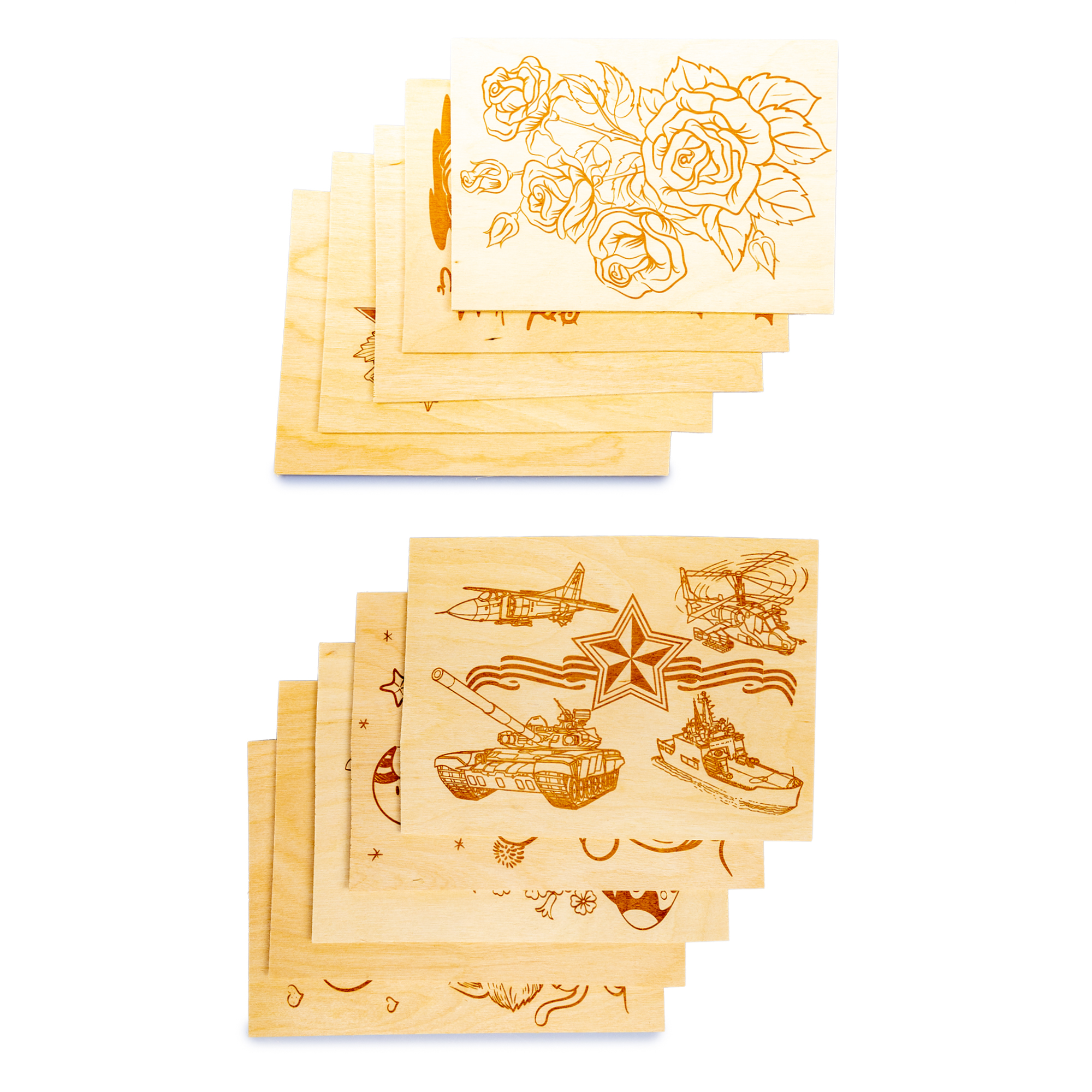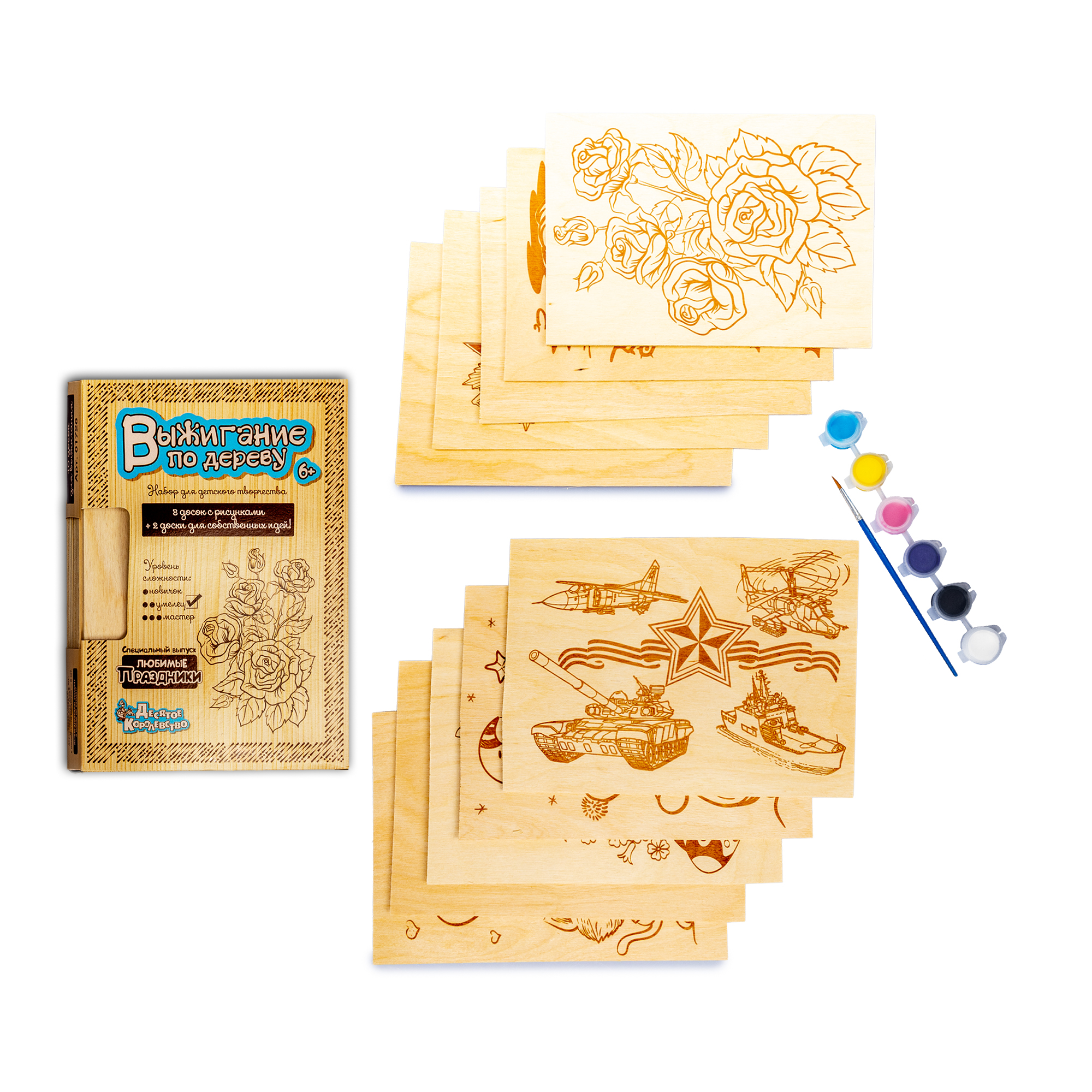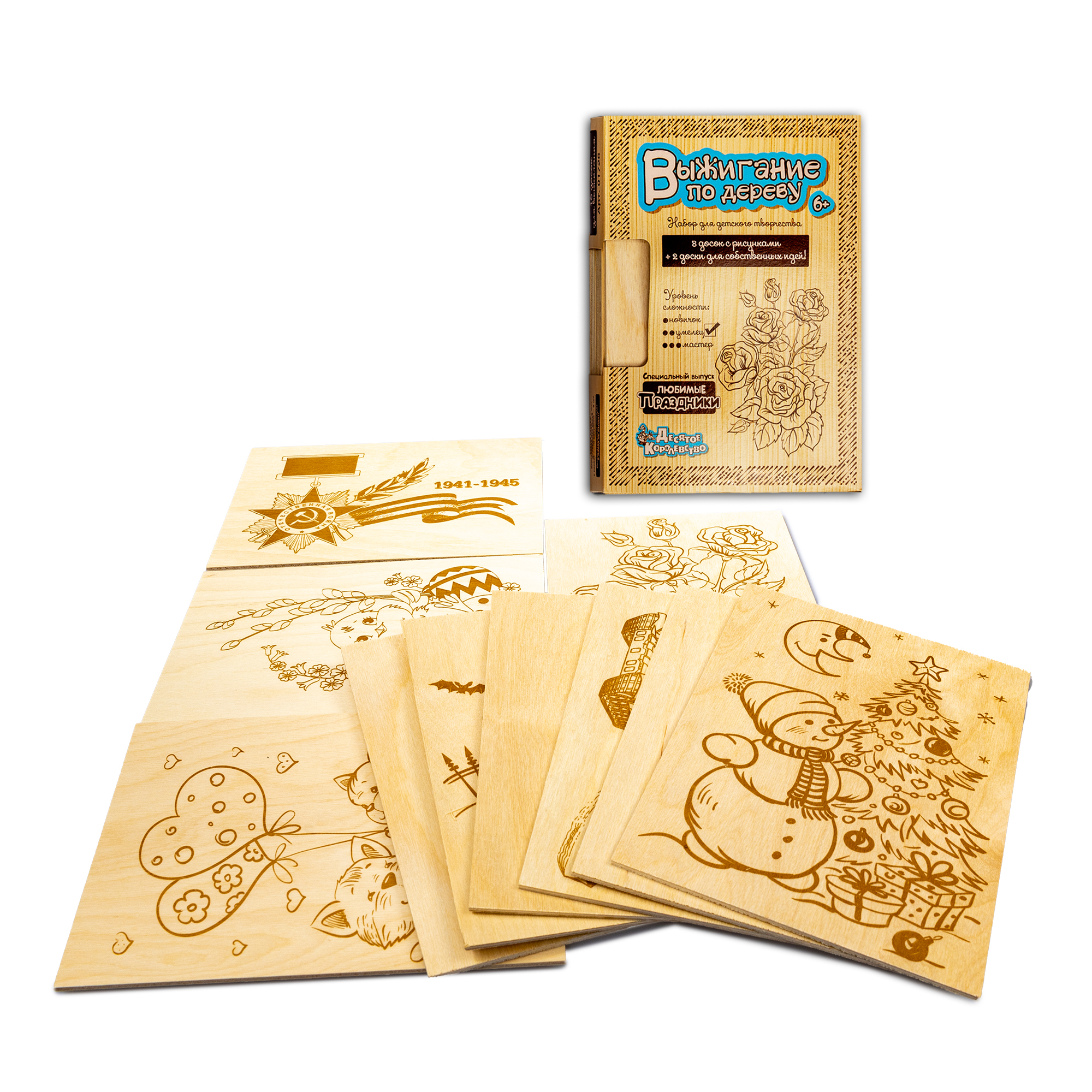 Что представляет из себя набор? Это десять кусков качественной сертифицированной фанеры размером 148 х 213 мм, на восемь из которых нанесены рисунки, посвященные различным событиям, в том числе нашим любимым праздникам. Причем нанесены они специальной немецкой краской, не выделяющей при сгорании (нагревании) вредных веществ. Две дощечки оставлены пустыми.